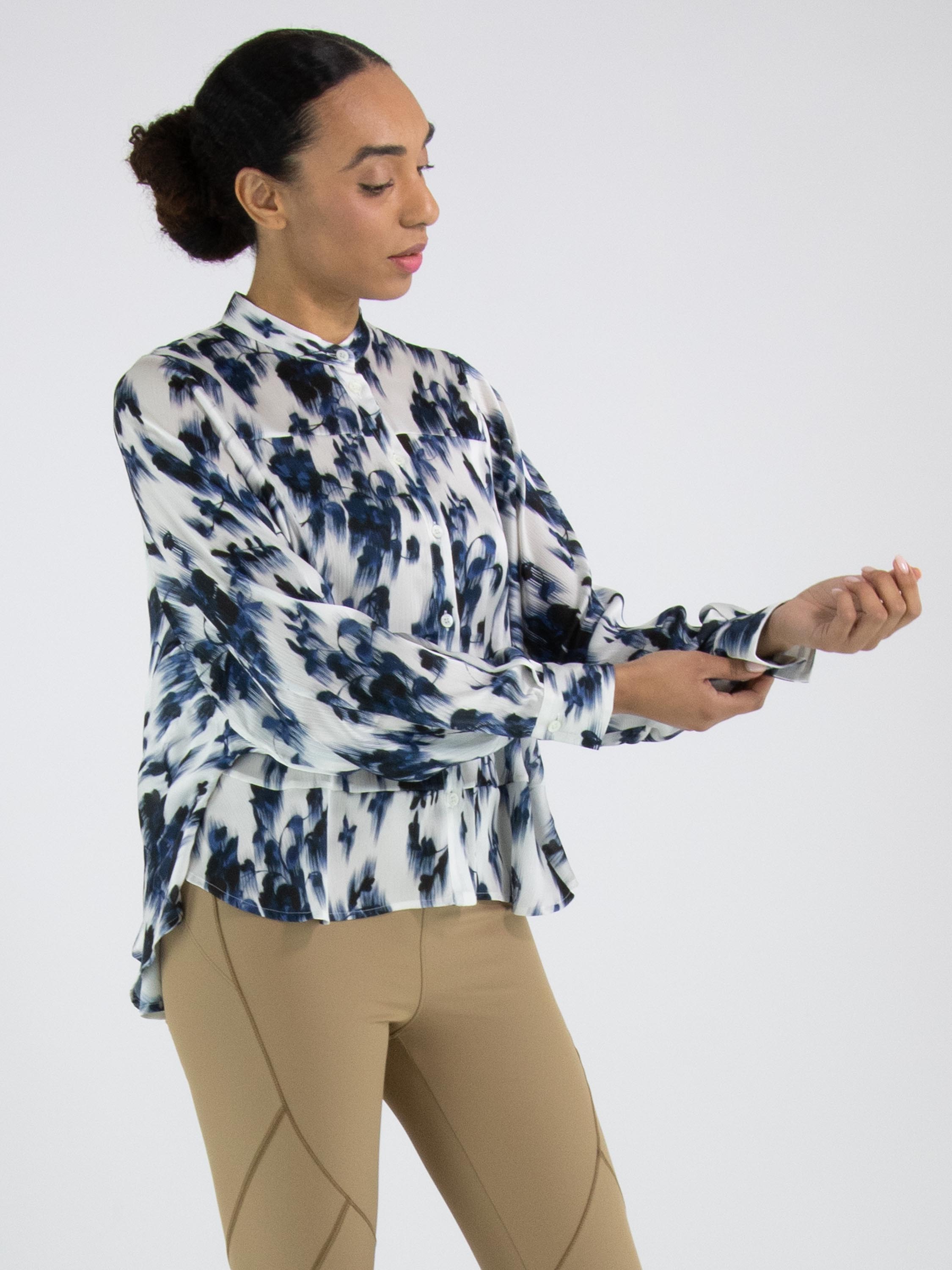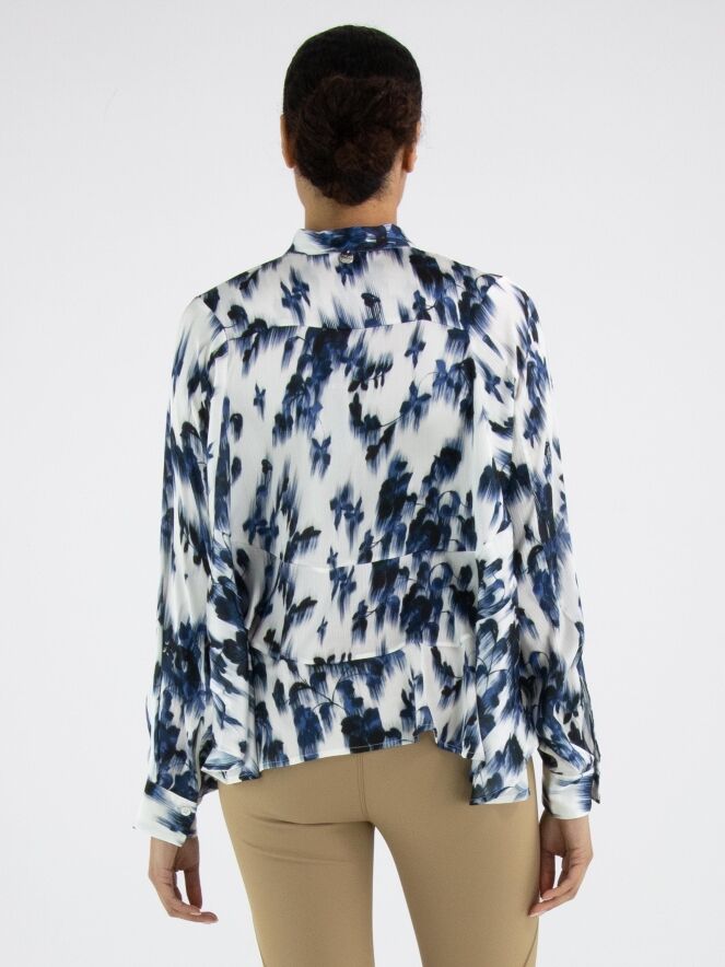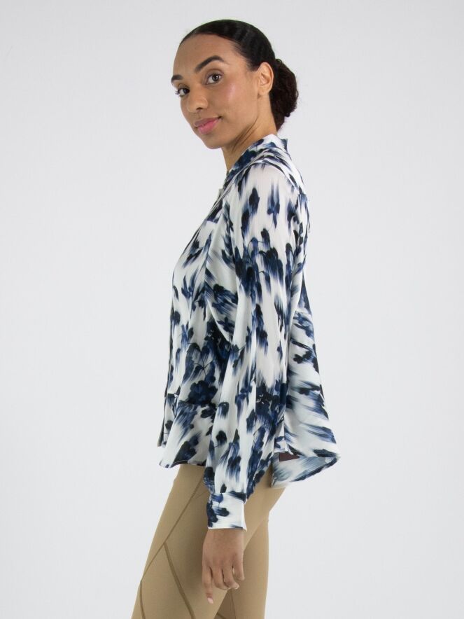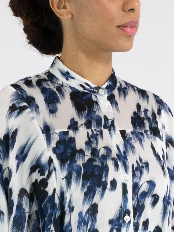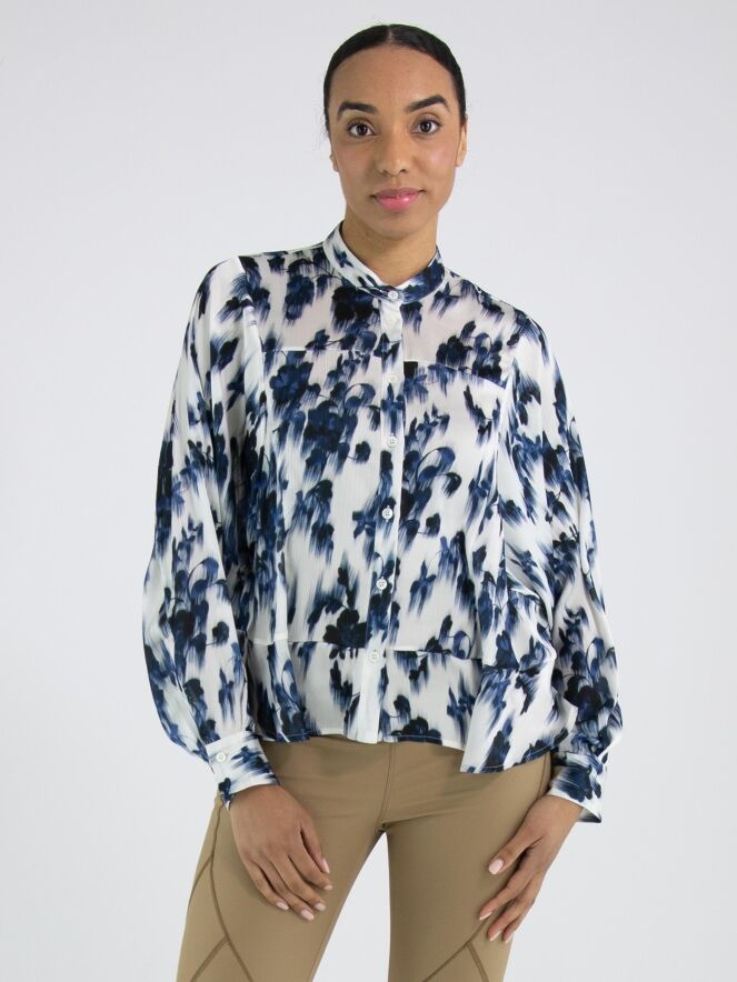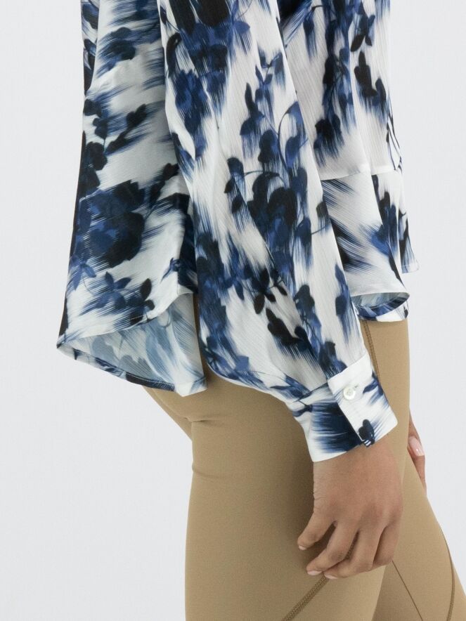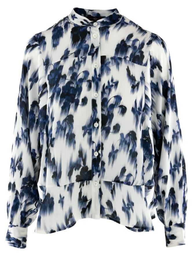 Een licht transparante blouse van High in een geveegde bloemenprint met meerdere tinten blauw en wit. De blouse heeft vleermuismouwen en boven de buste is een stiknaad. Aan de onderkant is een licht golvende boord. Deze blouse mag op de hand worden gewassen.