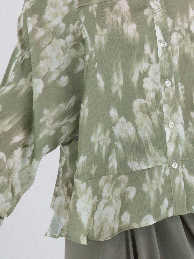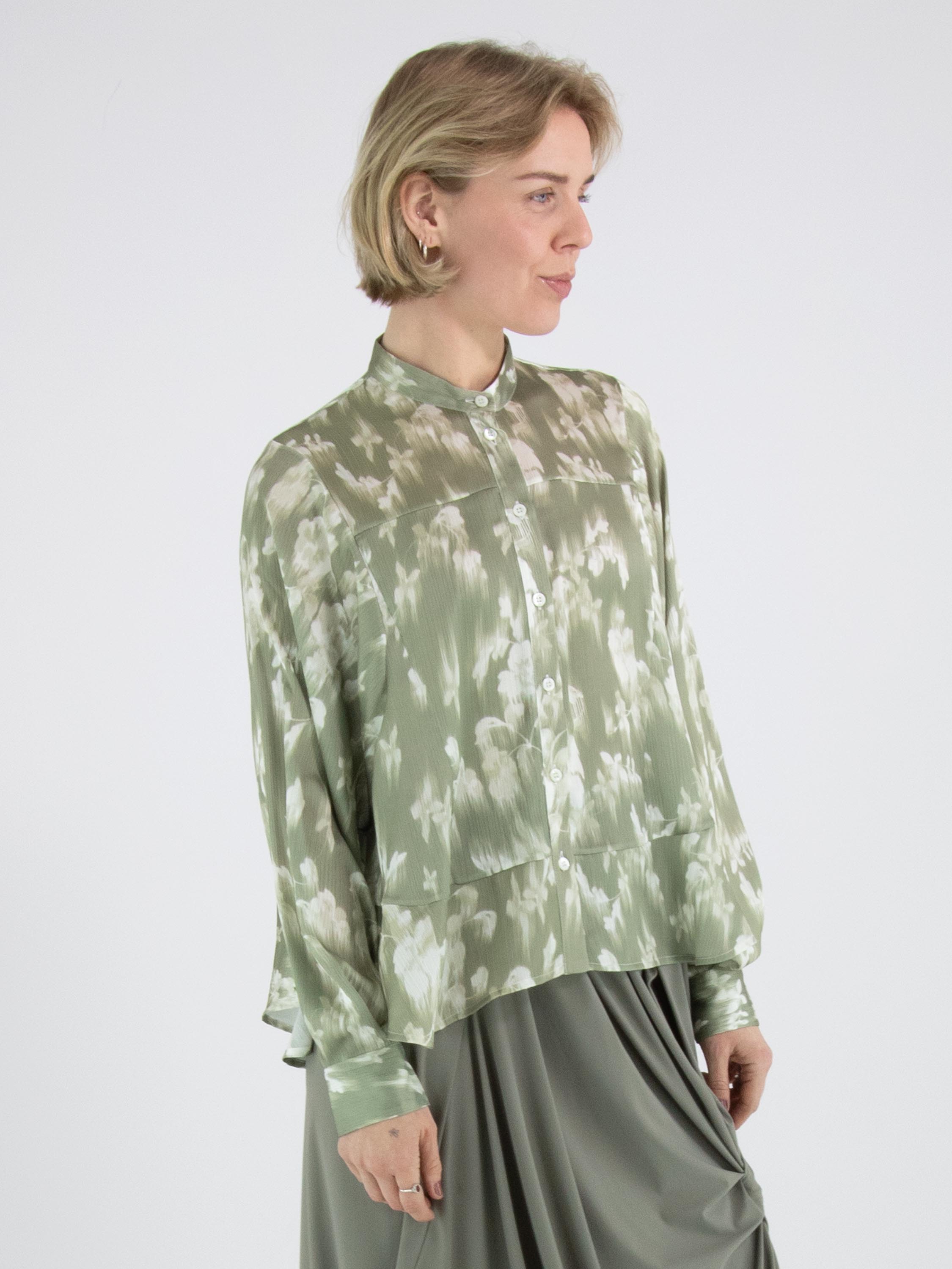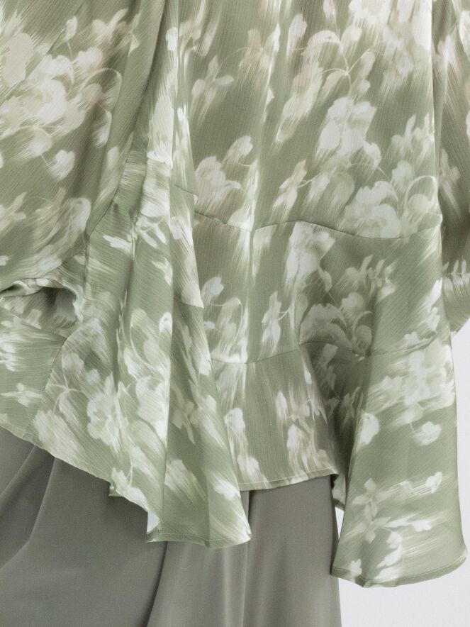 Een licht transparante blouse van High in een geveegde bloemenprint met meerdere tinten olijfgroen en wit. De blouse heeft vleermuismouwen en boven de buste is een stiknaad. Aan de onderkant is een licht golvende boord. Deze blouse mag op de hand worden gewassen.