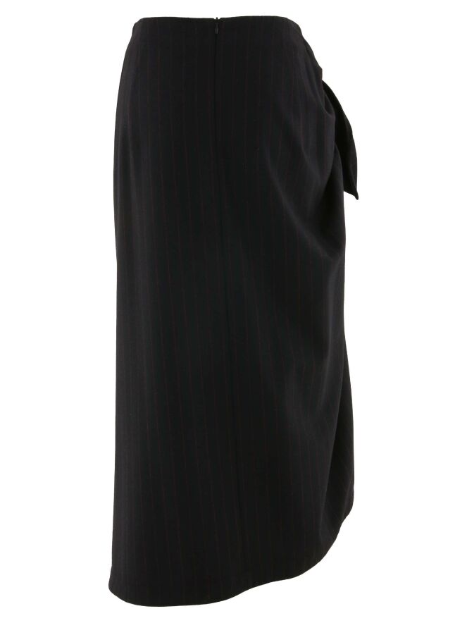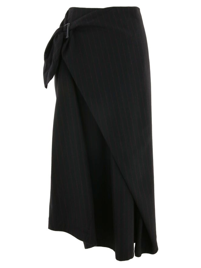 Een valse overslag rok van Heide Ost in een krijtstreep met de kleuren zwart en rood. In de taille is een decoratieve gesp waarmee de rok versteld kan worden. Deze rok mag op de hand worden gewassen.