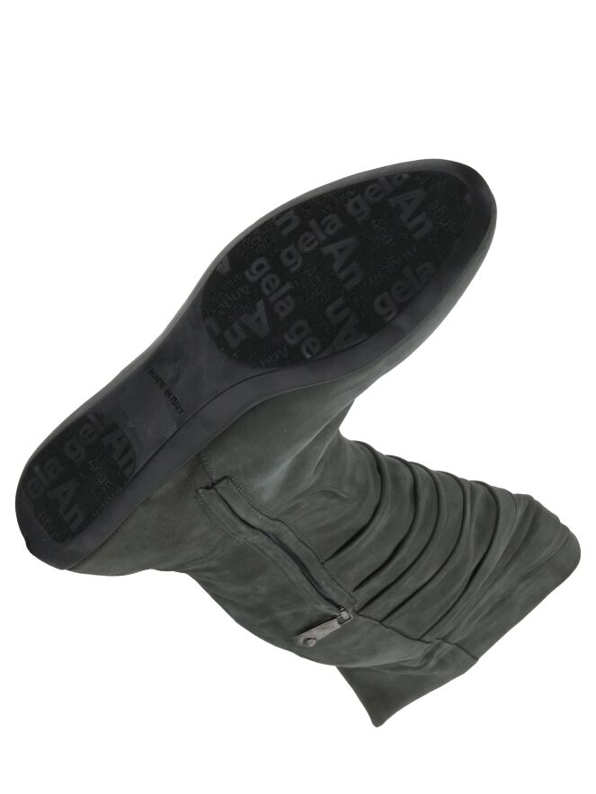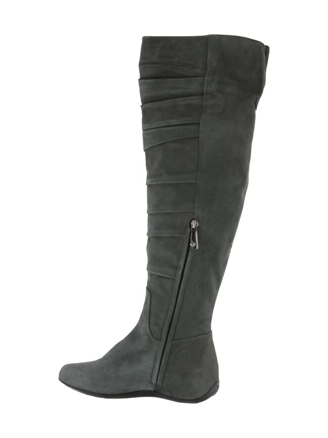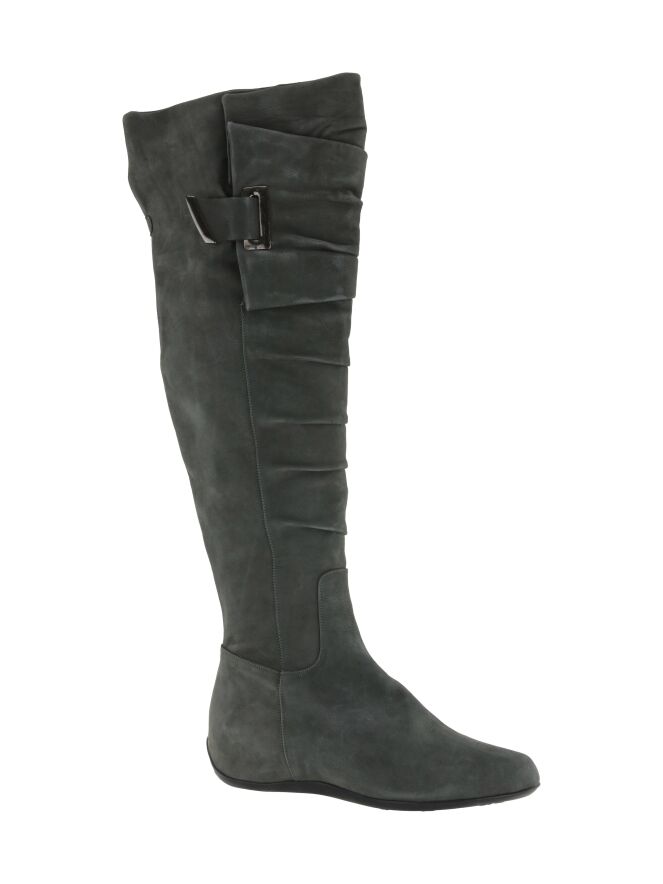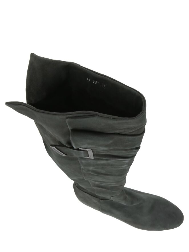Een kuiplaars in een grijze kleur van het merk Ital Trend. De laars is geplooid aan de voorzijde van de schacht en aan de binnenzijde van de laars is vanaf de voet tot halverwege de knie een rits ingezet. 10 cm onder de bovenzijde van de schacht is een nikkelen gesp. De hoogte van de schacht is 55 cm en de schachtbreedte is 42 cm.