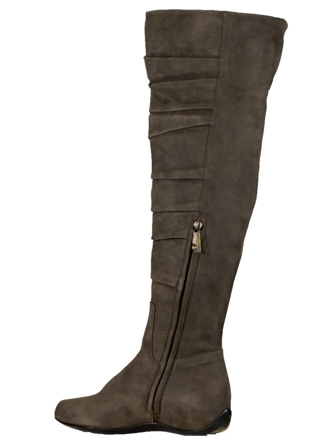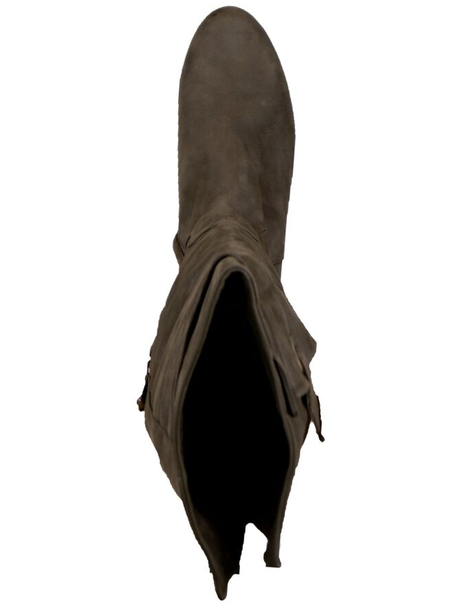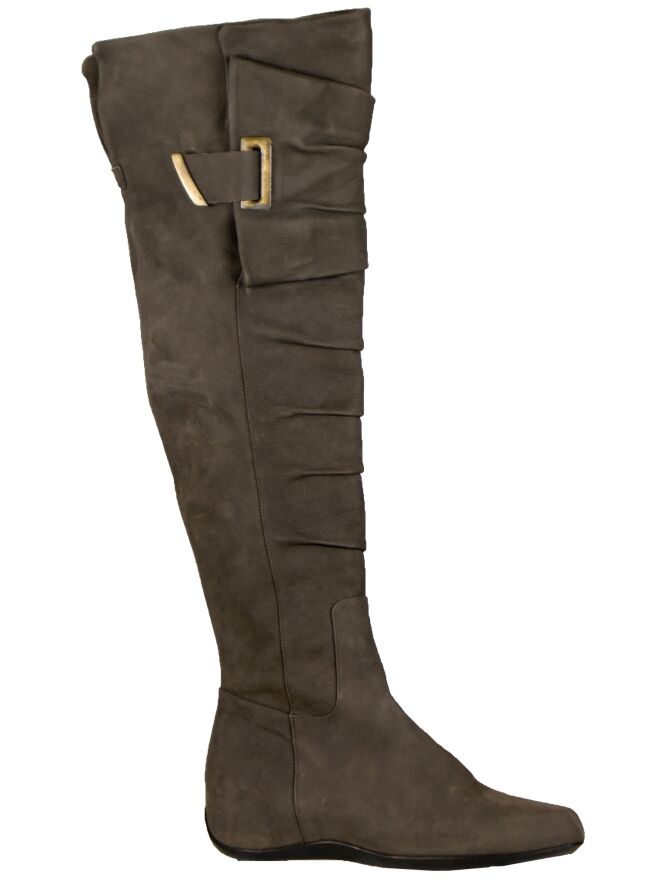 Een kuiplaars in een taupe kleur van het merk Ital Trend. De laars is geplooid aan de voorzijde van de schacht en aan de binnenzijde van de laars is vanaf de voet tot halverwege de knie een rits ingezet. 10 cm onder de bovenzijde van de schacht is een nikkelen gesp. De hoogte van de schacht is 55 cm en de schachtbreedte is 42 cm.