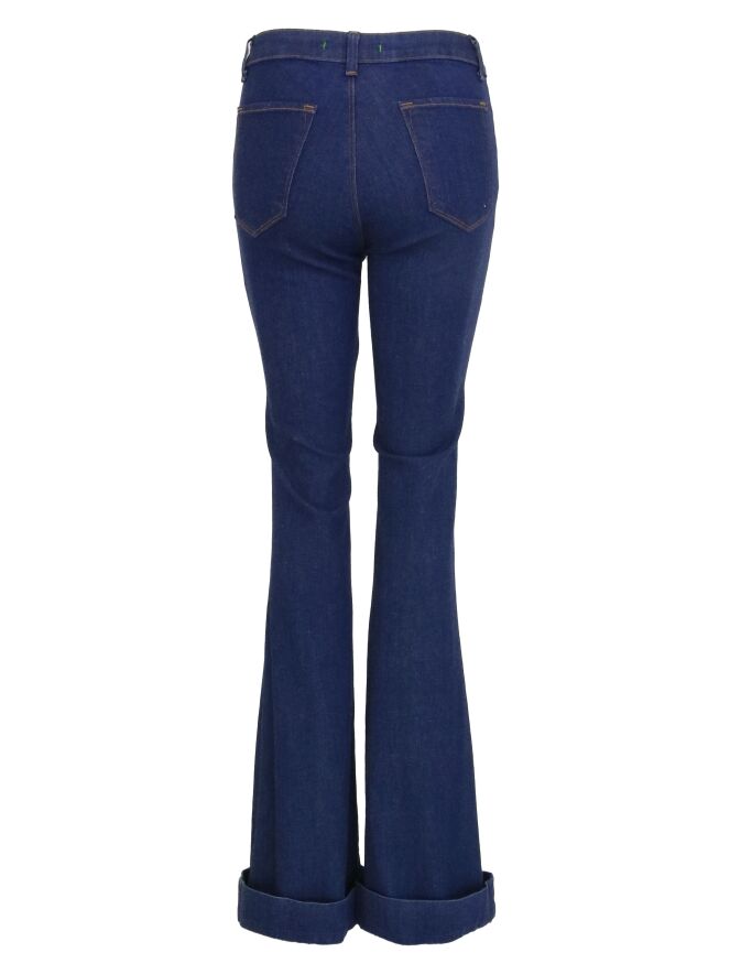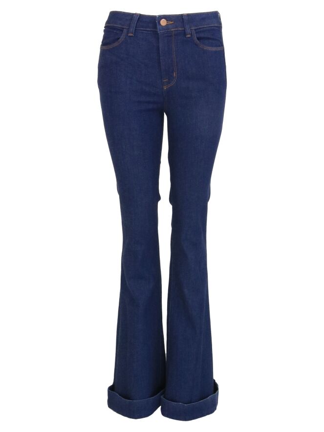 Een flared jeans van J. Brand in een jeans kleur. De jeans heeft cognac kleurige stiknaden en mag op 30 graden worden gewassen.