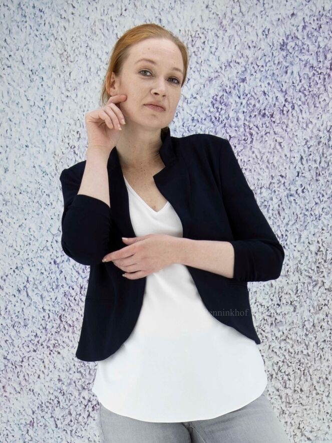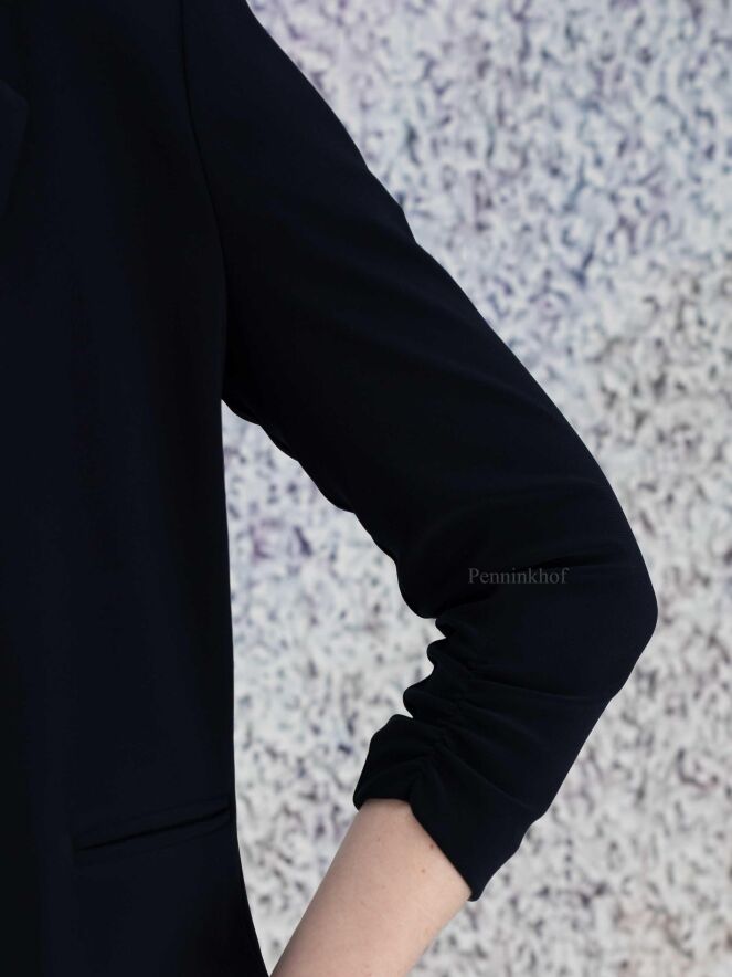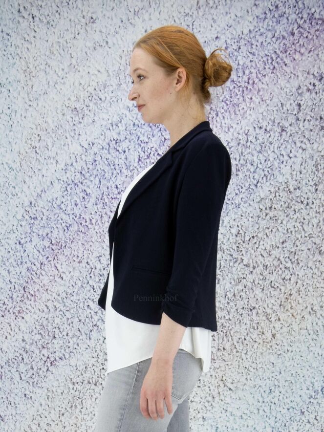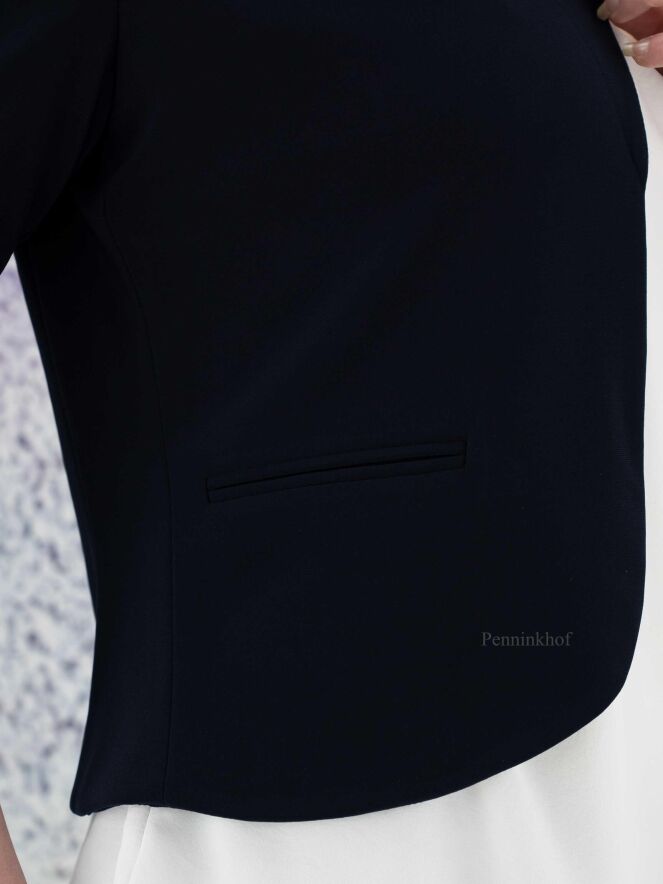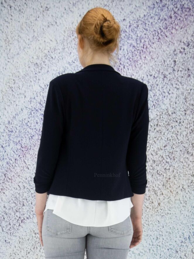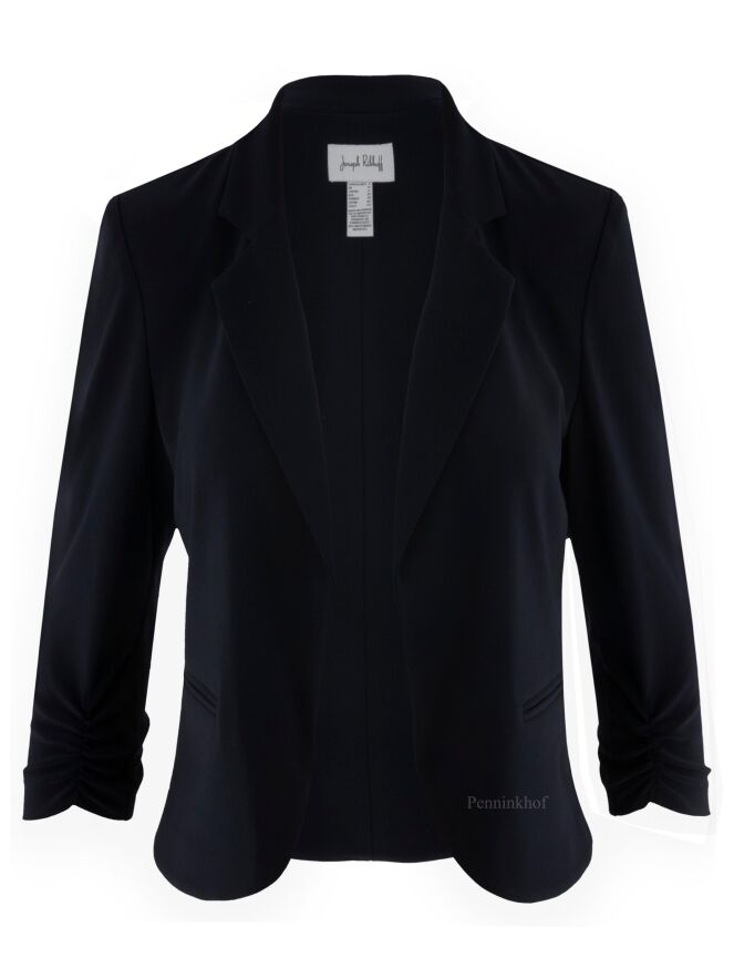 Een korte blazer van Joseph Ribkoff in een marineblauwe kleur. De blazer heeft een halflange mouw met aan het uiteinde fijne plooien op de stiknaad. De blazer heeft geen sluiting en mag op de hand worden gewassen.