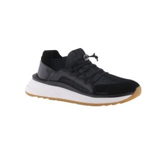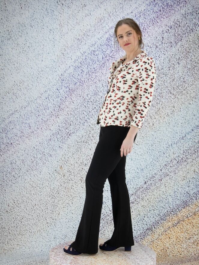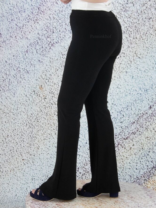 Een flared broek van Joseph Ribkoff in de kleur zwart. In de taille is een elastieken band. In het midden van de pijpen is een ingestreken plooi. Deze broek mag op de hand worden gewassen.