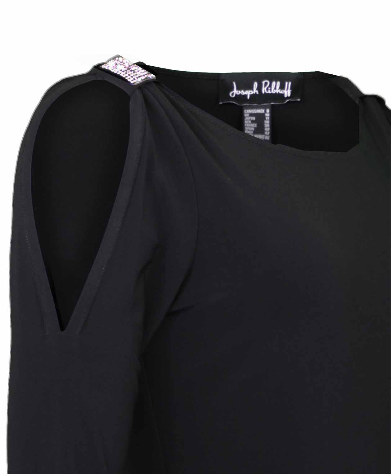 Een lang shirt van het merk Joseph Ribkoff in de kleur zwart. Aan beide zijden van de ronde hals is een decoratie van diamanten stras steentjes in de vorm van een vierkant. Vanuit de schouders hebben de mouwen een opening op de bovenarm. Dit shirt mag op de hand worden gewassen.