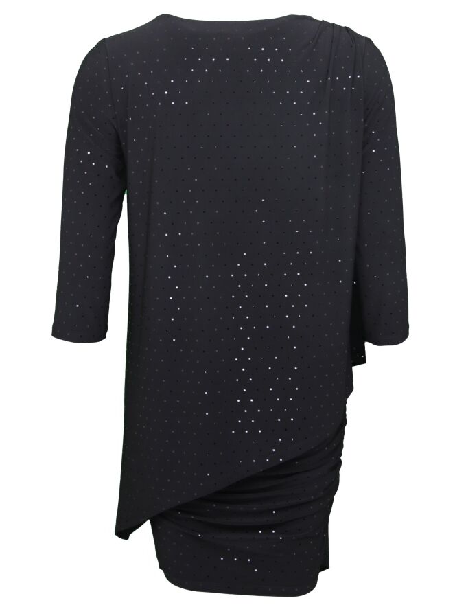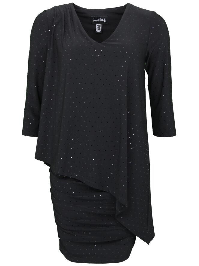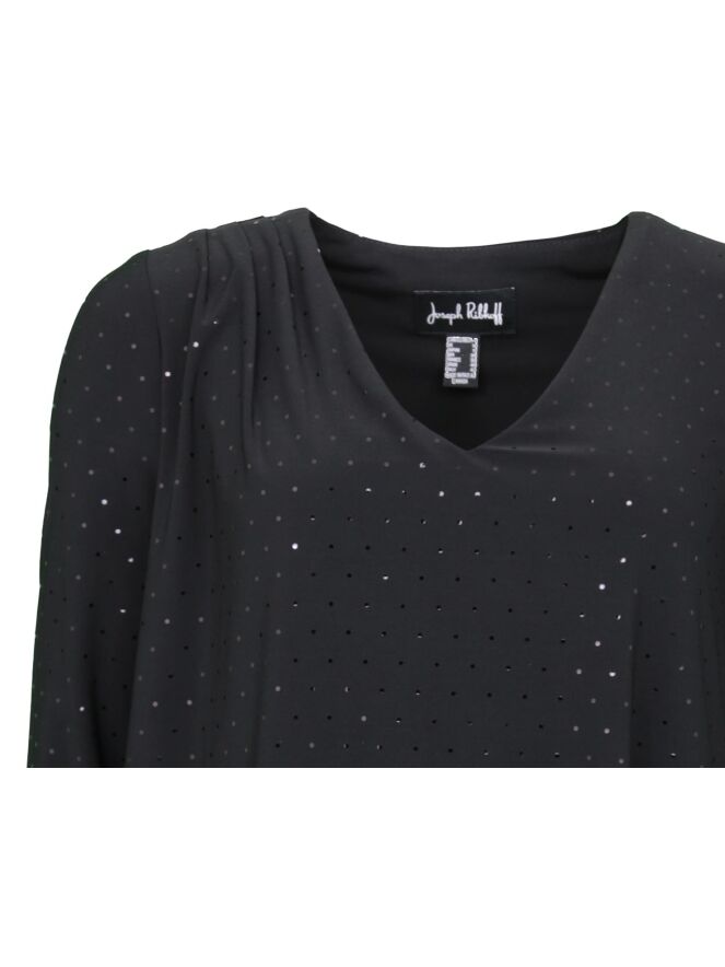 Een tuniek van het merk Joseph Ribkoff in de kleur zwart. Het tuniek is in 2 lagen waarvan de onderste laag 25 cm langer is en een drapeer effect heeft. In de stof zijn fijne ronde en glanzende stipjes verwerkt. Het tuniek heeft een V hals en half lange mouwen. Dit tuniek mag op de hand worden gewassen.
