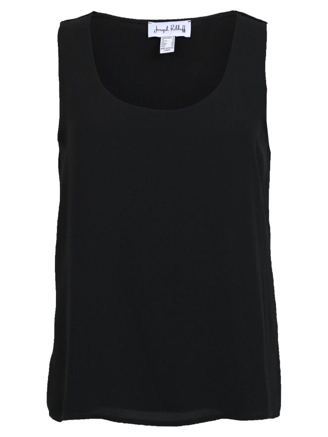 Een top van Joseph Ribkoff in de kleur zwart. De top heeft een diepe ronde hals en de voorkant heeft een dubbele stof. Deze top mag op de hand worden gewassen.