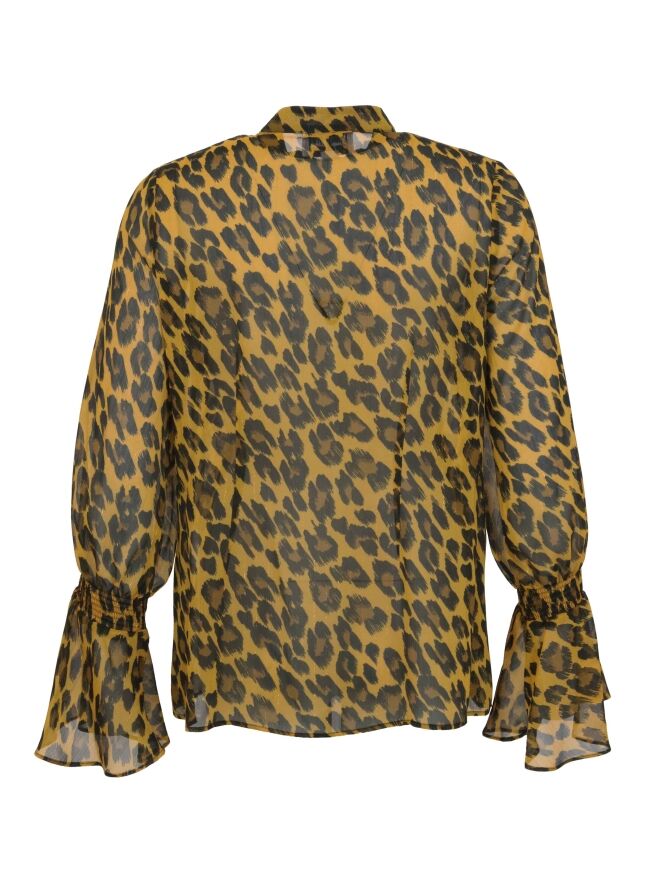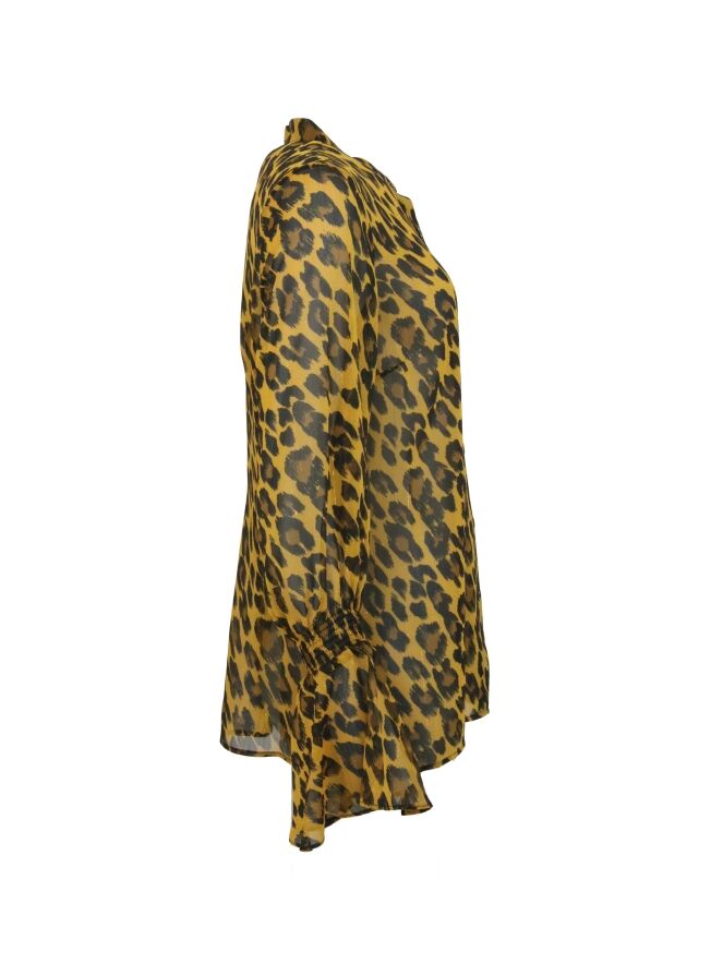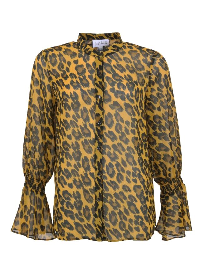 Een blouse van Joseph Ribkoff in een panterprint met de kleuren okergeel en zwart. Door de stof is een koperkleurige metaaldraad geweven. Aan de onderkant van de mouwen is een brede gesmokte en elastische band. Deze blouse mag op de hand worden gewassen.