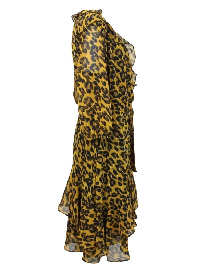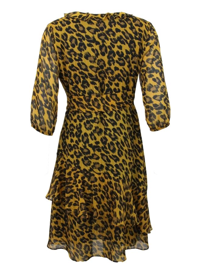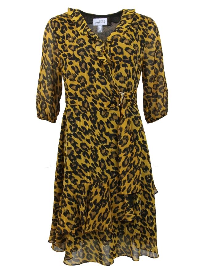 Een overslag jurk van Joseph Ribkoff in een panterprint met de kleuren okergeel en zwart. Langs de V - Hals is een folange. De rand van de korte mouwen heeft een elastieken bies. De ceintuur die vanuit de overslag langs de linker kant gaat, heeft een rechthoekige goud kleurige gesp. De jurk is gevoerd en mag op de hand worden gewassen.