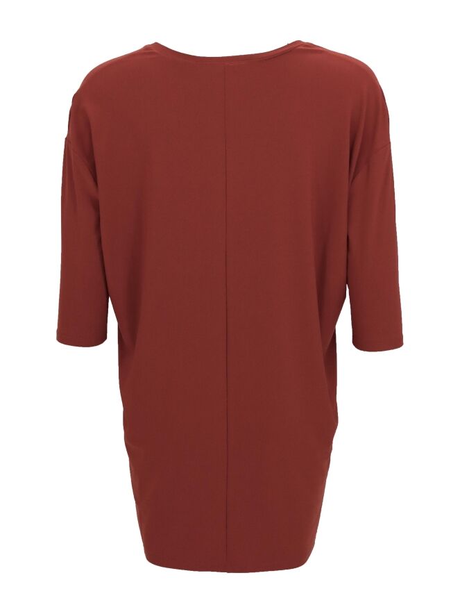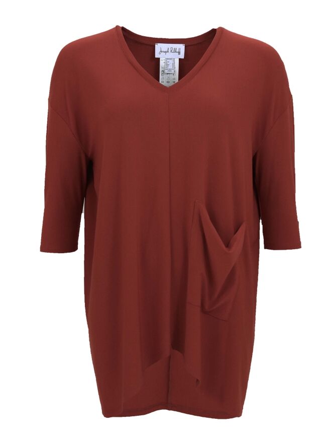 Een shirt van Joseph Ribkoff in een roestbruine kleur. Het shirt heeft korte mouwen en een V - Hals. Ter hoogte van de taille is een decoratieve zak aan de linker zijde. Dit shirt mag op de hand worden gewassen.