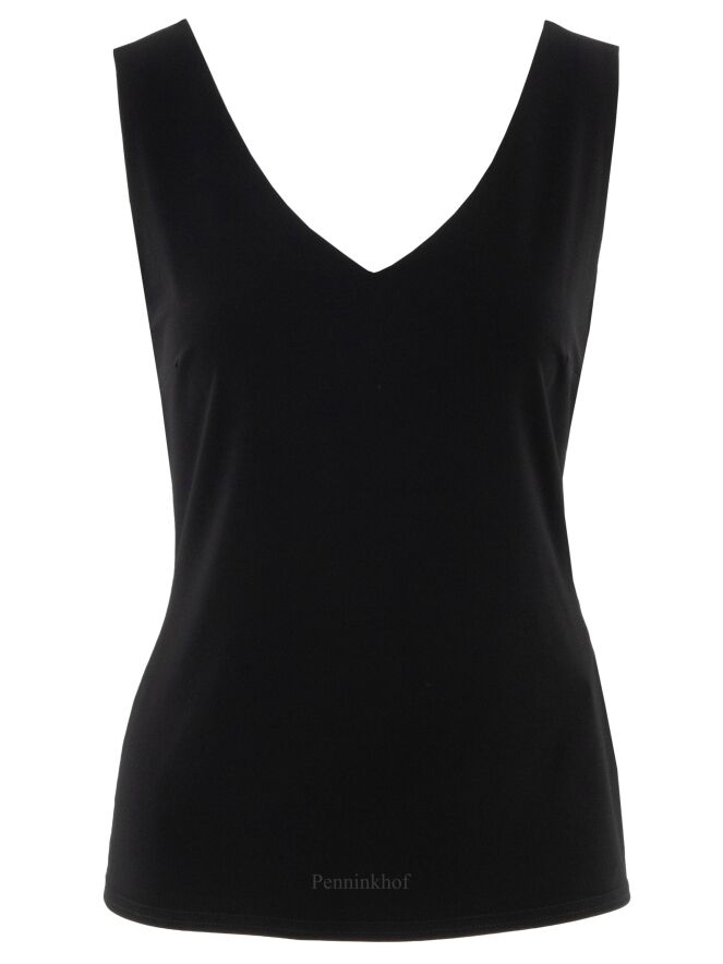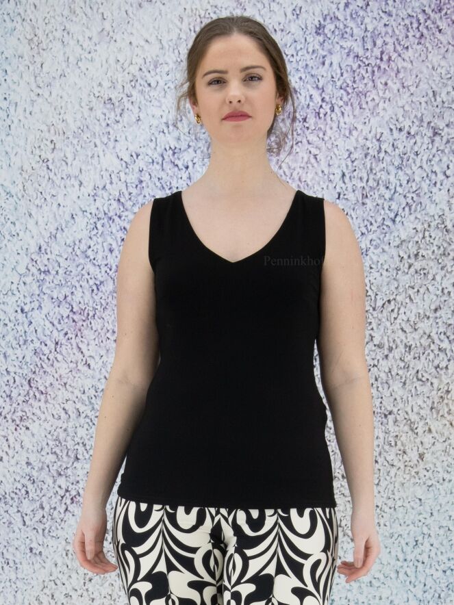 Een basis top van Joseph Ribkoff in de kleur zwart. De top heeft aan de voor - en achterkant een V - Hals. De schouderbandjes zijn 5 cm breed. Deze top mag op de hand worden gewassen.