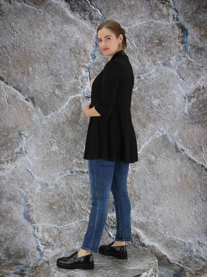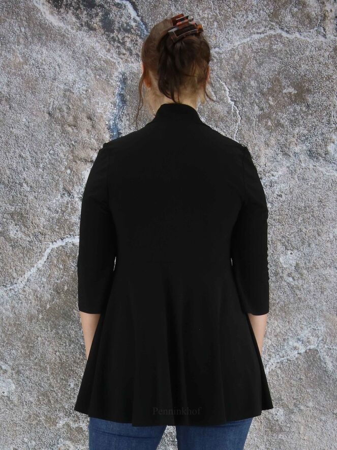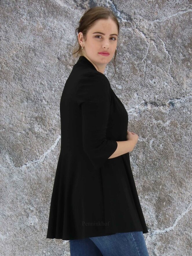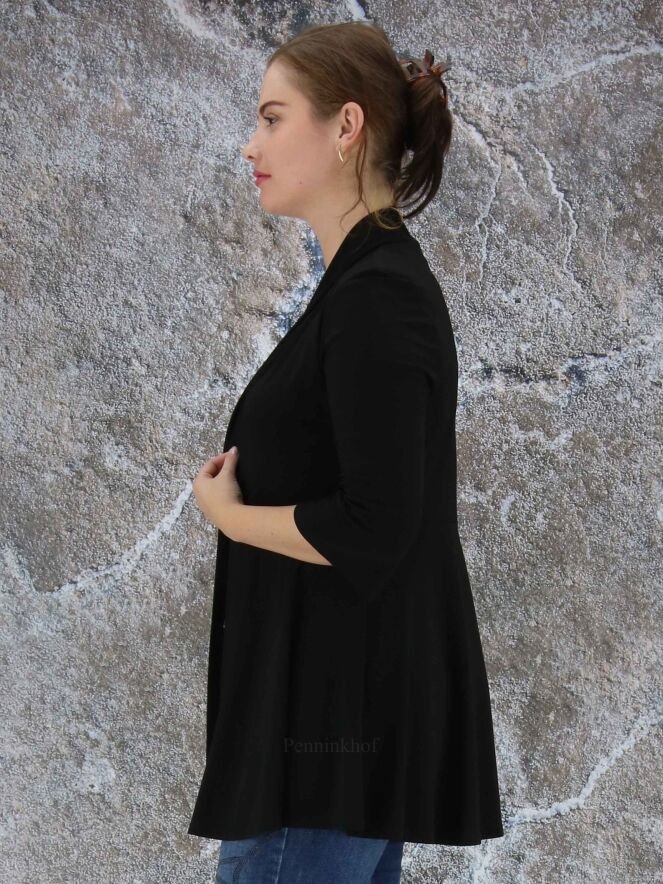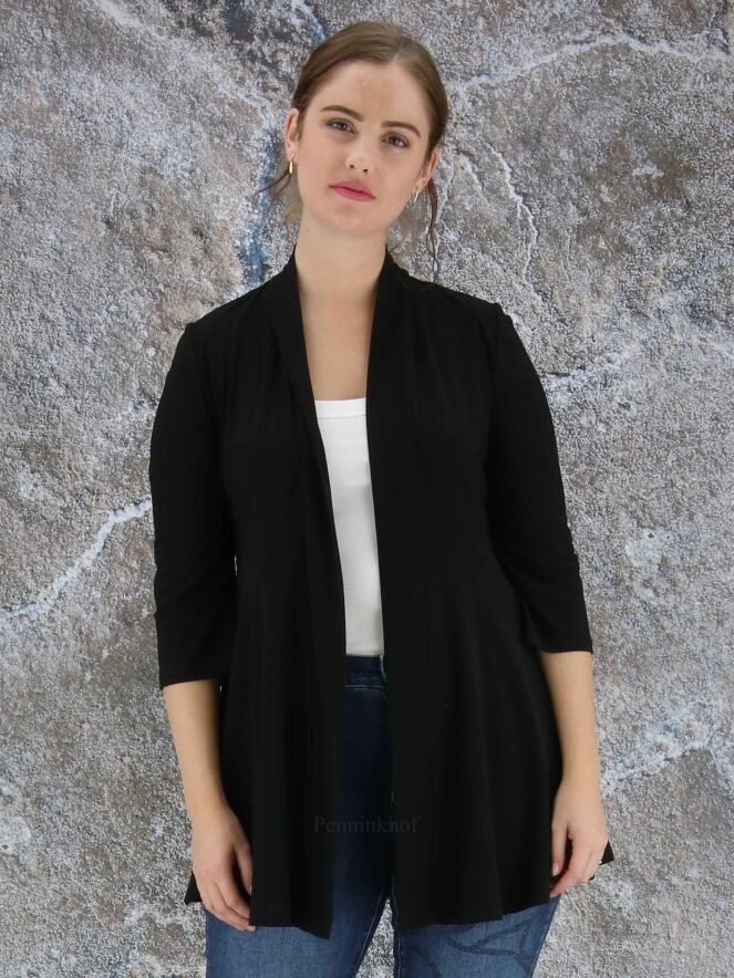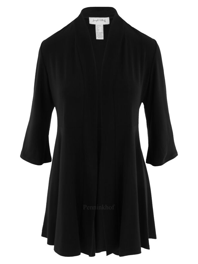 Een vest van Joseph Ribkoff in de kleur zwart. In de taille is aan de achterkant een taillenaad. Het vest heeft een shawlkraag, halflange mouwen en geen sluiting. Dit vest mag op de hand worden gewassen.