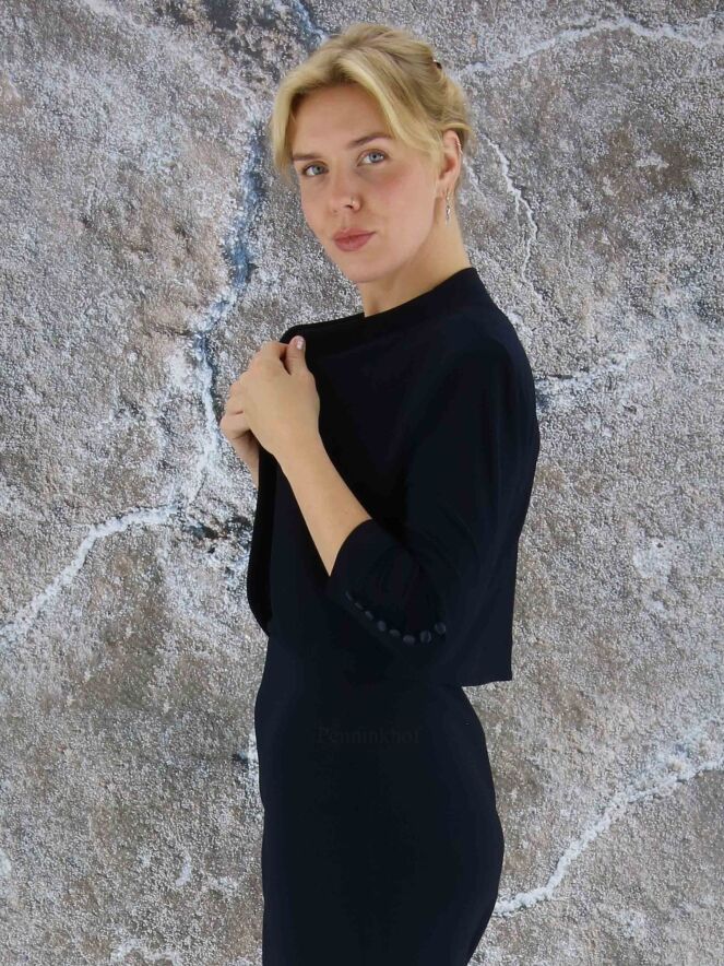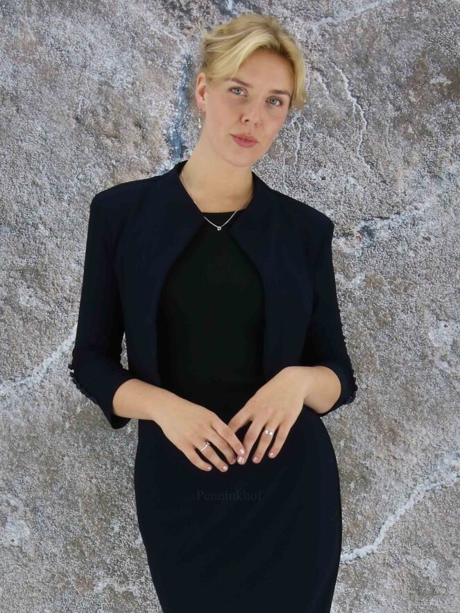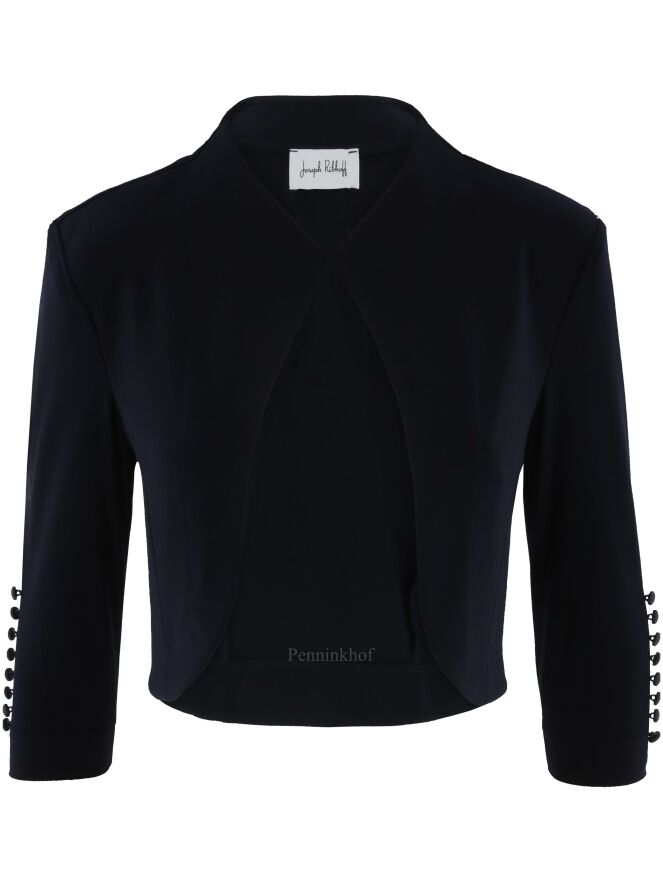 Een bolero blazer van het merk Joseph Ribkoff in de kleur marine blauw. De halflange mouwen hebben een rij van 8 fijn satijnen manchetknopen. Deze bolero mag op de hand worden gewassen.