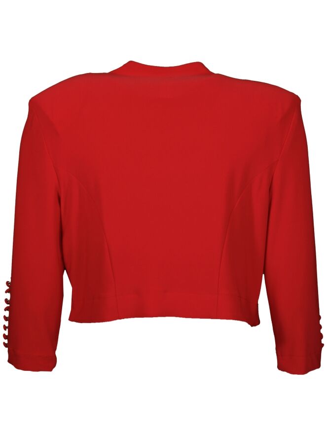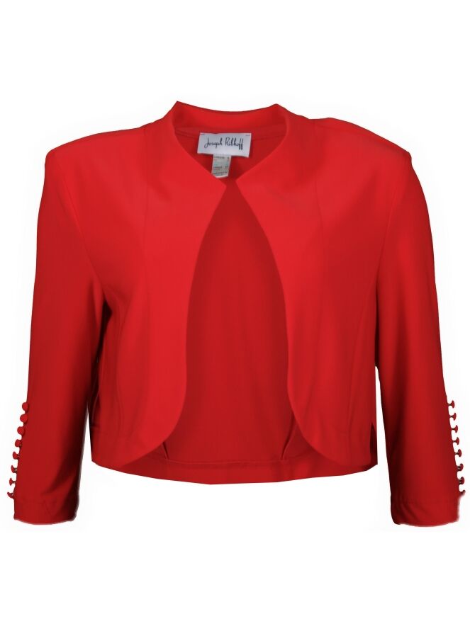 Een bolero blazer van het merk Joseph Ribkoff in de kleur rood. De halflange mouwen hebben een rij van 8 fijn satijnen manchetknopen. Deze bolero mag op de hand worden gewassen.