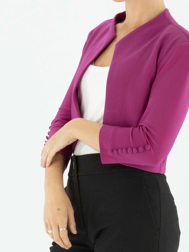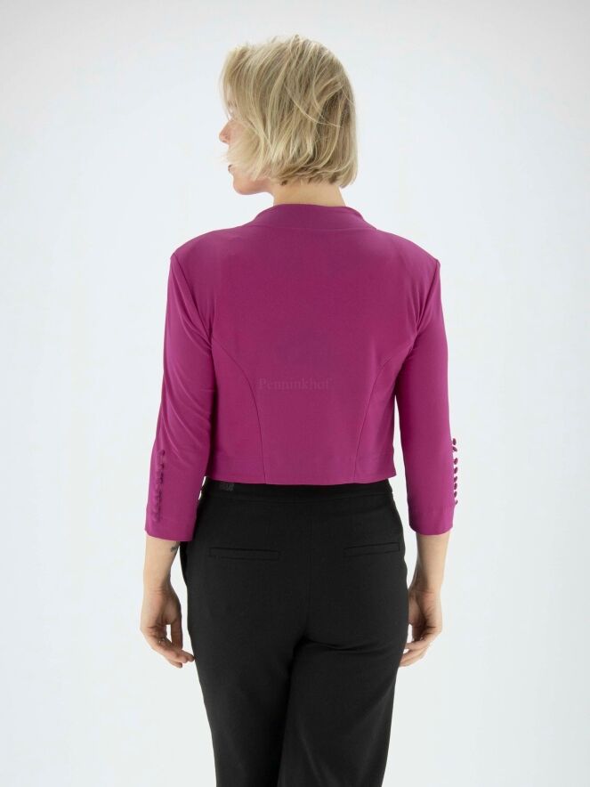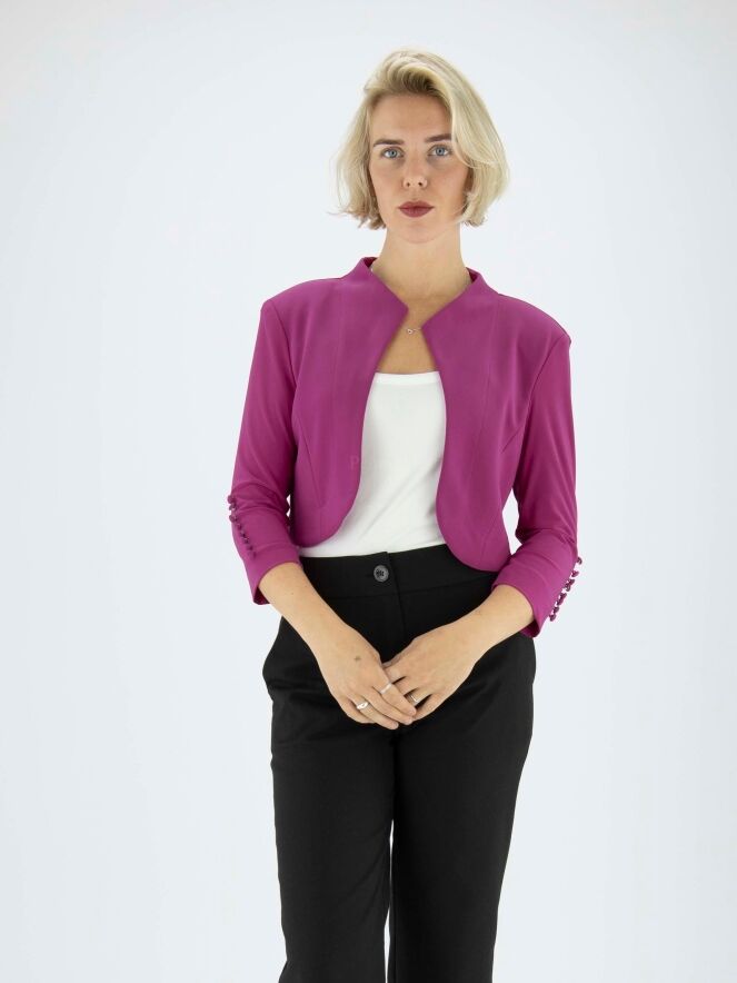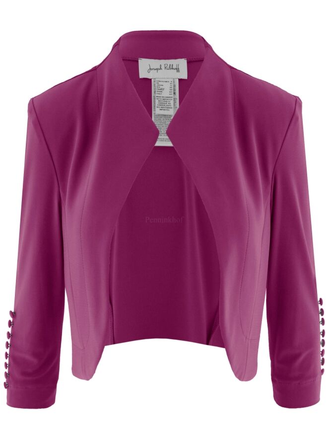 Een bolero blazer van het merk Joseph Ribkoff in de kleur fuchsia. De halflange mouwen hebben een rij van 8 fijn satijnen manchetknopen. Deze bolero mag op de hand worden gewassen.
