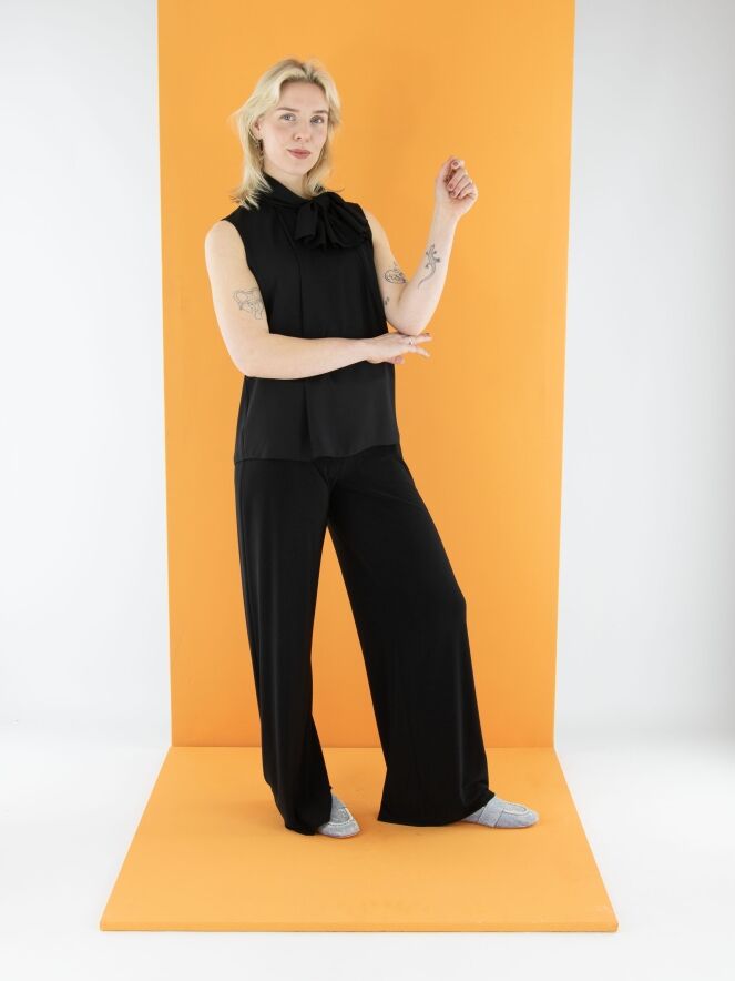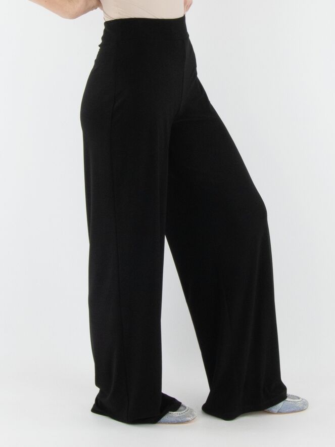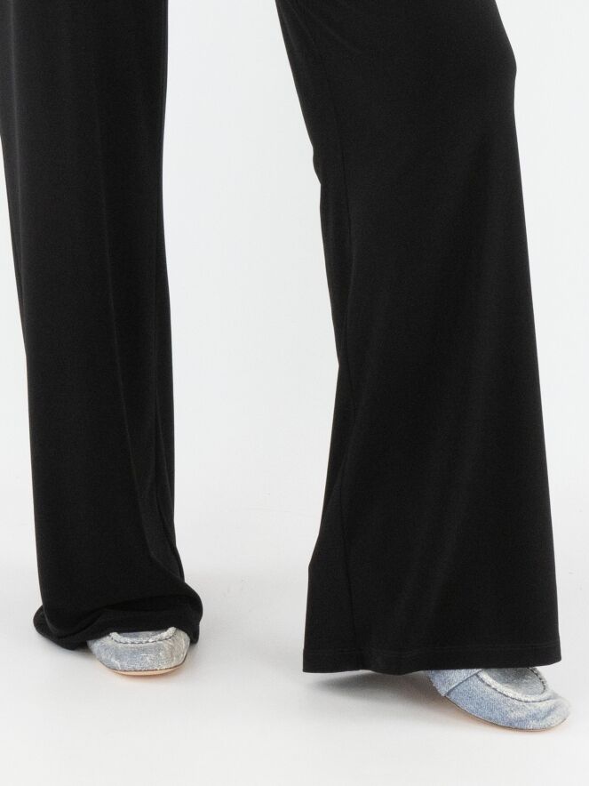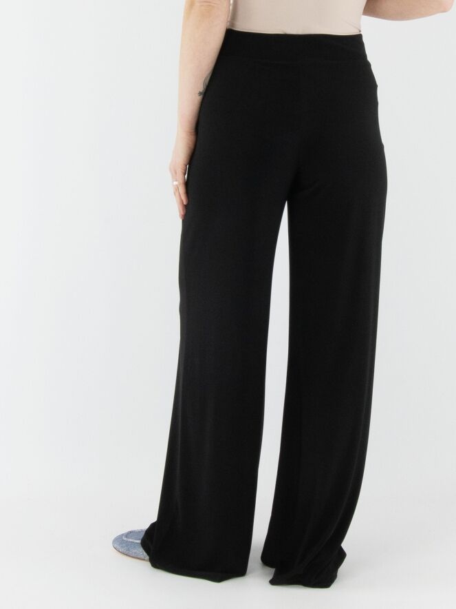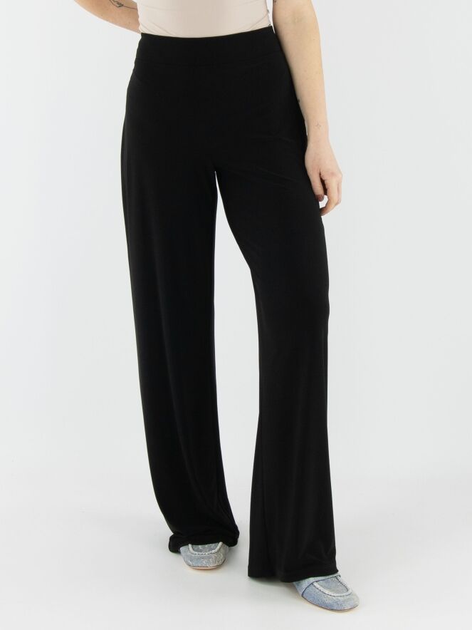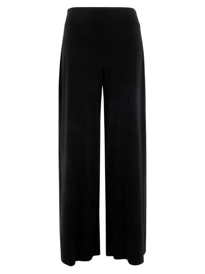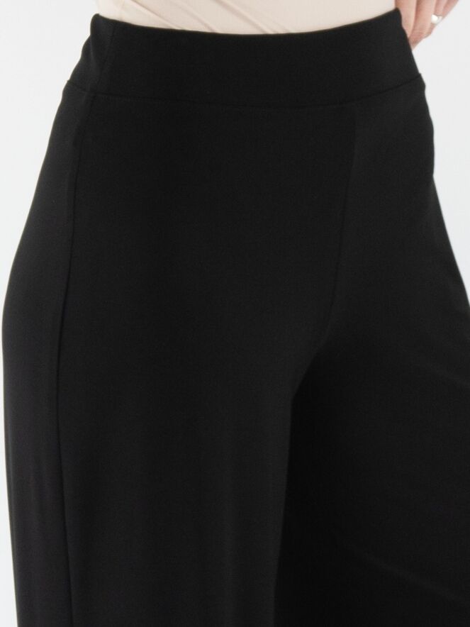 Een pantalon met een rechtvallende pijp van het merk Joseph Ribkoff in de kleur zwart. In de taille is een elastieken band. Deze broek mag op de hand worden gewassen.