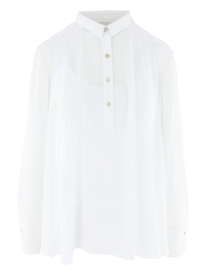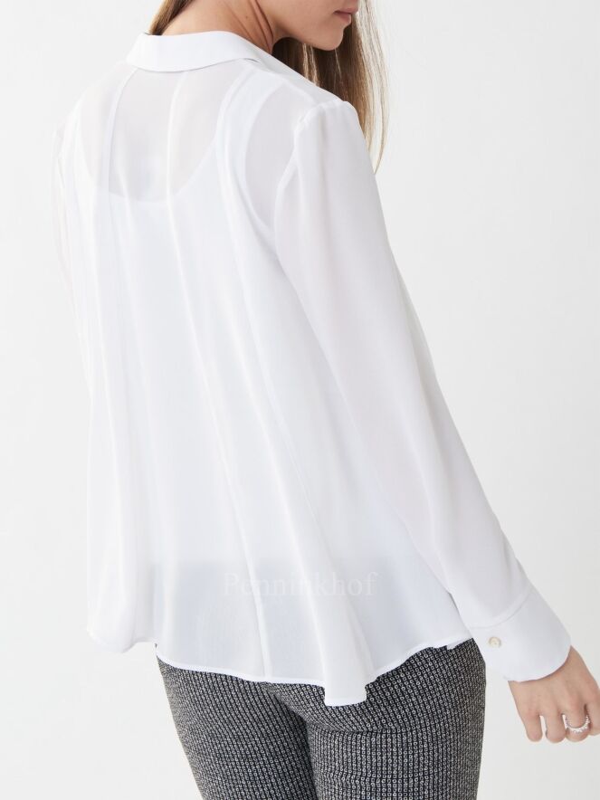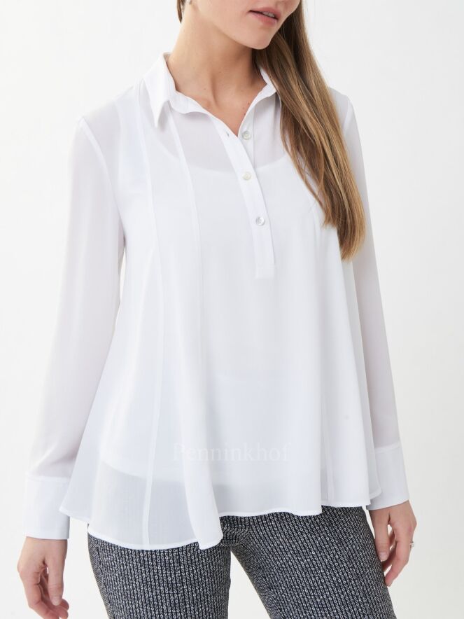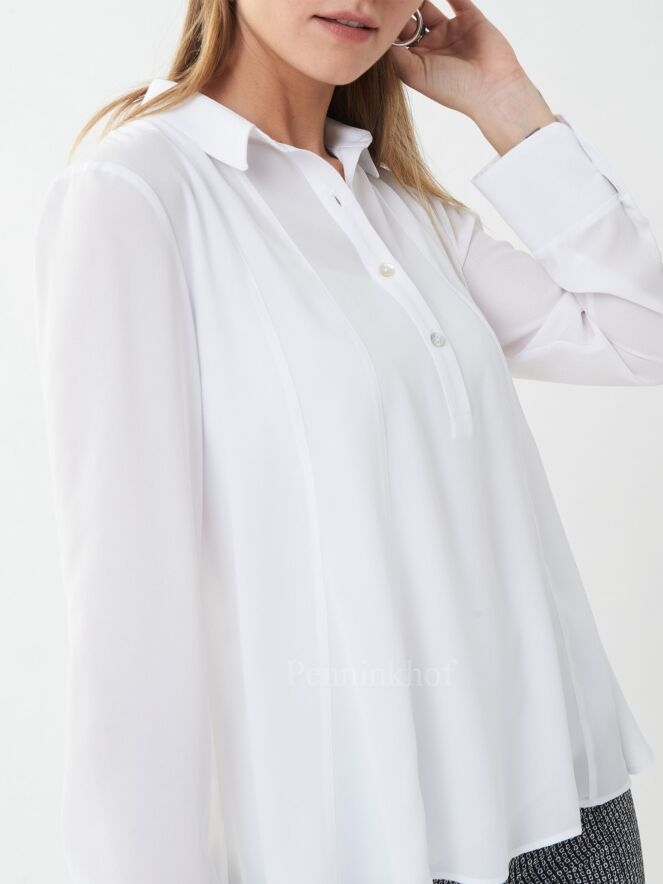 Een blouse van Joseph Ribkoff in de kleur wit. De blouse heeft een polo sluiting en heeft een A - Lijn. Deze blouse mag op de hand worden gewassen.