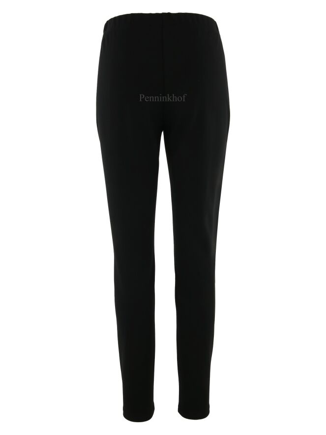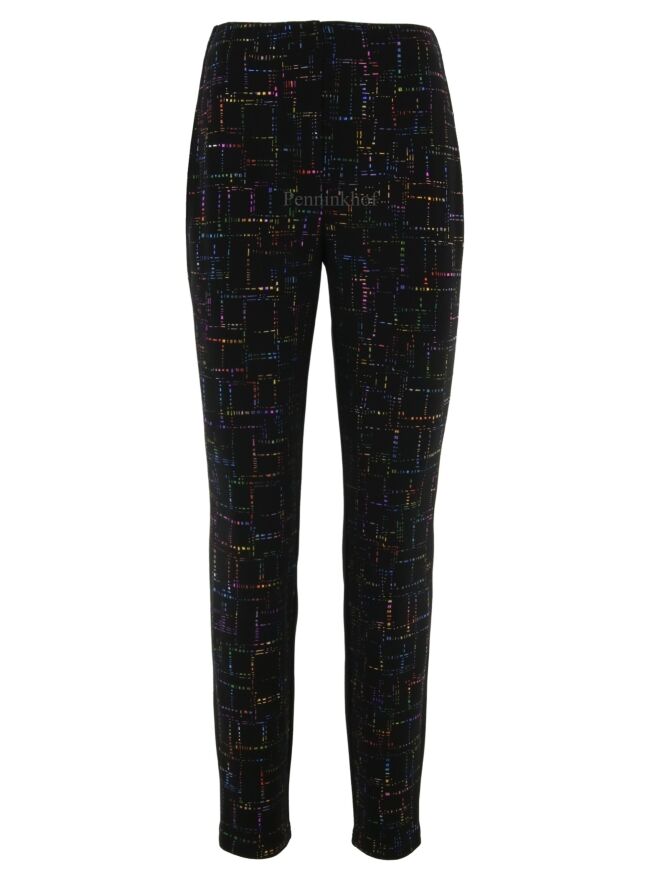 Een broek van Joseph Ribkoff in een grafische reliëf print met meerdere kleuren met gliiter details op een zwarte achtergrond. In de taille is een elastieken band. Deze broek mag op de hand worden gewassen.