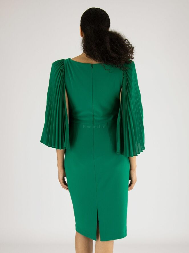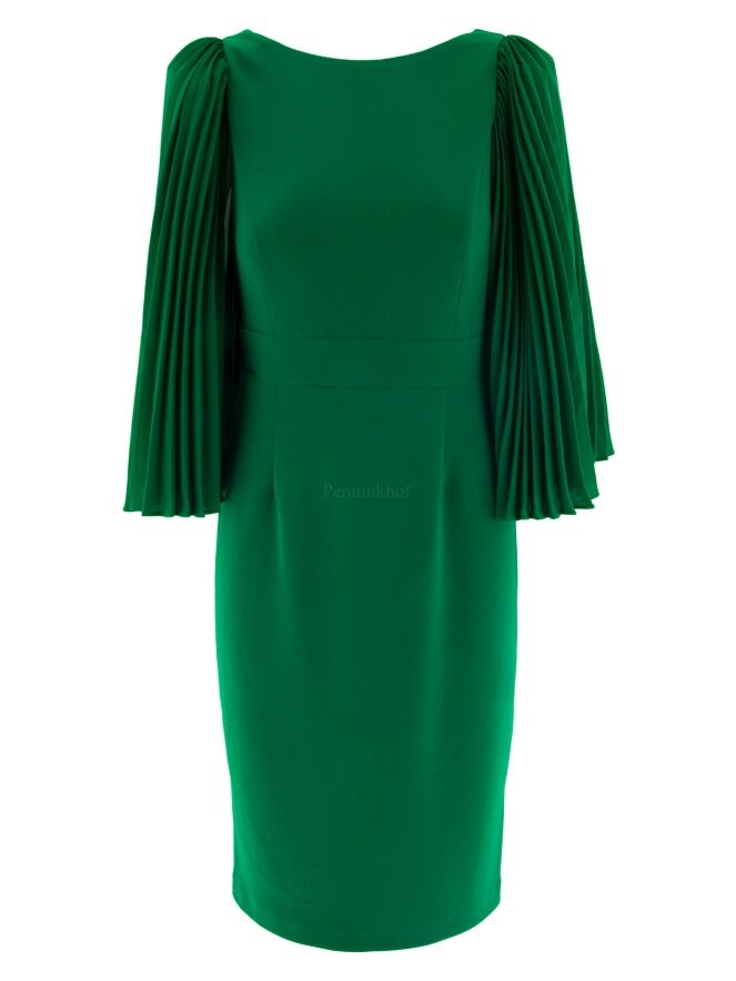 Een jurk van Joseph Ribkoff in de kleur groen. De jurk heeft halflange geplisseerde vleermuismouwen die aan de onderkant open zijn. In de taille is een dubbele taillenaad. Deze jurk mag op de hand worden gewassen.