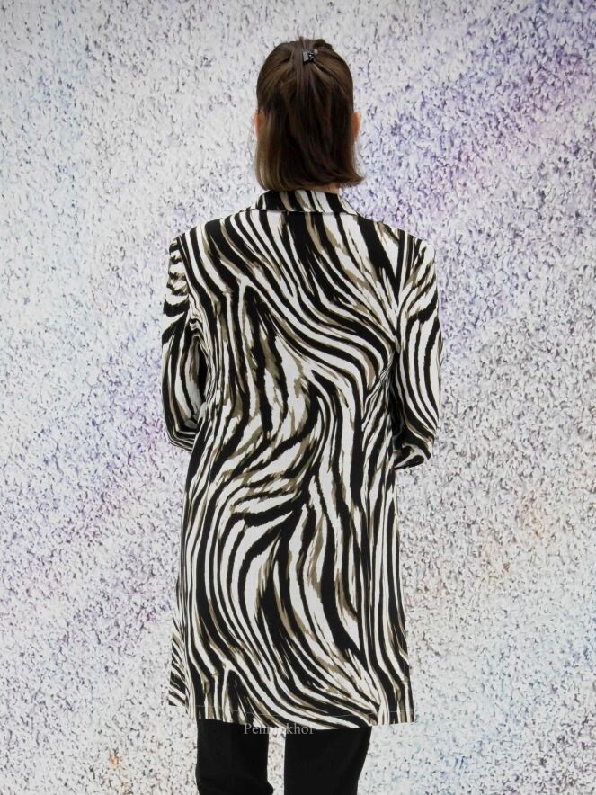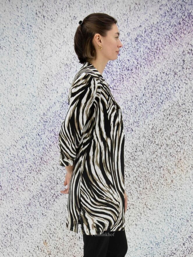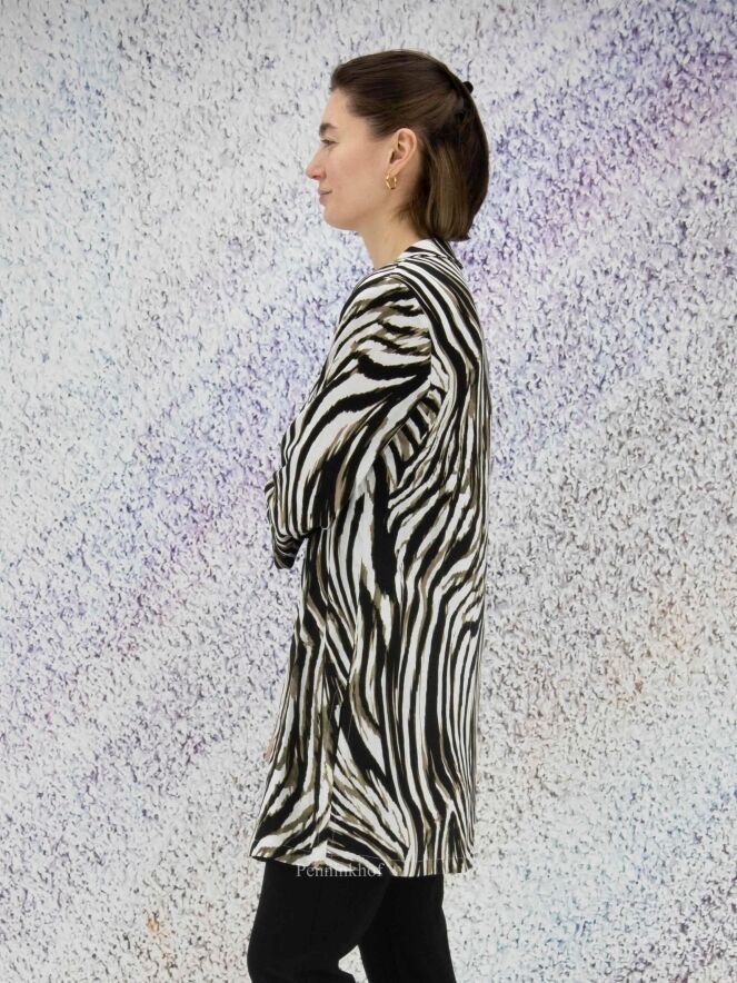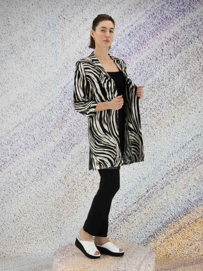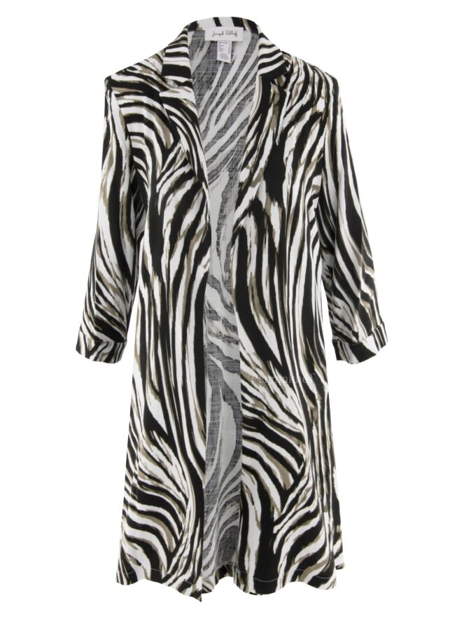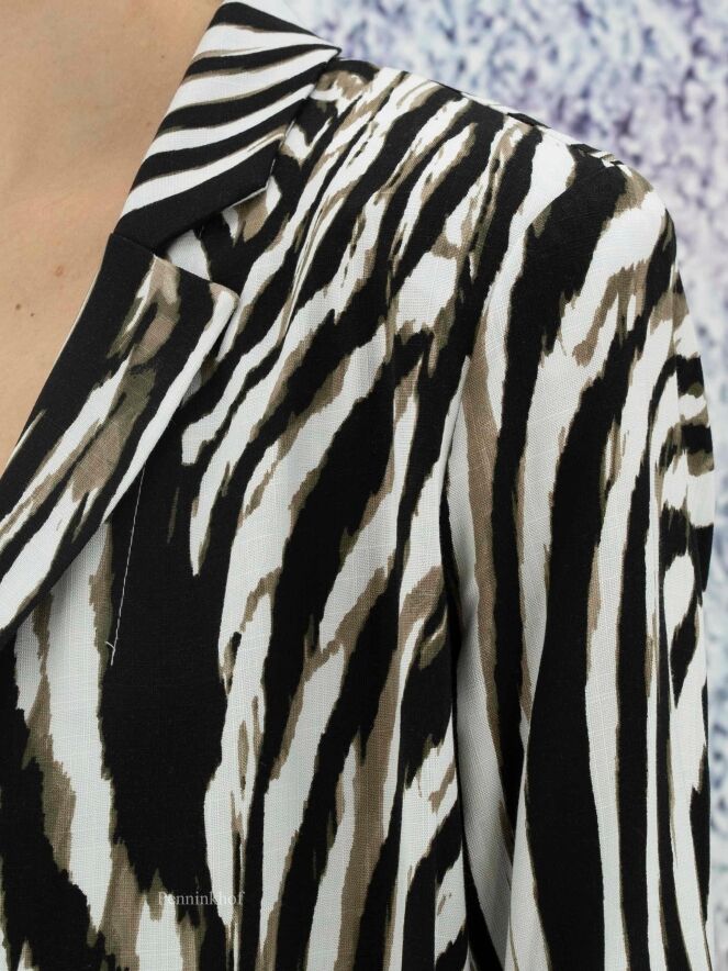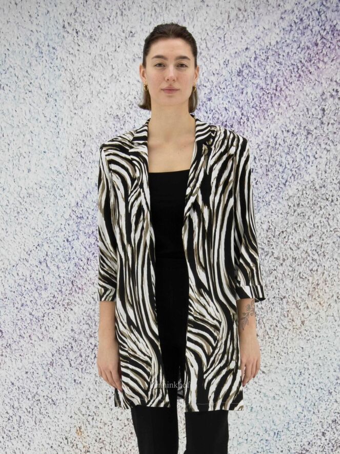 Een blazer van Joseph Ribkoff in een zebra print met de kleuren olijfgroen, zwart en wit. De blazer heeft geen sluiting en heeft halflange mouwen. Deze blazer mag op de hand worden gewassen.