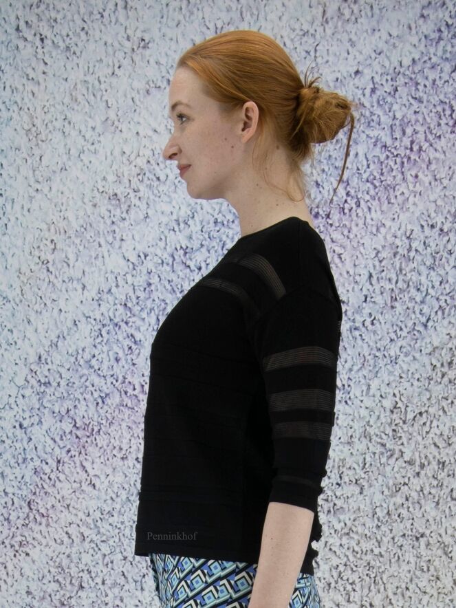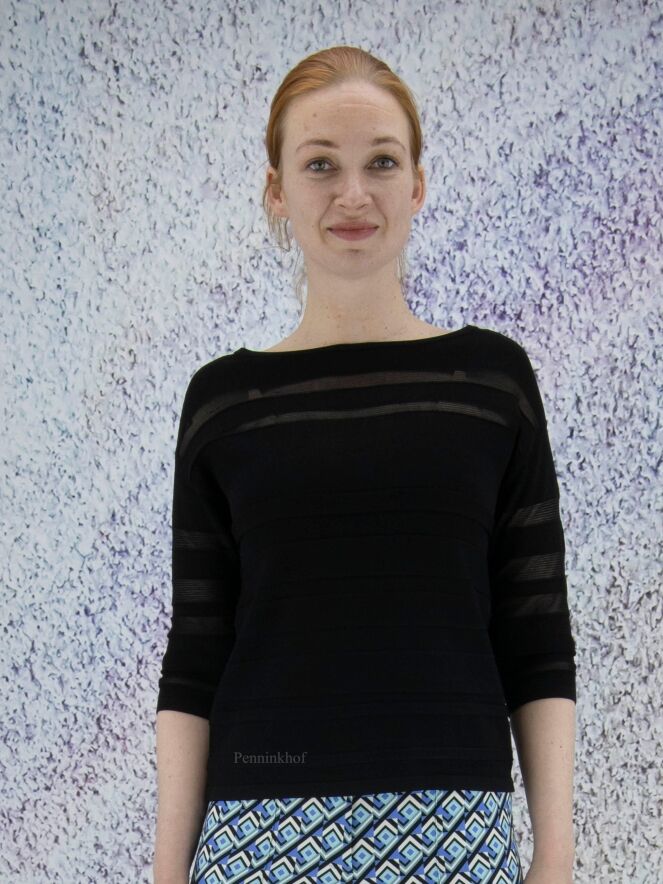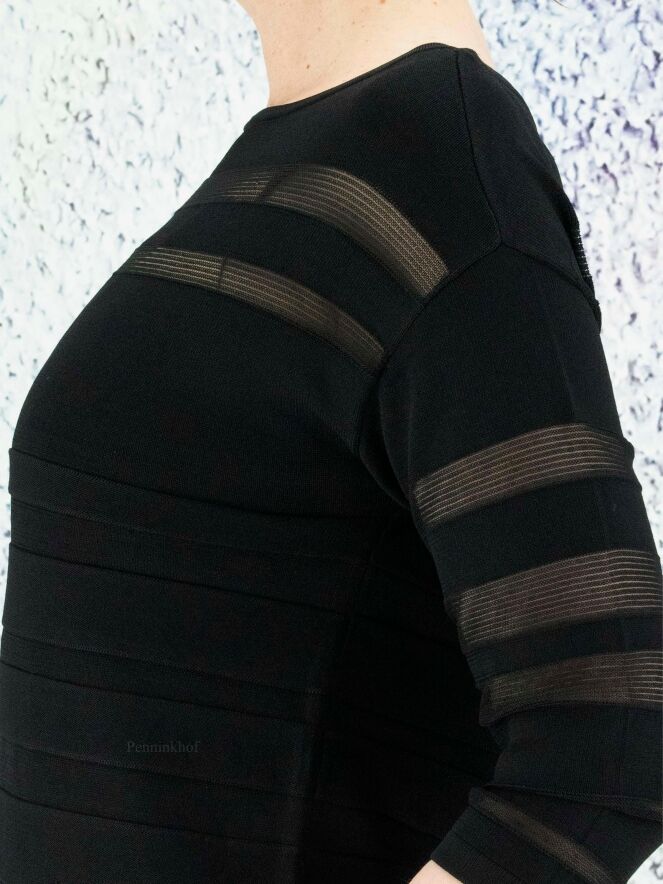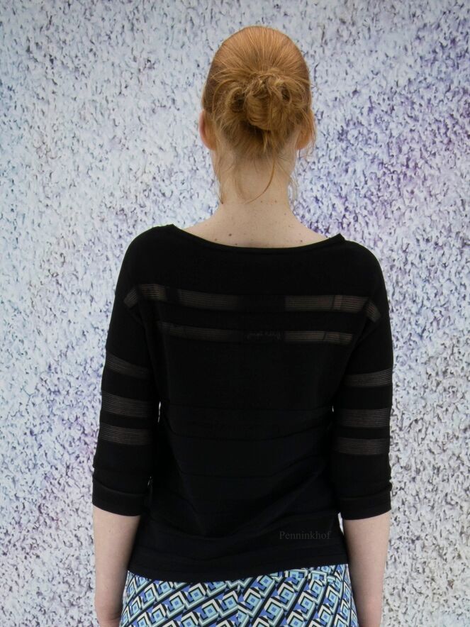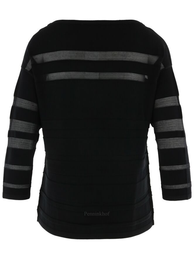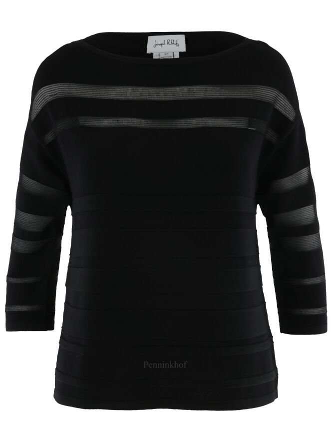 Een pullover van Joseph Ribkoff in een deels transparante strepen structuur in de kleur zwart. De pullover heeft een ronde hals en een halflange mouw. Deze pullover mag op de hand worden gewassen.