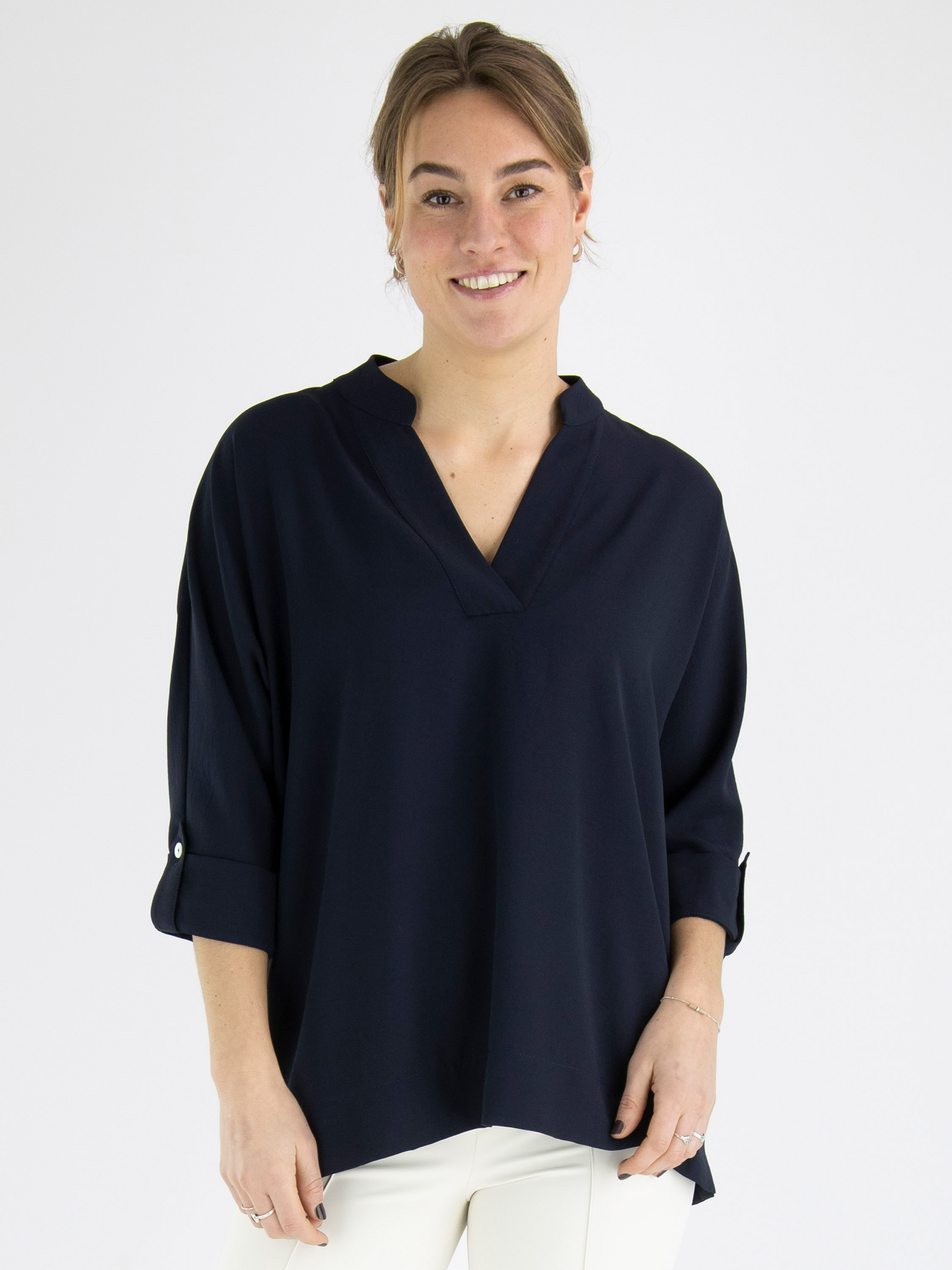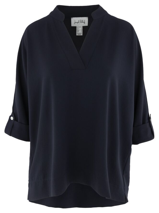 Een shirt van Joseph Ribkoff in een marineblauwe kleur. Het shirt heeft een V Hals en halflange mouwen. Dit shirt mag op de hand worden gewassen.