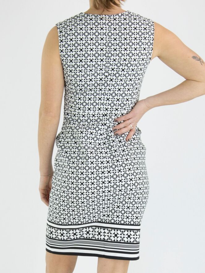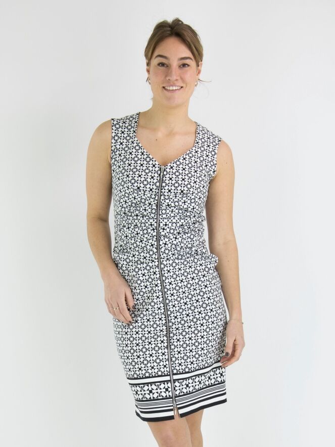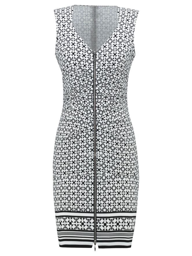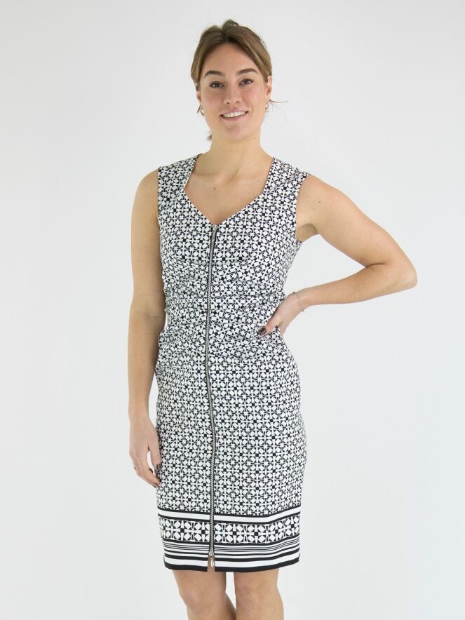 Een jurk van Joseph Ribkoff in een mozaïek print met de kleuren zwart en wit. Vanuit het midden van de halslijn is een rits naar beneden waarlangs de stof geplooid is tot onder de taille. Aan de onderkant van de jurk is een geprinte bies in een streep patroon. Deze jurk mag op de hand worden gewassen.