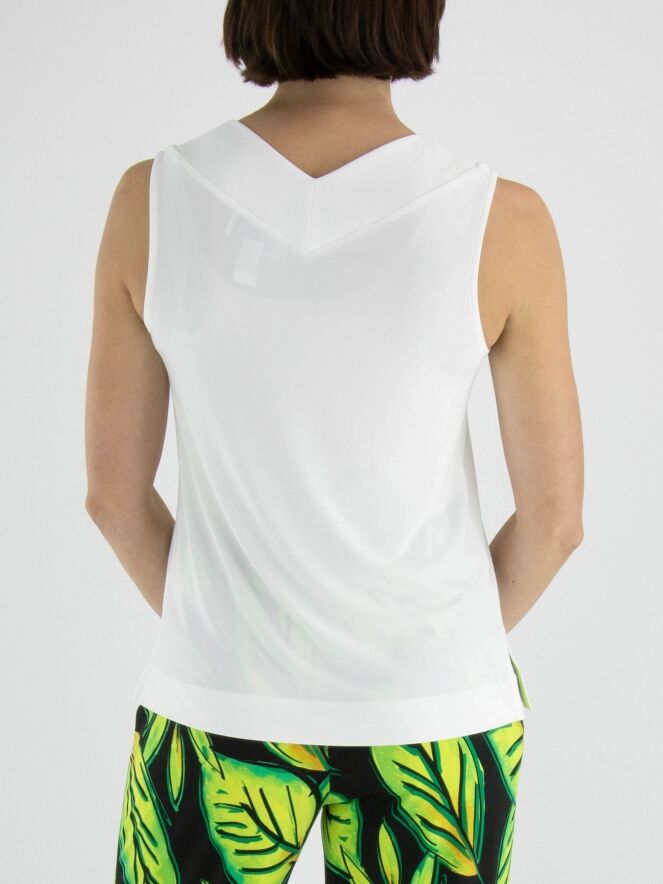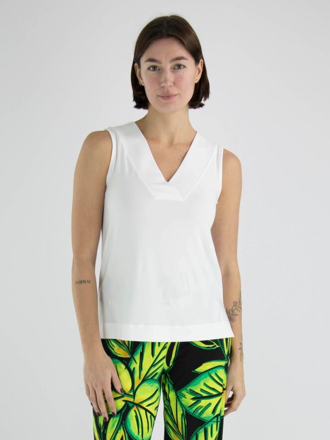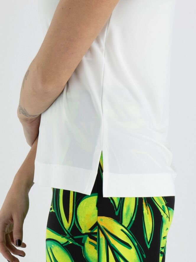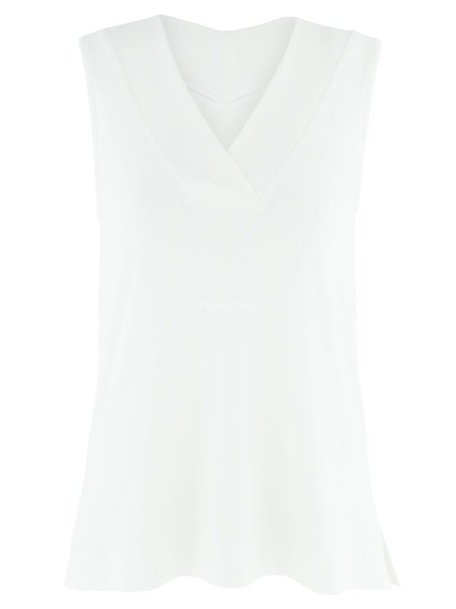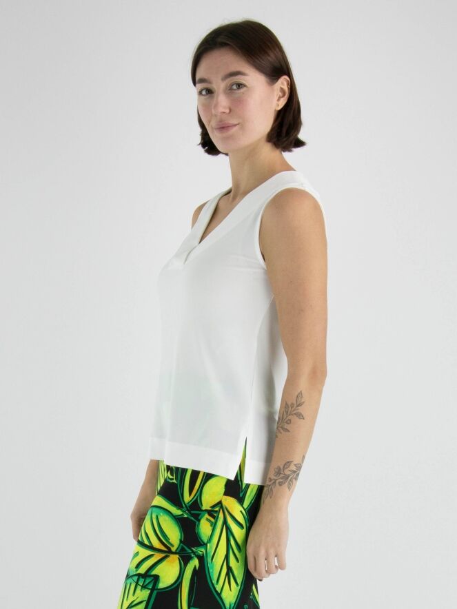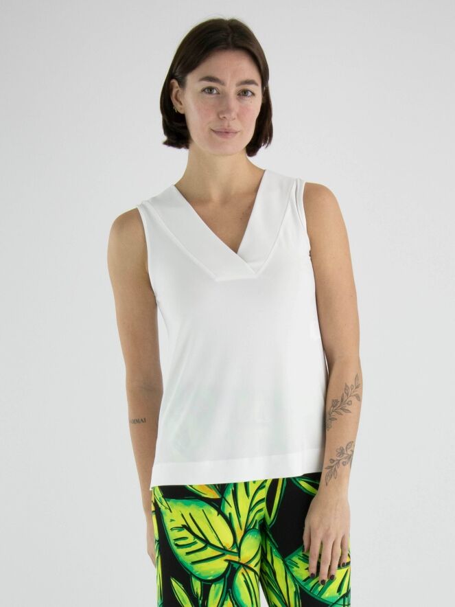Een top van Joseph Ribkoff in een roomwitte kleur. De V - Hals heeft een korte overslag in het midden. Deze top mag op de hand worden gewassen.