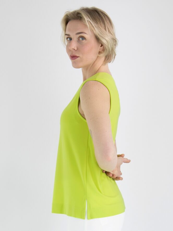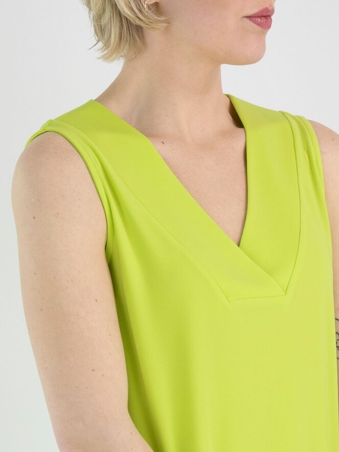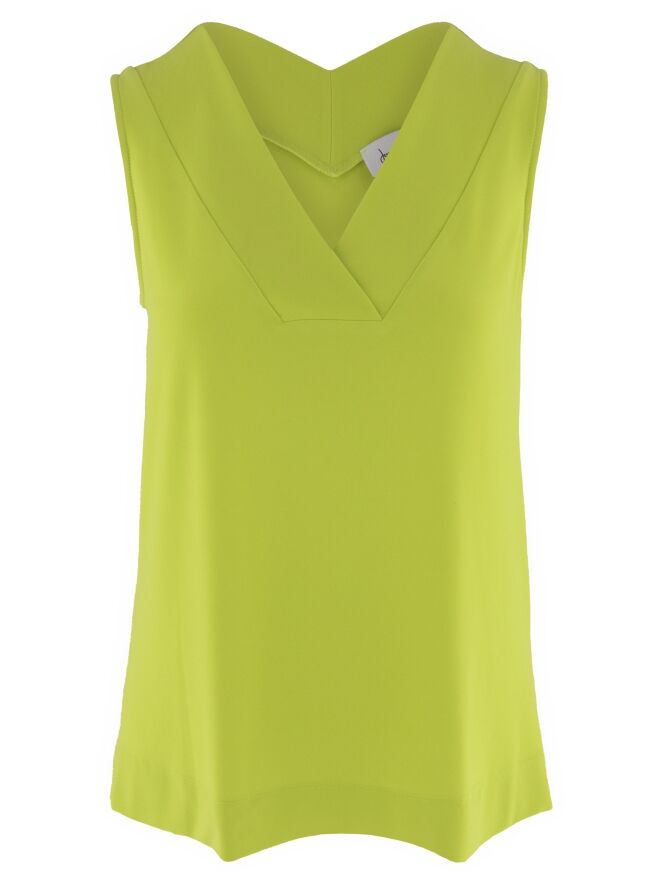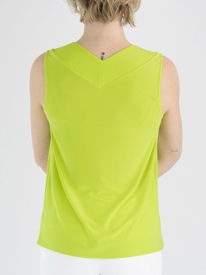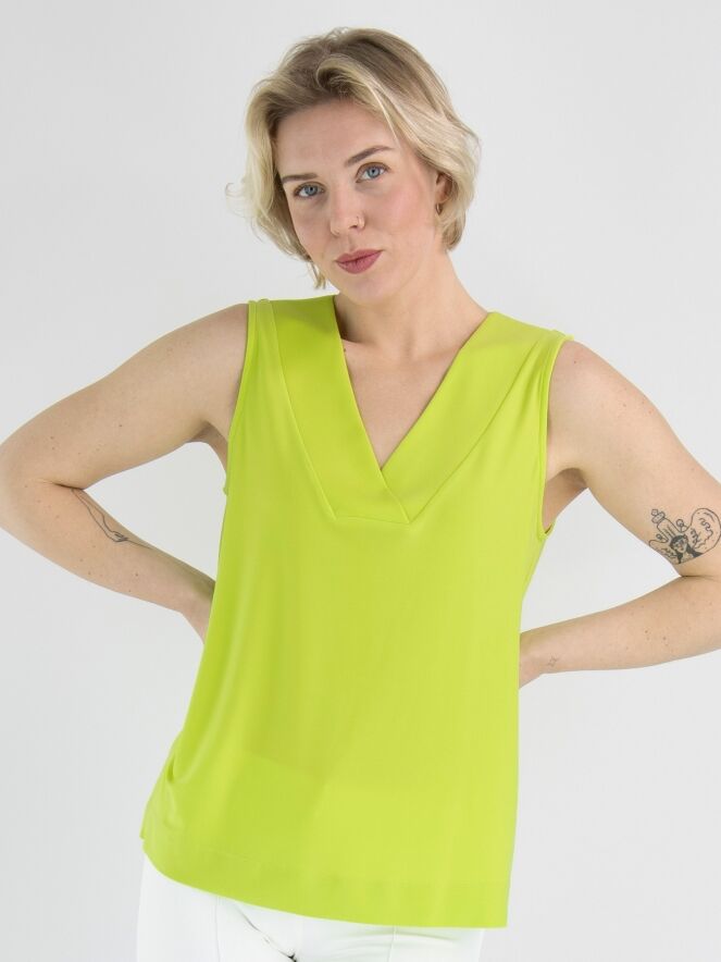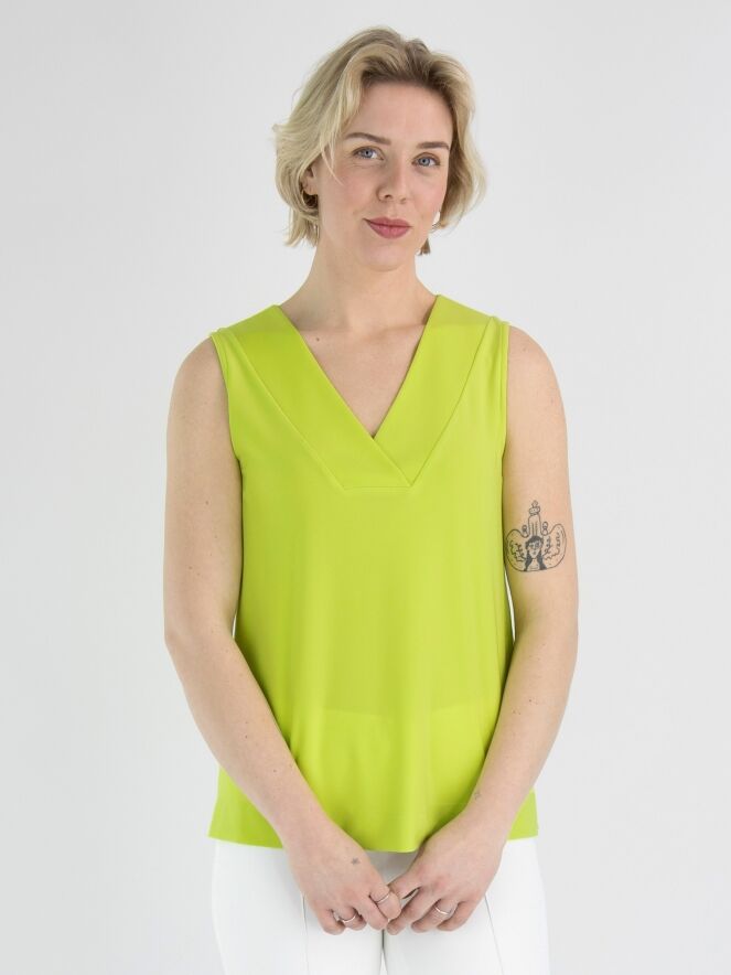 Een top van Joseph Ribkoff in een lime kleur. De V - Hals heeft een korte overslag in het midden. Deze top mag op de hand worden gewassen.