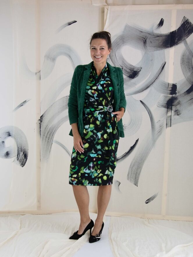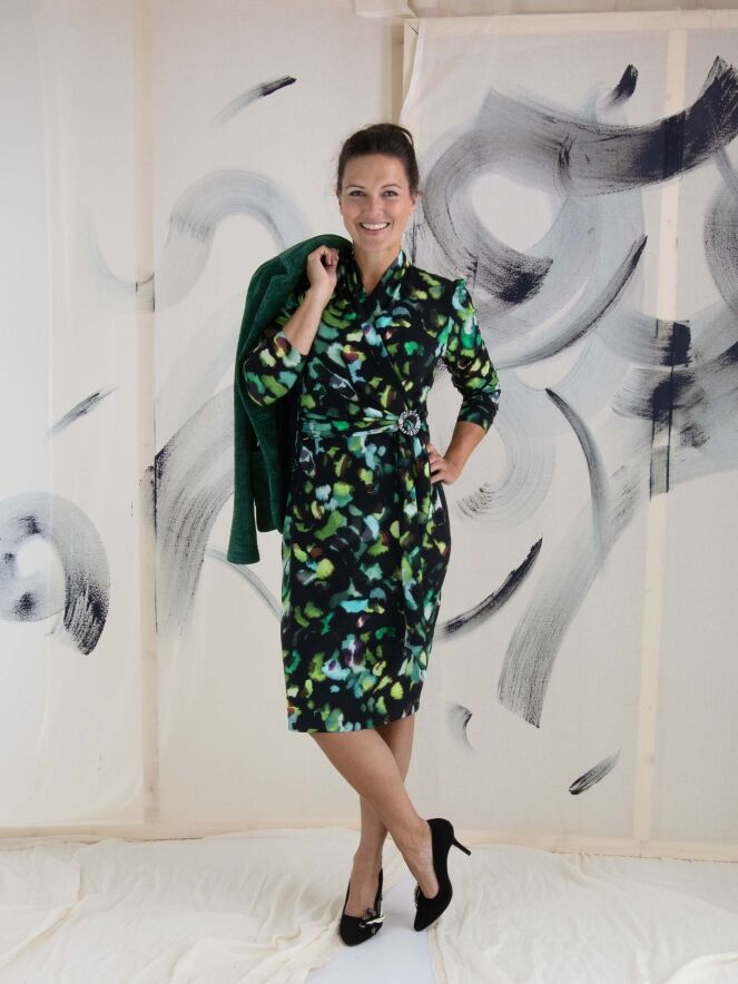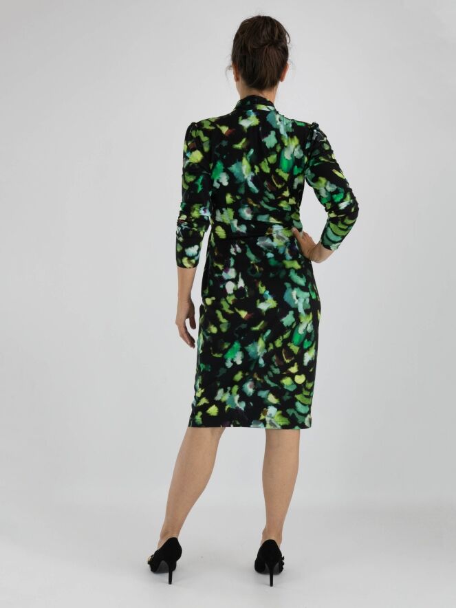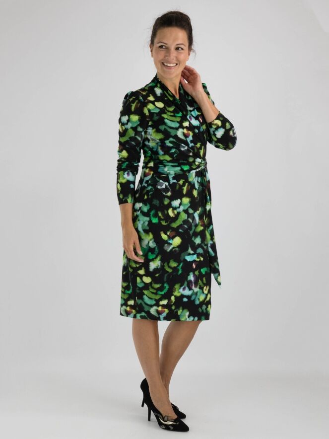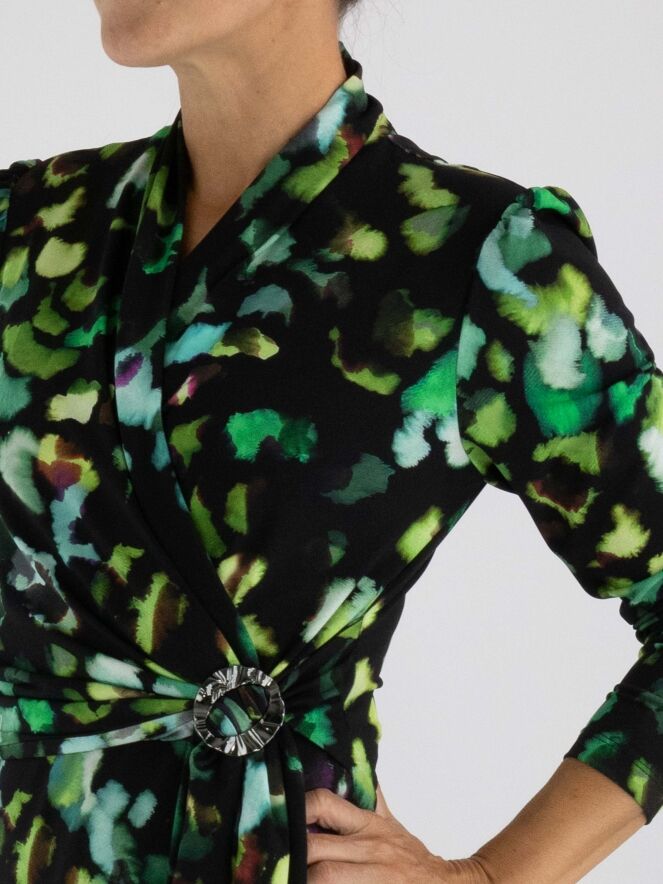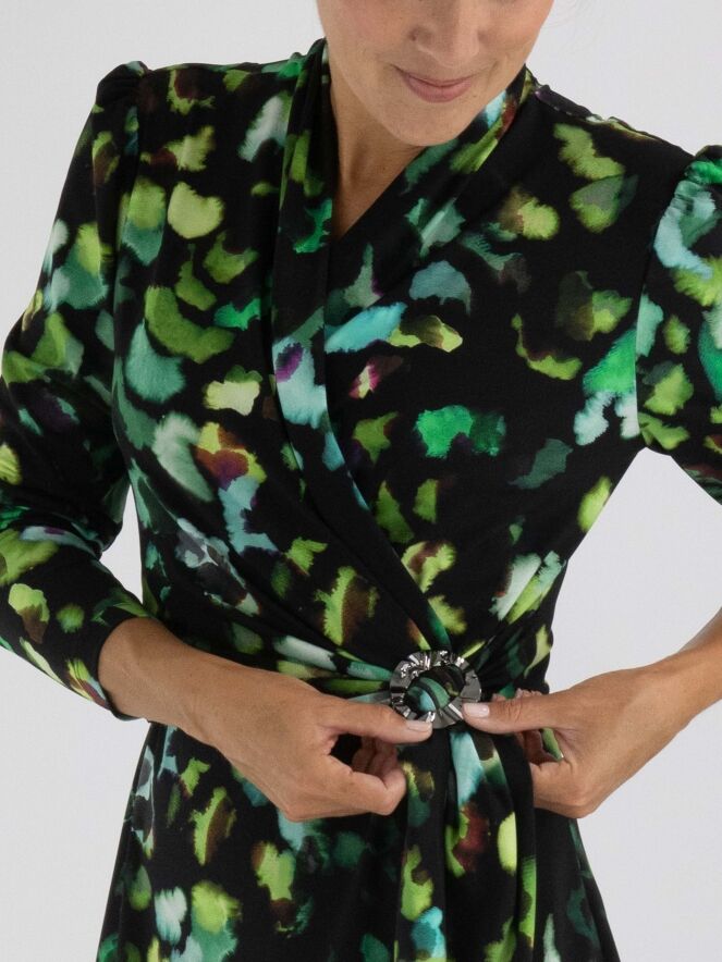 Een overslagjurk van Joseph Ribkoff in een grafische print met meerdere tinten turquoise ne groen met bruin op een zwarte achtergrond. De bevestiging van de overslag ter hoogte van de taille is met een nikkel kleurige gesp en een lint ceintuur. De jurk heeft lange mouwen en mag op de hand worden gewassen.