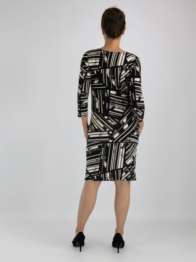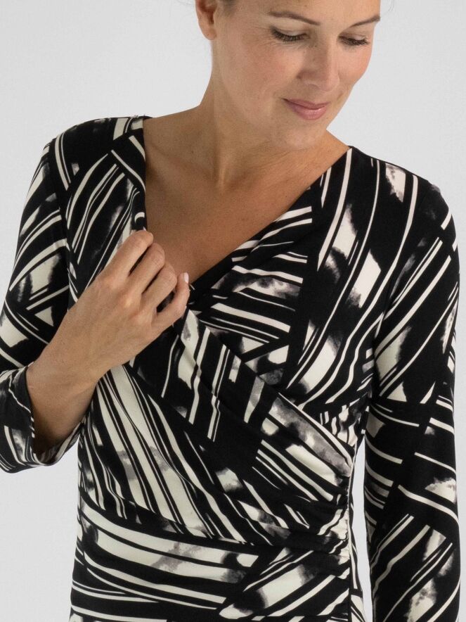 Een overslagjurk van Joseph Ribkoff in een grafische print met de kleuren roomwit, grijs en zwart. De bevestiging van de overslag ter hoogte van de taille is fijn geplooid wat een drapeer effect geeft. De jurk heeft halflange mouwen en mag op de hand worden gewassen.