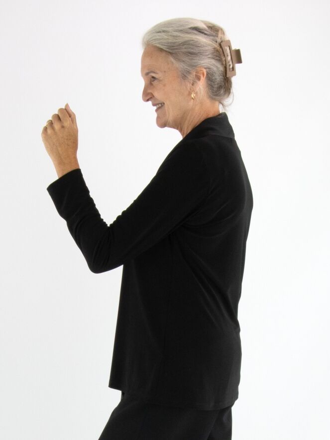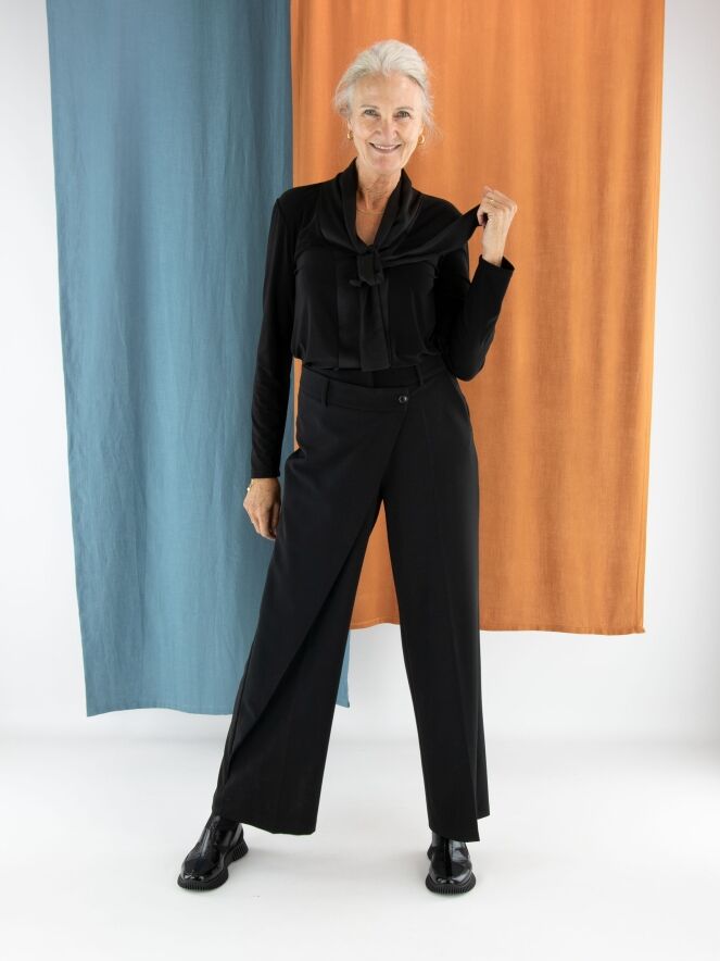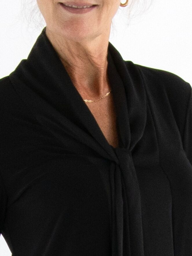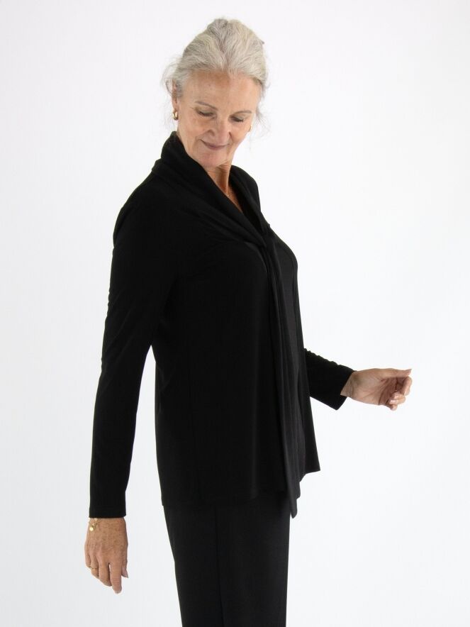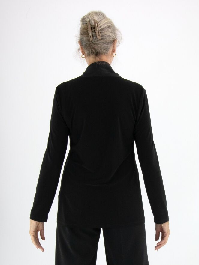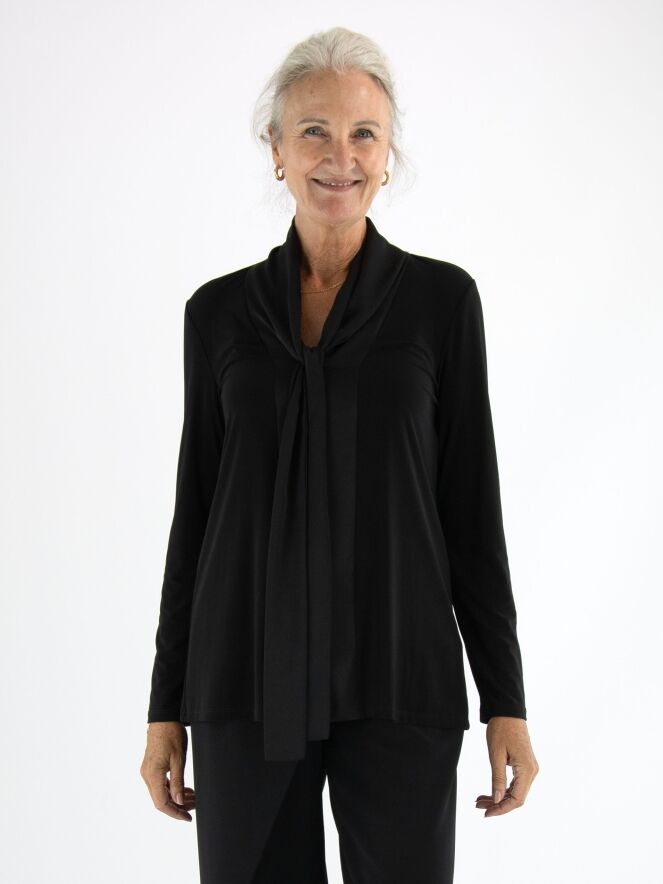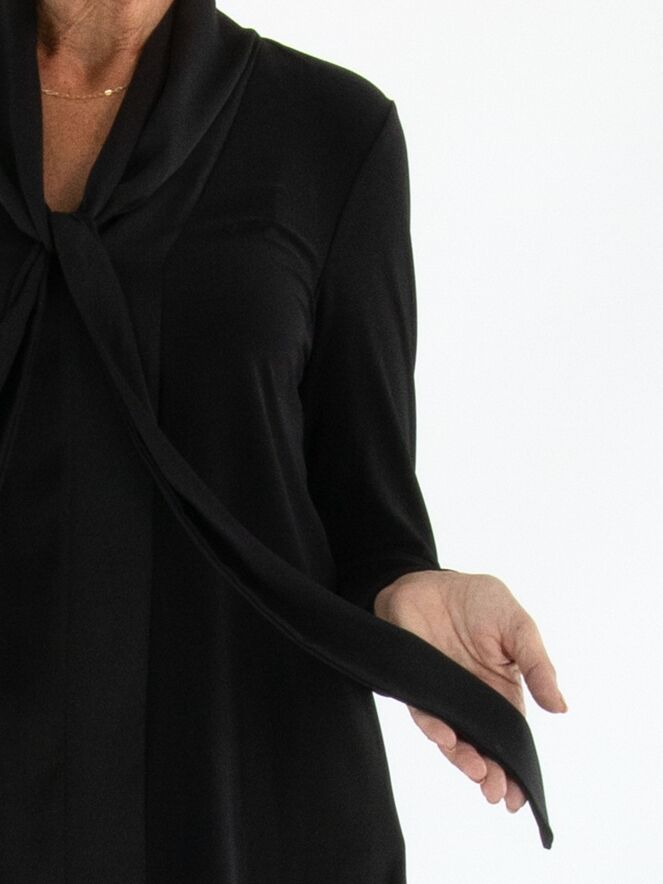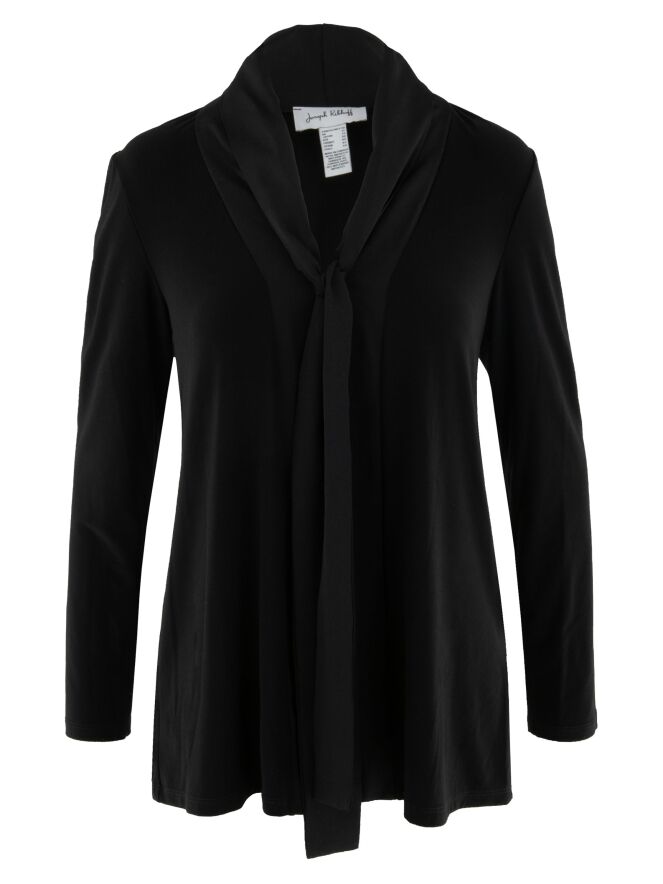 Een shirt van Joseph Ribkoff in de kleur zwart. Het shirt heeft een matte satijnen shawlkraag, waarvan de stof vanuit de V-hals tot aan de onderkant in een brede bies doorloopt. Vanuit de V-hals komen twee decoratieve linten. Het shirt heeft lange mouwen en mag met de hand worden gewassen.