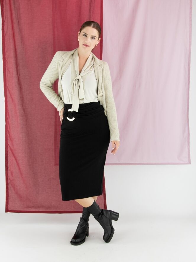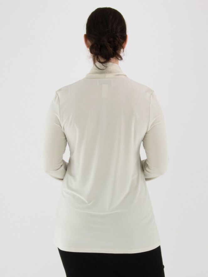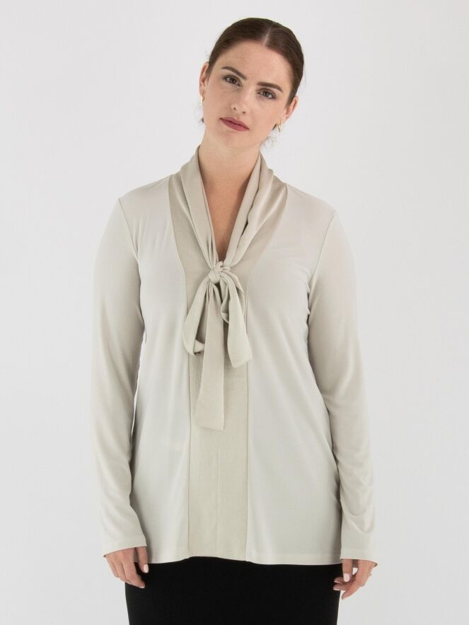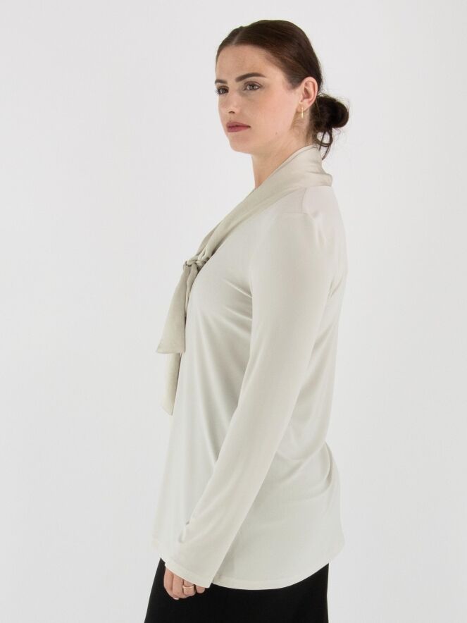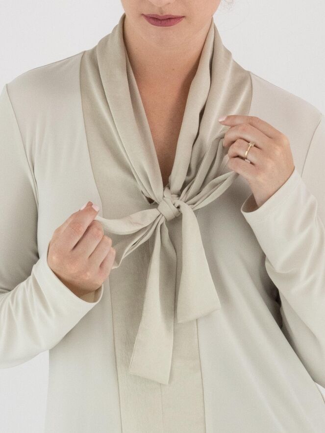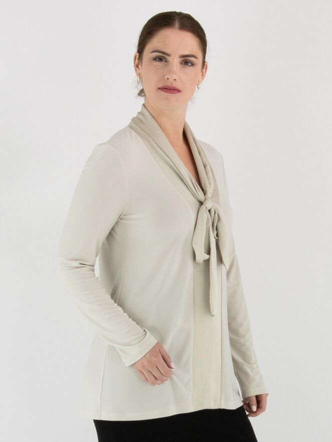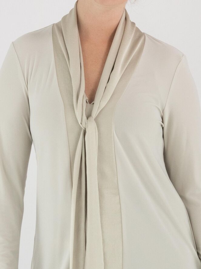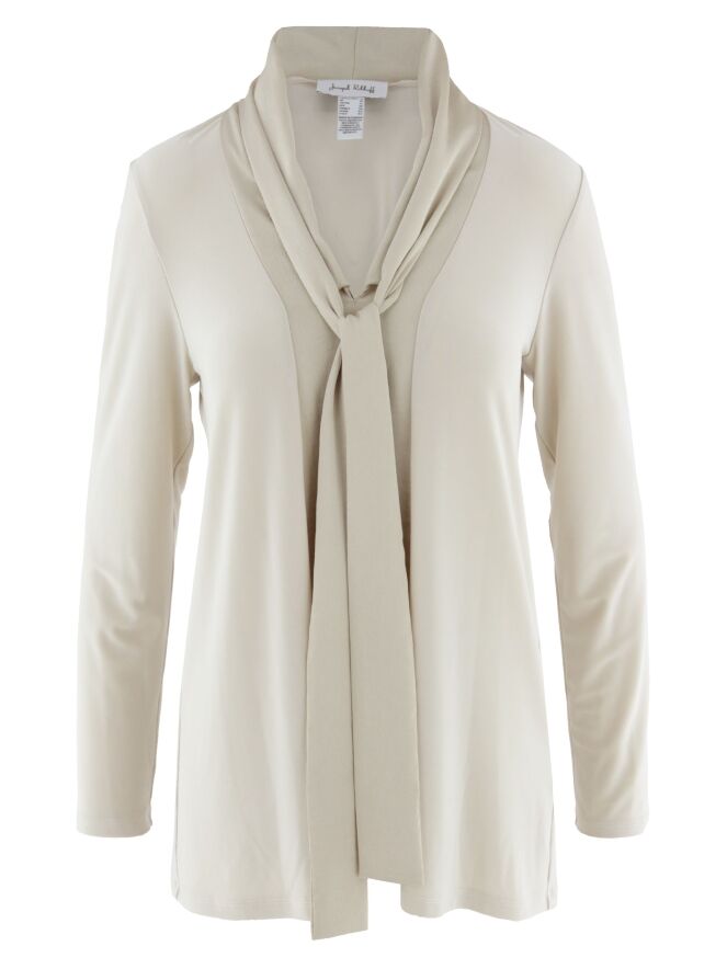 Een shirt van Joseph Ribkoff in de kleur beige. Het shirt heeft een matte satijnen shawlkraag, waarvan de stof vanuit de V-hals tot aan de onderkant doorloopt in een brede bies. Vanuit de V-hals vallen twee decoratieve linten. Het shirt heeft lange mouwen en mag met de hand worden gewassen.