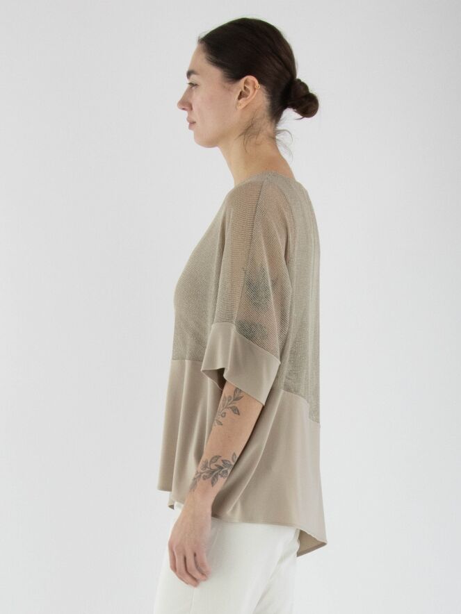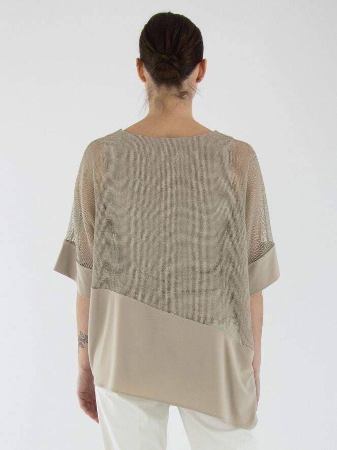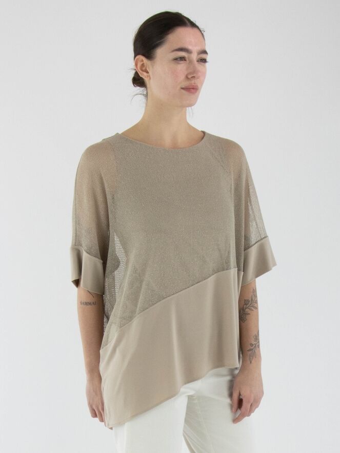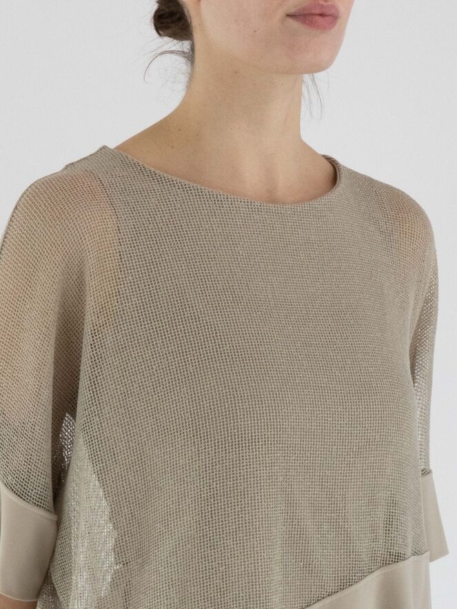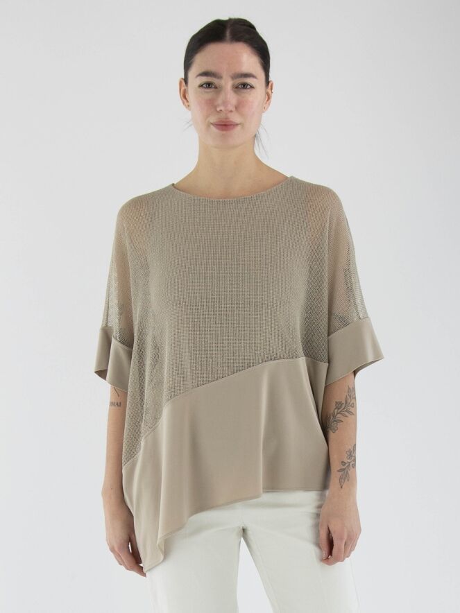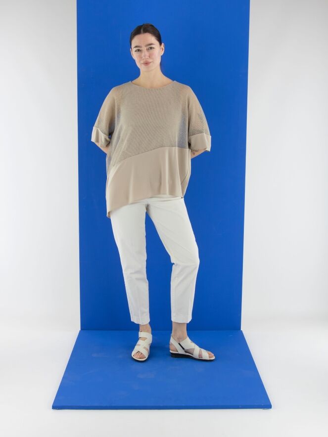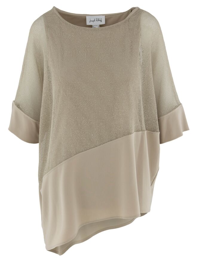 Een open geweven pullover van Joseph Ribkoff in de kleur taupe. Onder de pullover bevindt zich een uni zwarte top. De open geweven structuur loopt tot de taille, waar een diagonale lijn overgaat in een uni zwarte stof. Aan de uiteinden van de korte mouwen bevindt zich een brede bies van dezelfde uni zwarte stof. Deze pullover dient met de hand te worden gewassen.