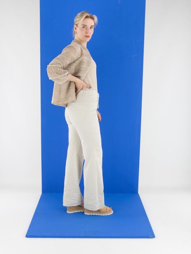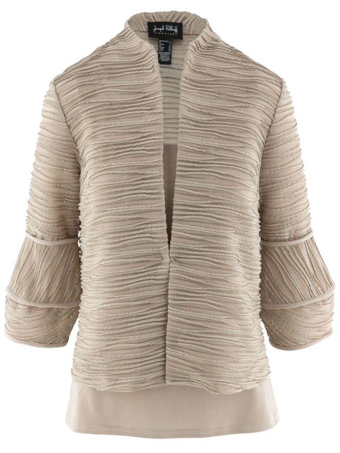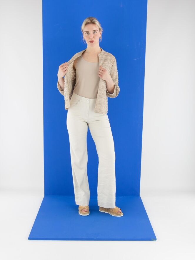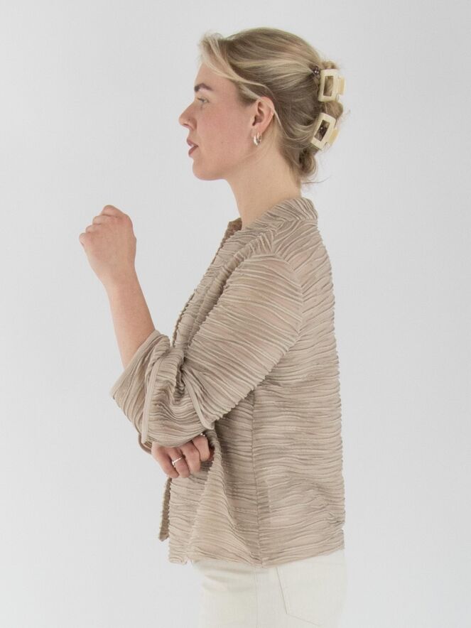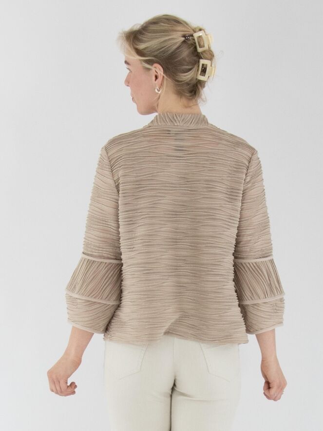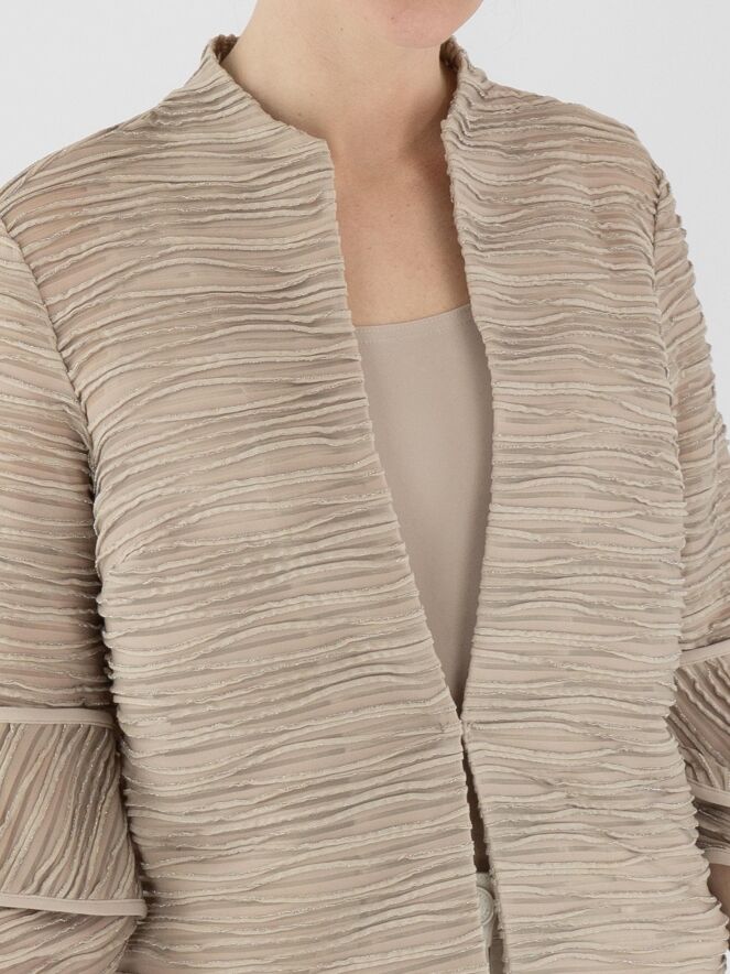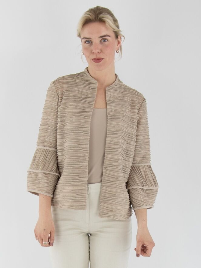 Een licht transparant vest van Joseph Ribkoff in de kleur zand. De stof is fijn geplisseerd, met een metaaldraad geweven langs de randen van de plissé. Bij de uiteinden van de halflange mouwen is de stof deels haaks ingezet. Het vest heeft een sluiting met een bonthaak en is voorzien van een top als voering. Dit vest dient met de hand te worden gewassen.