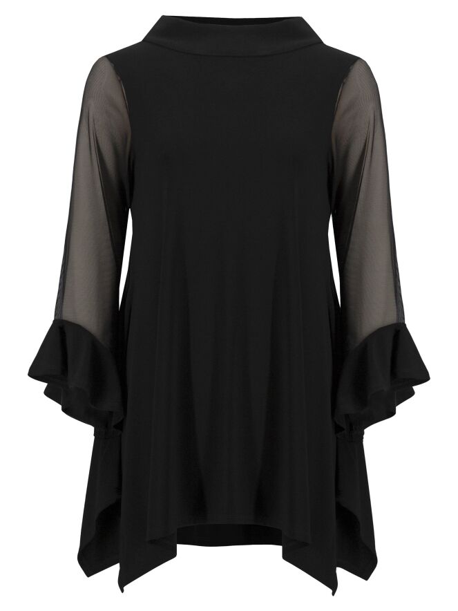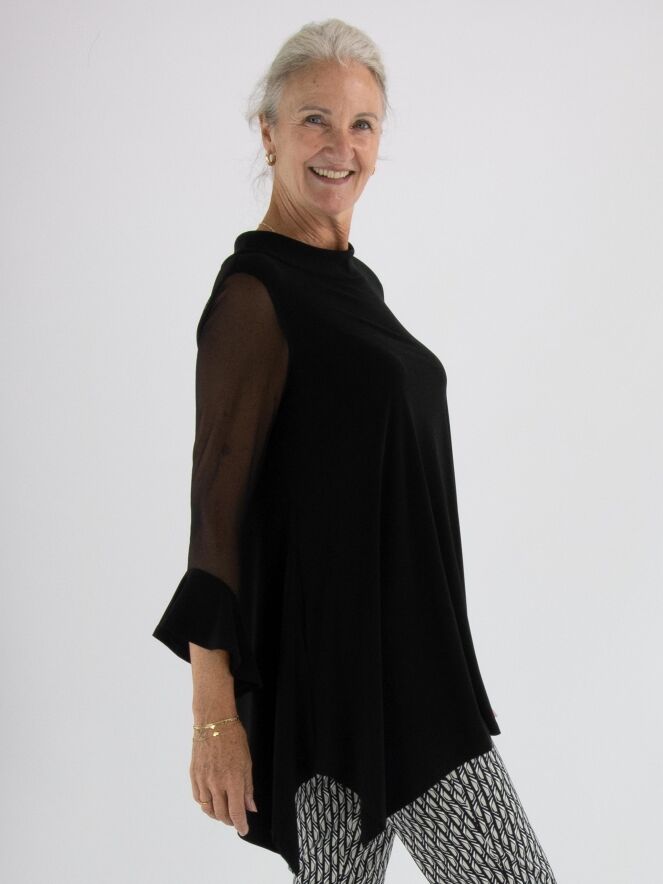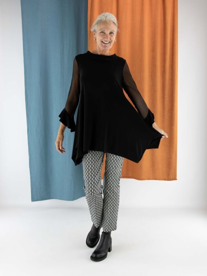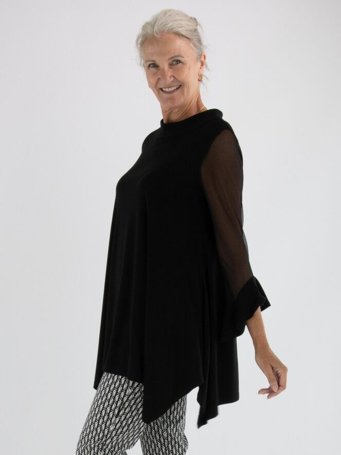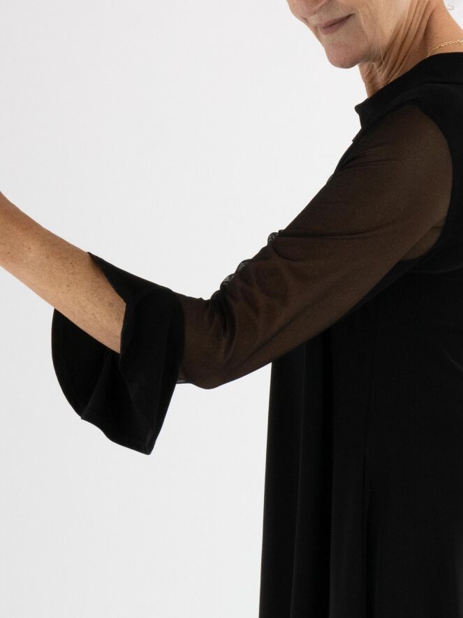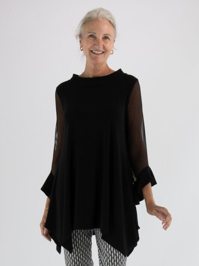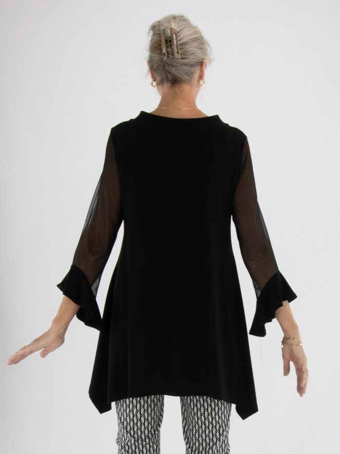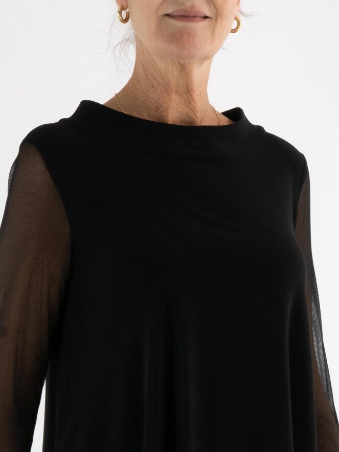 Een shirt van Joseph Ribkoff in de kleur zwart. Het shirt heeft een A-lijn en de lange mouwen zijn transparant met aan de uiteinden wijde manchetten. De ronde hals heeft een brede boord. Dit shirt mag met de hand worden gewassen.