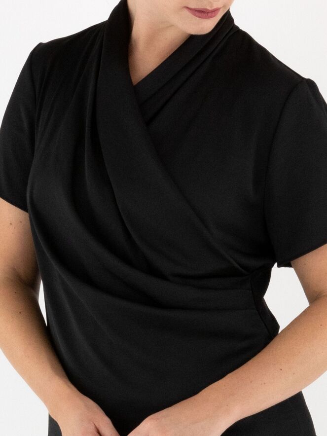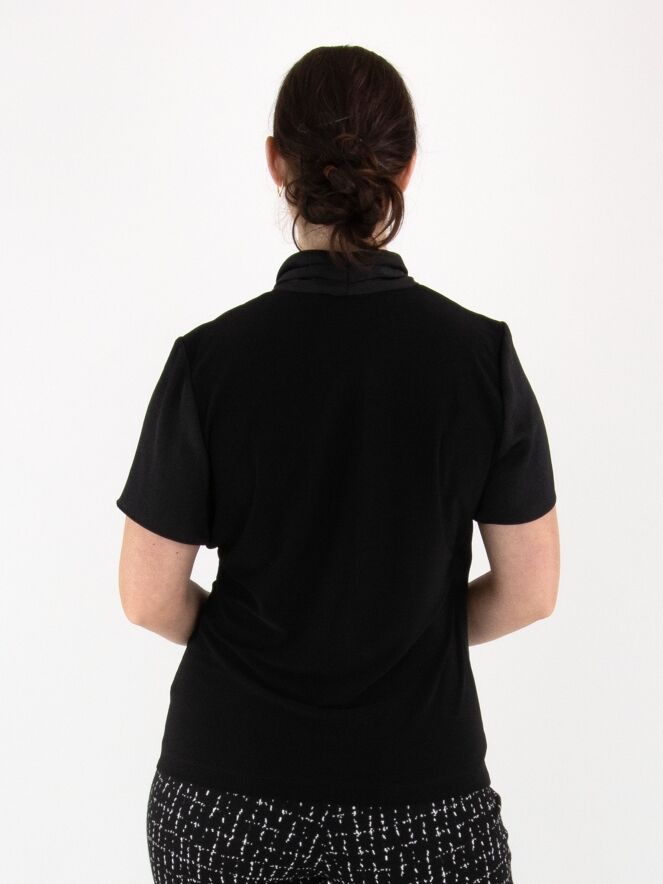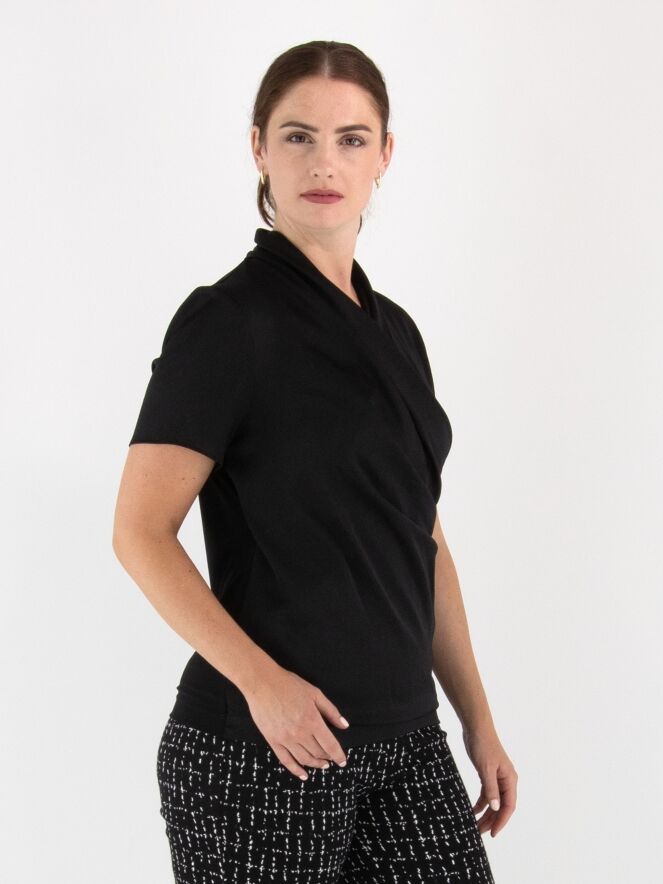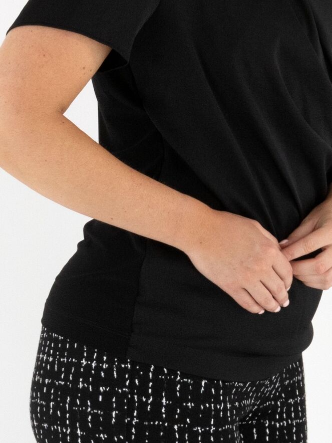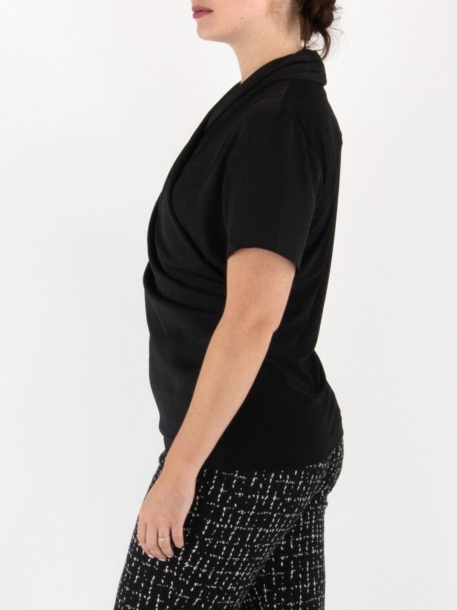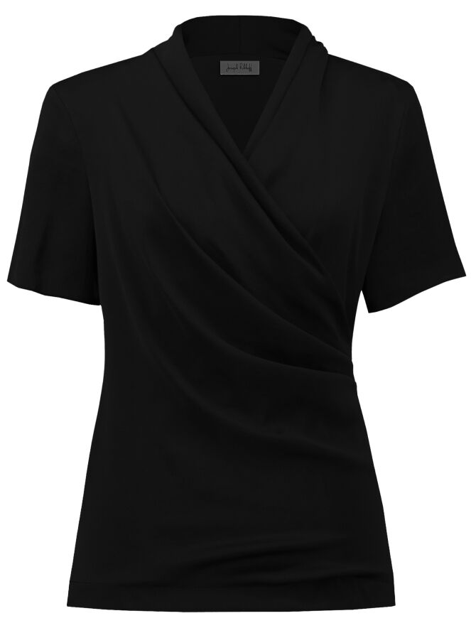 Een overslagshirt van Joseph Ribkoff in het zwart. In de taille is de overslag aan de linkerzijkant in meerdere plooien vastgezet, wat zorgt voor een elegant drapeereffect. Het shirt heeft korte mouwen en mag met de hand worden gewassen.