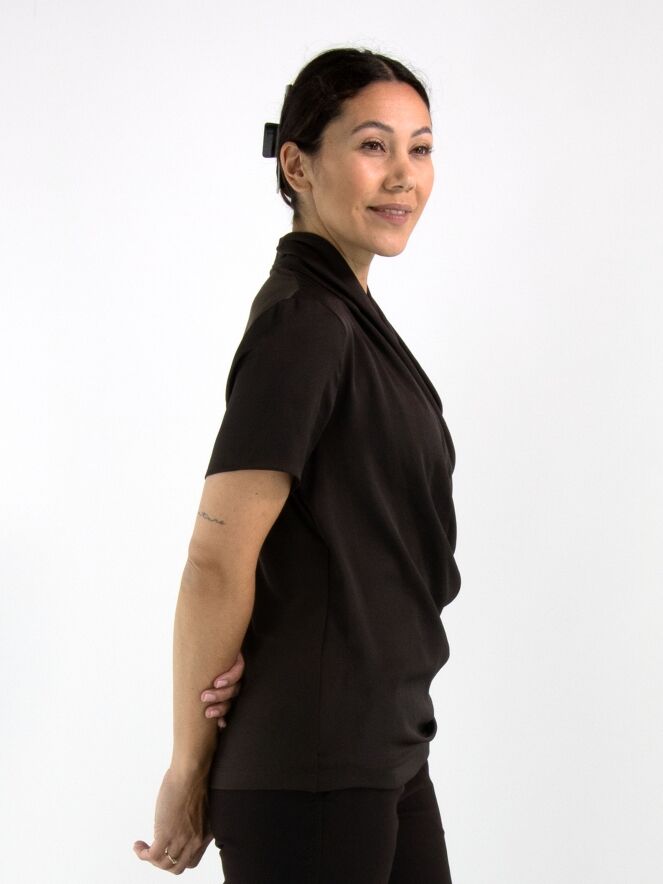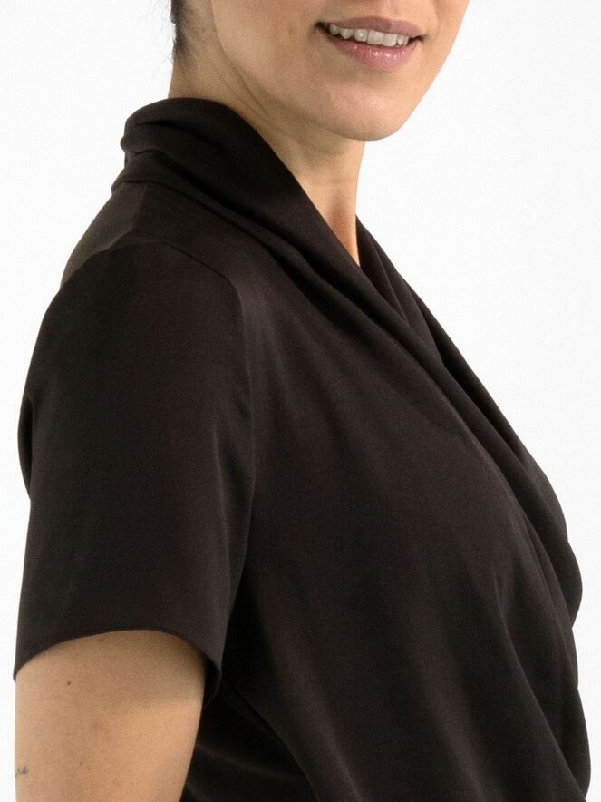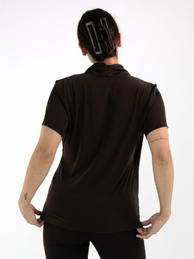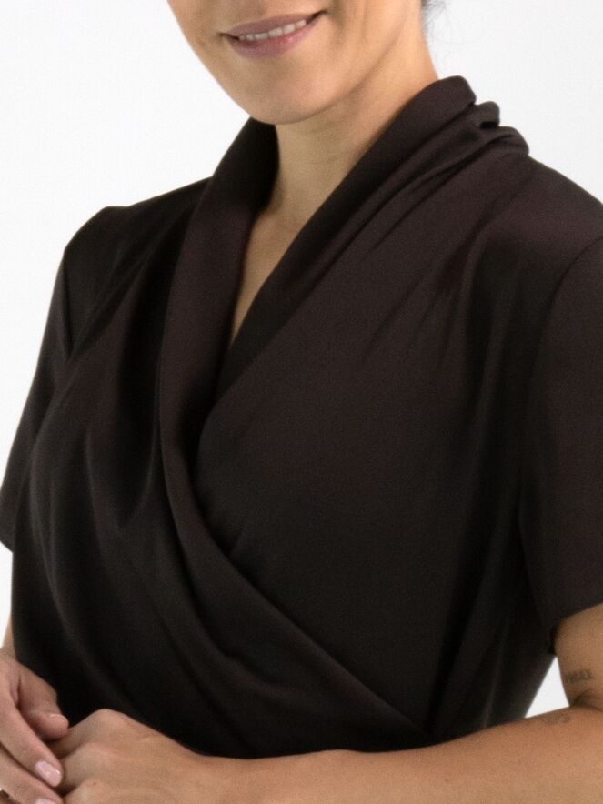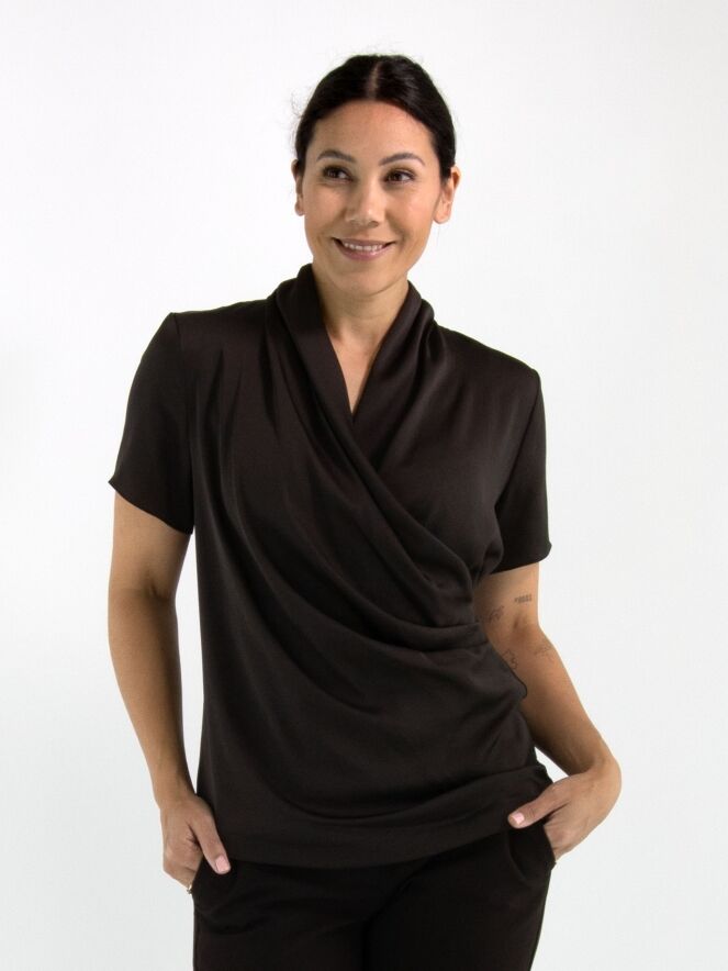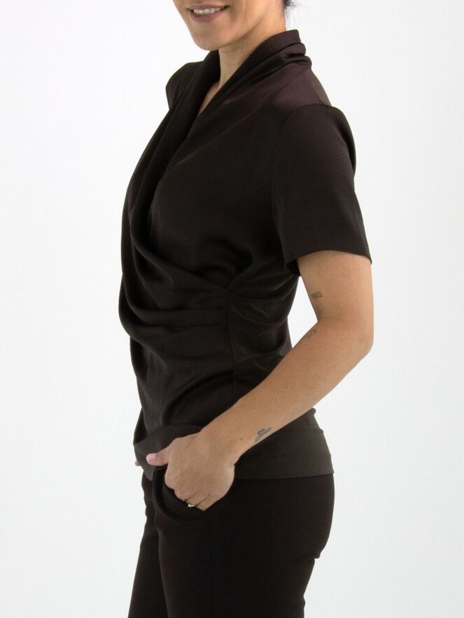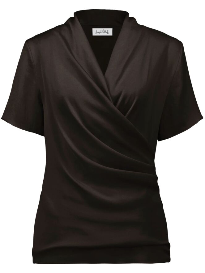 Een overslagshirt van Joseph Ribkoff in mokkabraun. In de taille is de overslag met meerdere plooien vastgezet aan de linkerzijde, waardoor een elegant drapeereffect ontstaat. Het shirt heeft korte mouwen en kan met de hand worden gewassen.