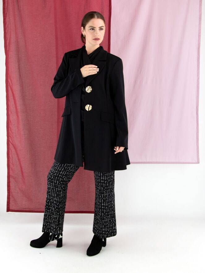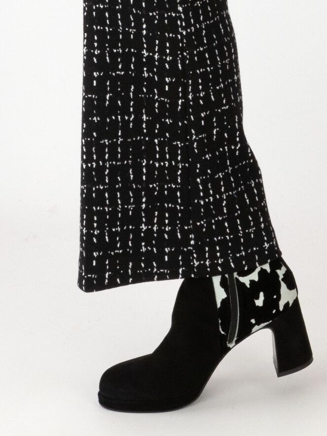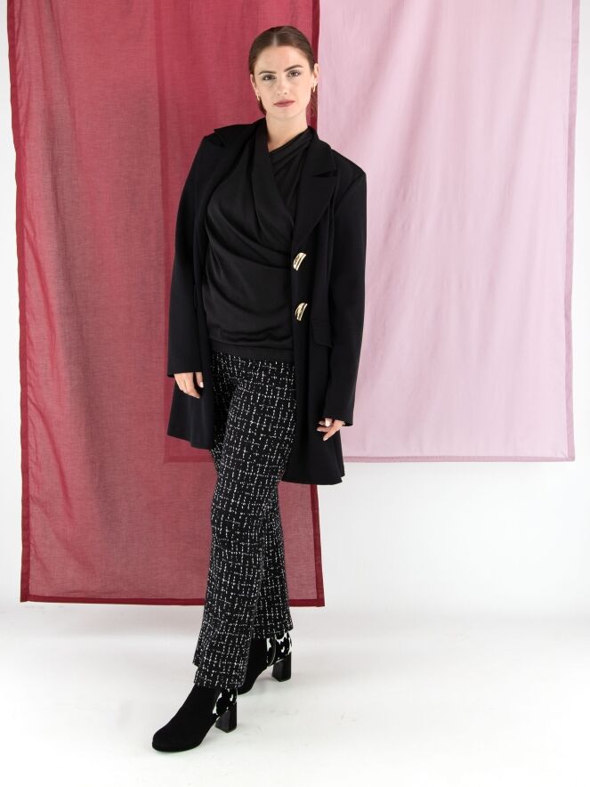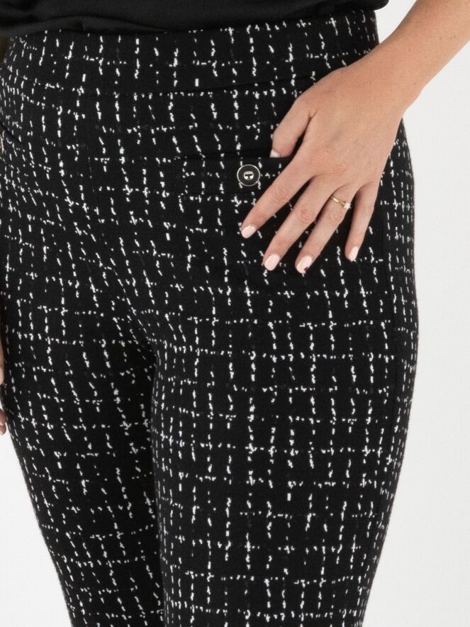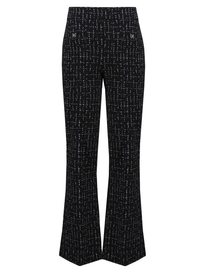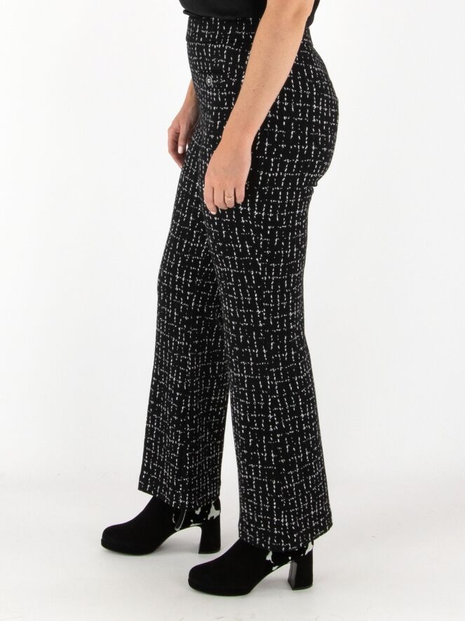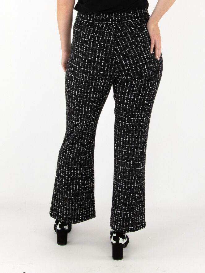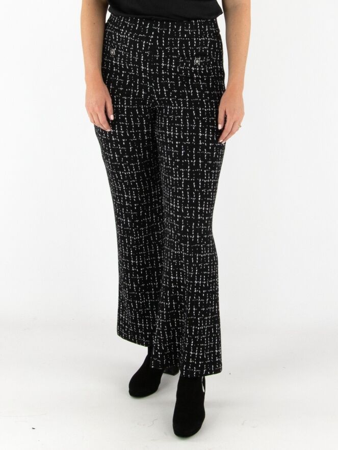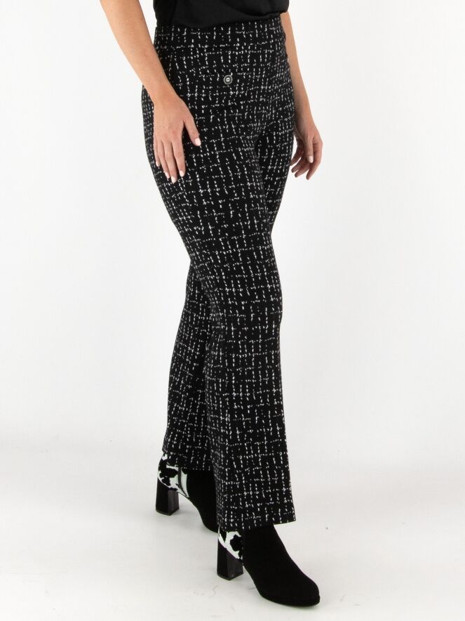 Een flared broek van Joseph Ribkoff in een grafische print met de kleuren zwart en wit. In de taille zit een elastische band. Deze broek mag met de hand worden gewassen.