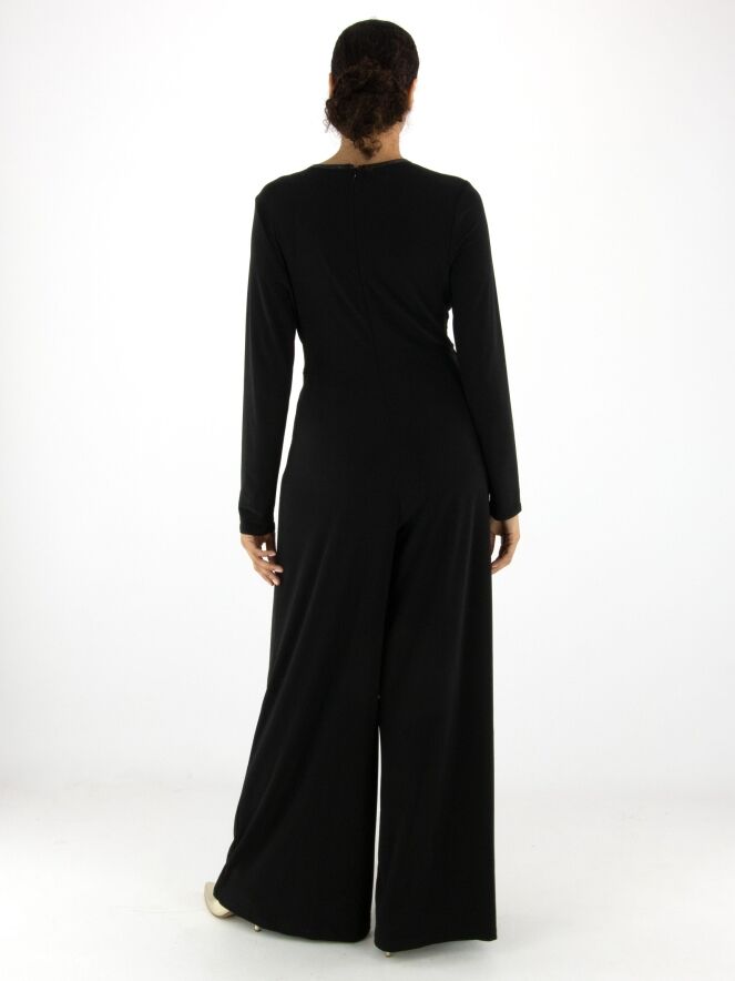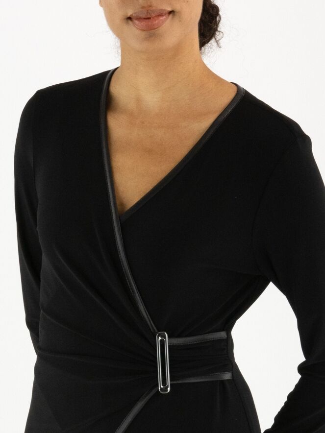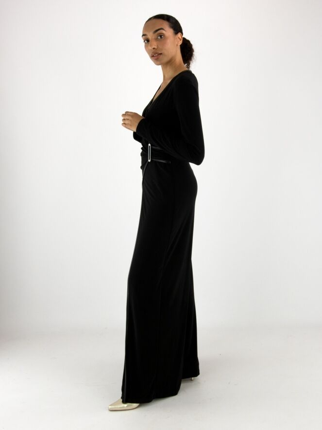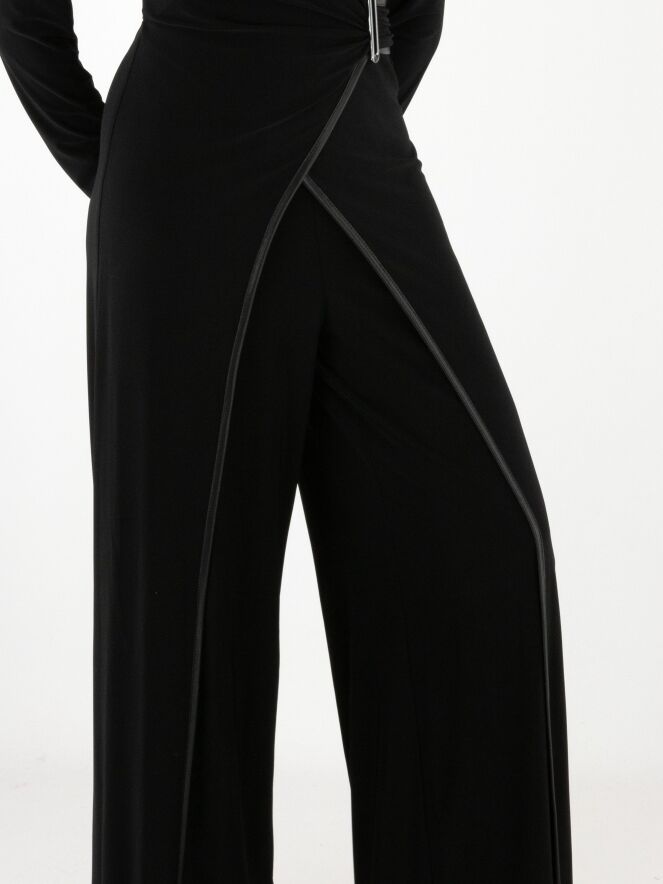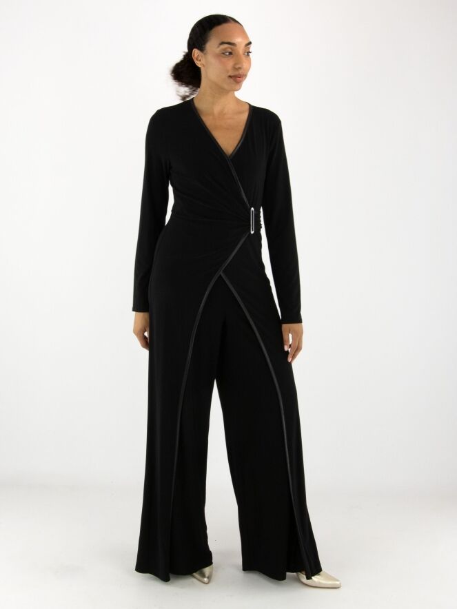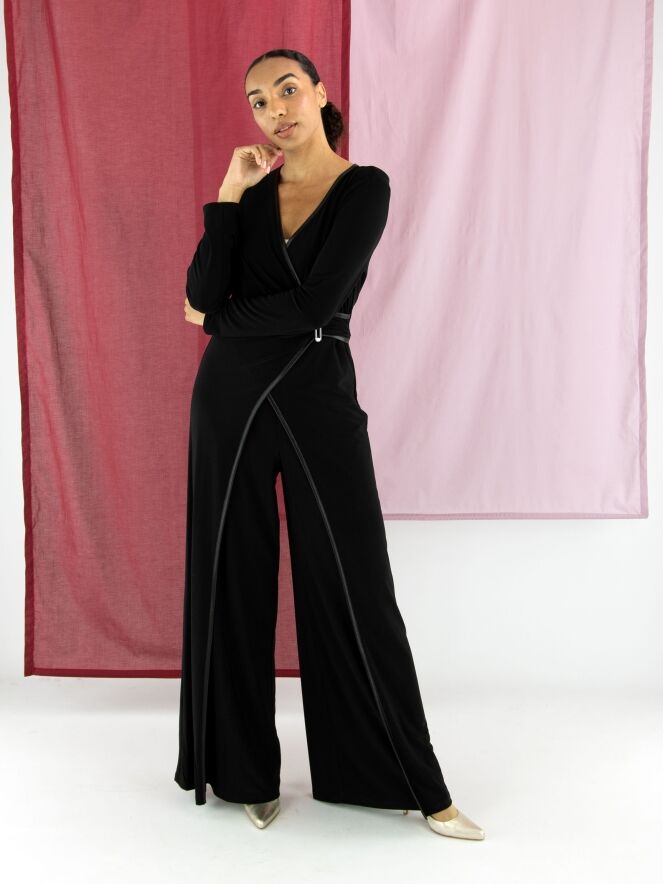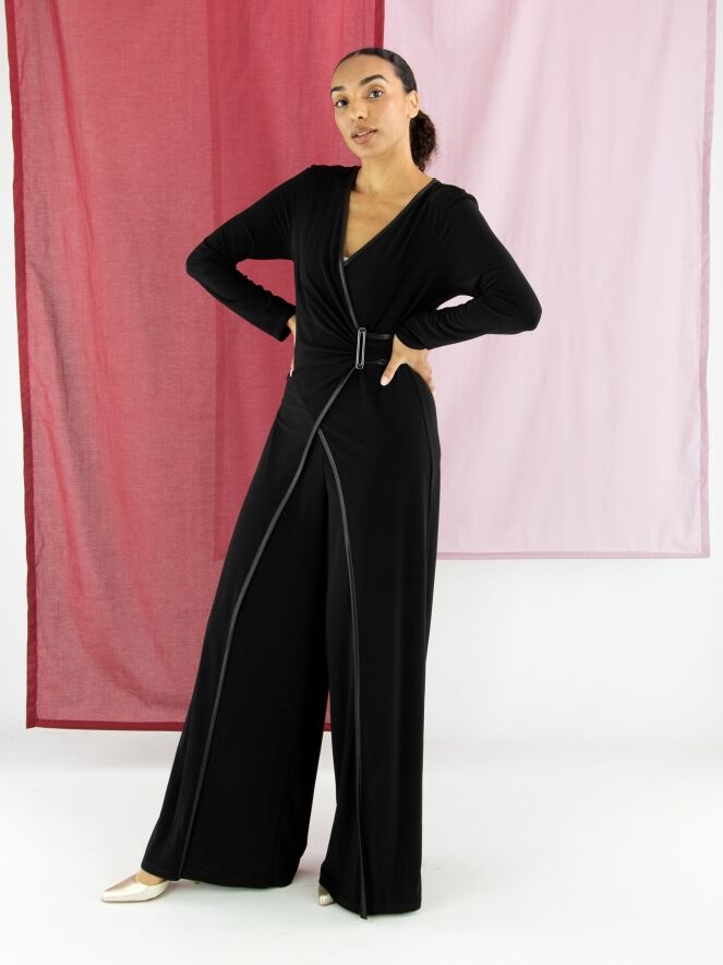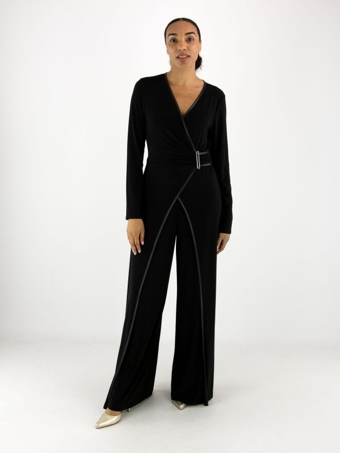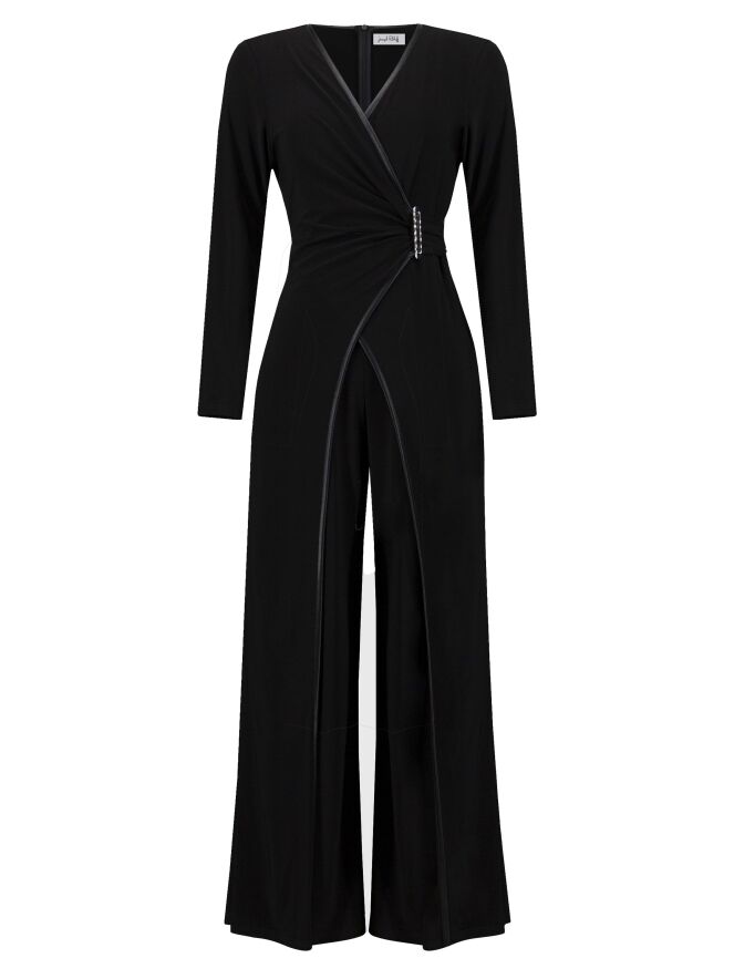 Een overslagjumpsuit van Joseph Ribkoff in de kleur zwart. Langs de randen van de hals tot naar beneden loopt een imitatielederen bies. In de taille bevindt zich een smalle, rechthoekige gesp. Deze jumpsuit mag met de hand worden gewassen.