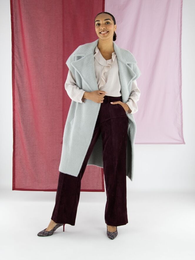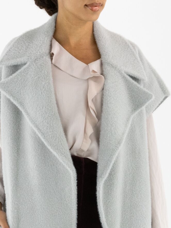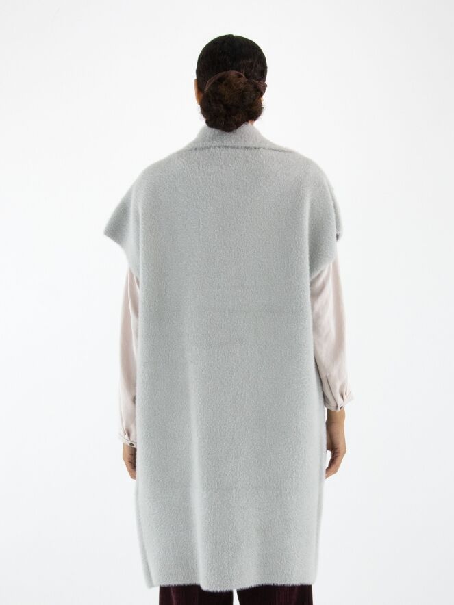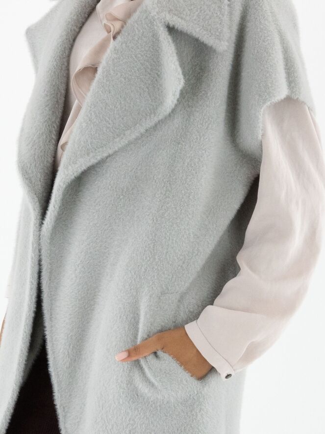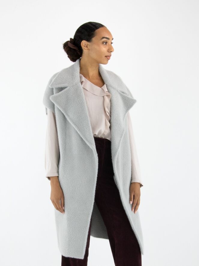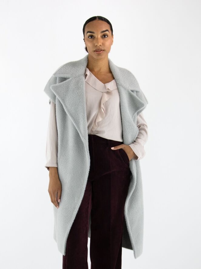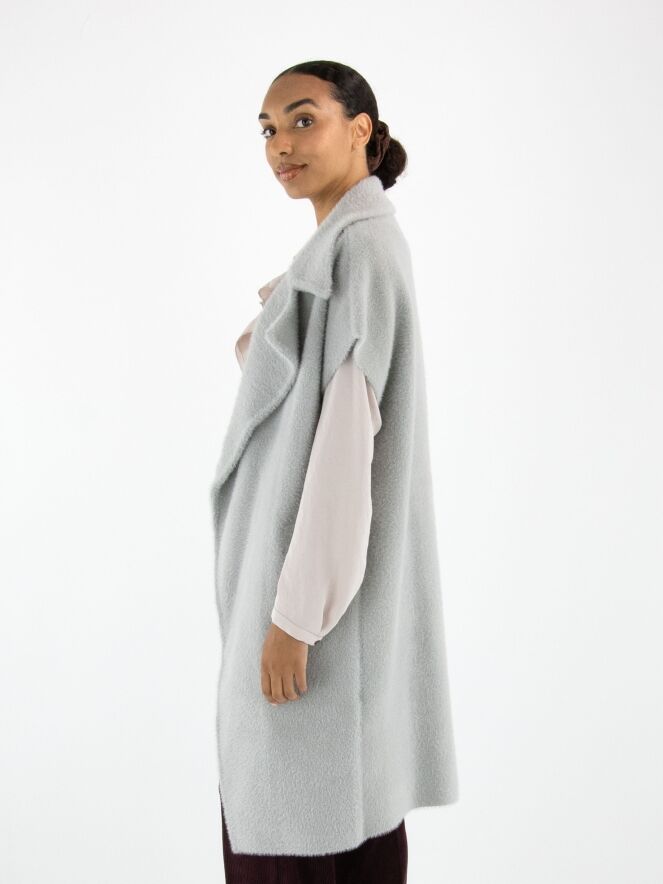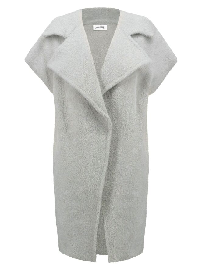 Een halflange bodywarmer van Joseph Ribkoff in een lichtgrijze kleur. De bodywarmer heeft een brede kraag en geen sluiting. Ter hoogte van de taille bevinden zich steekzakken. Deze bodywarmer mag met de hand worden gewassen.