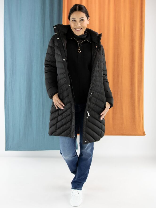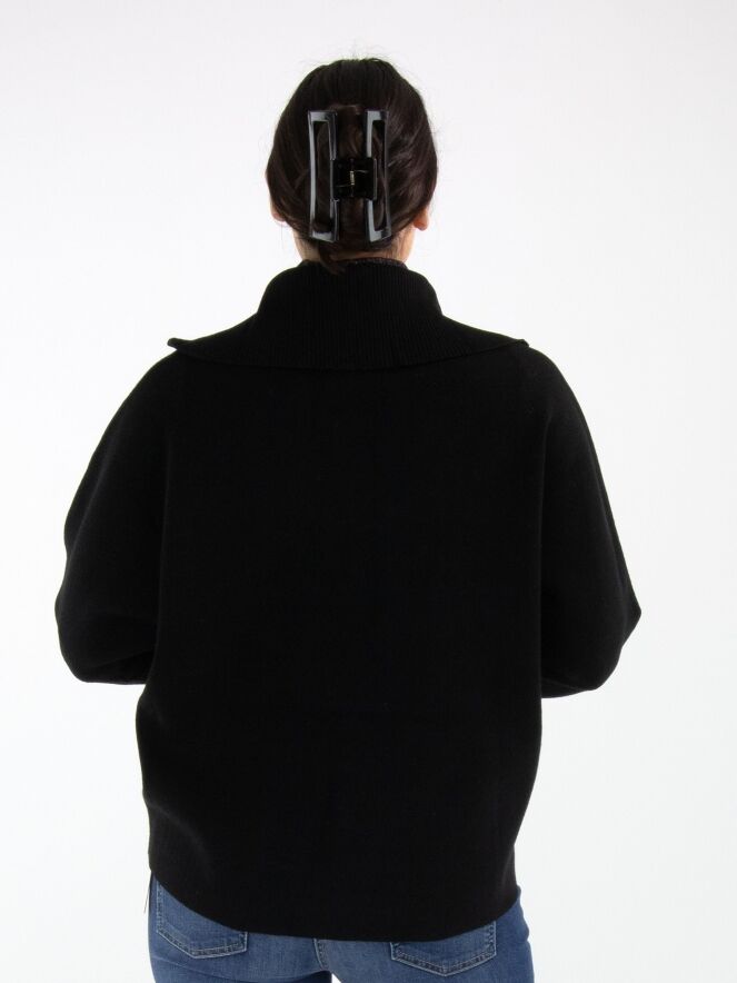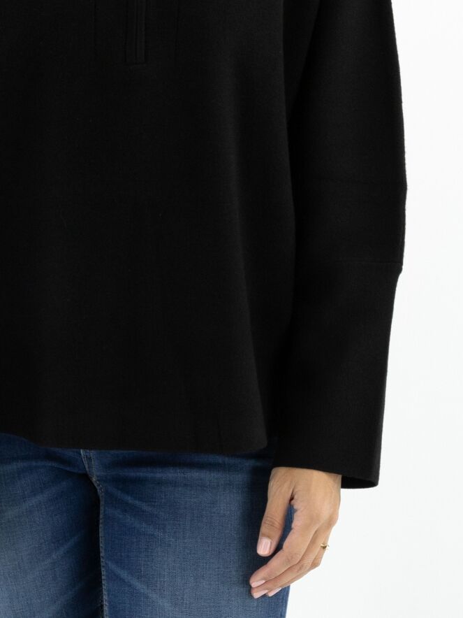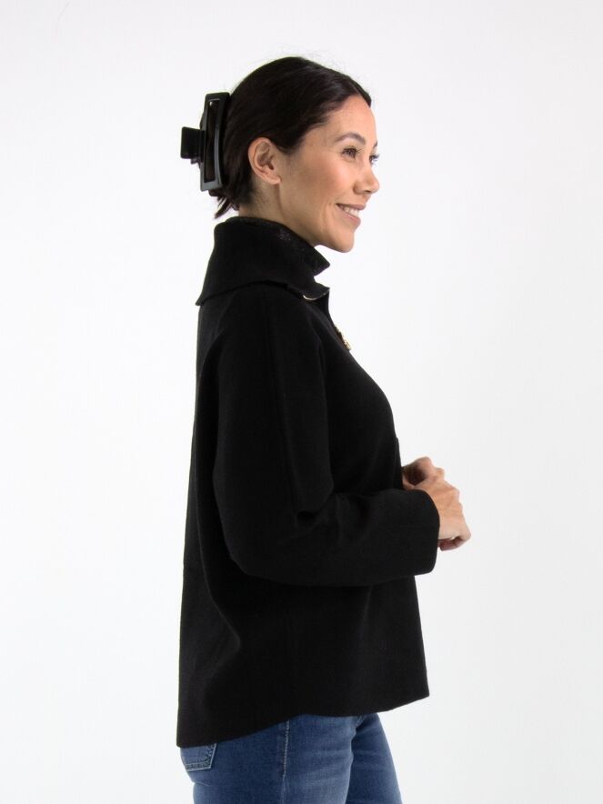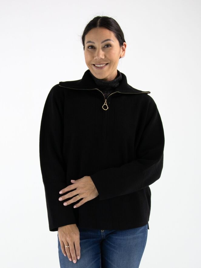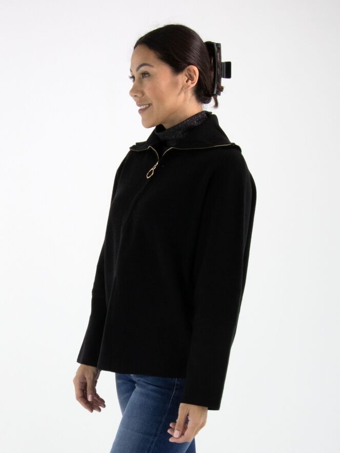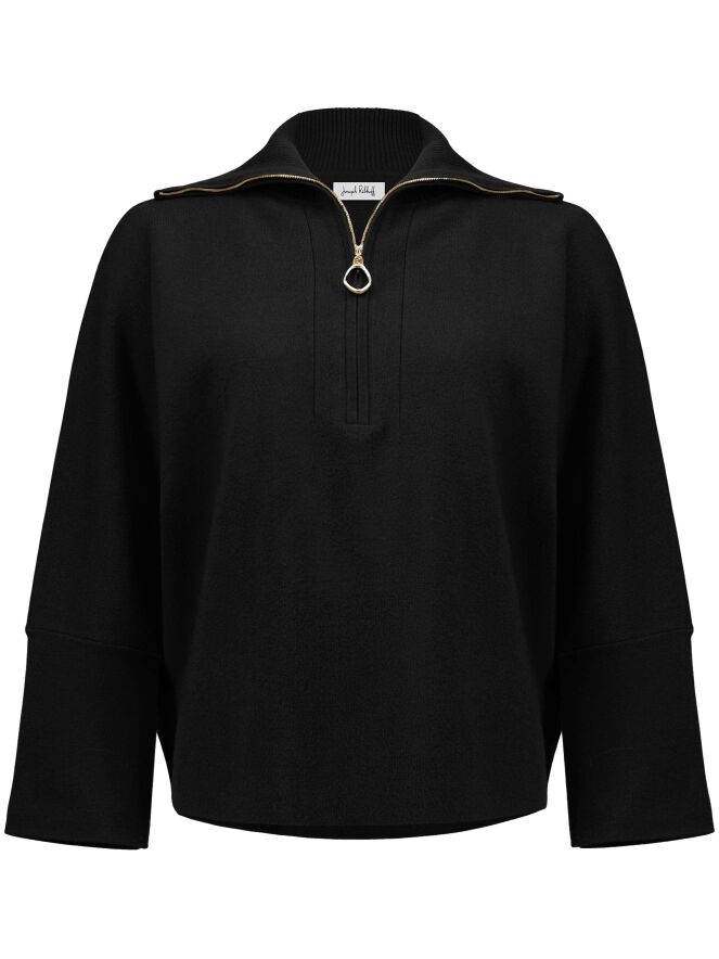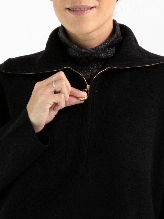 Een pullover van Joseph Ribkoff in de kleur zwart. De vallende col heeft een fijn geribbelde structuur. In het midden van de col loopt een blinde rits tot aan de buste. Deze pullover kan met de hand worden gewassen.