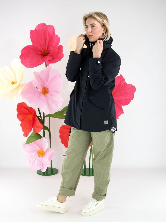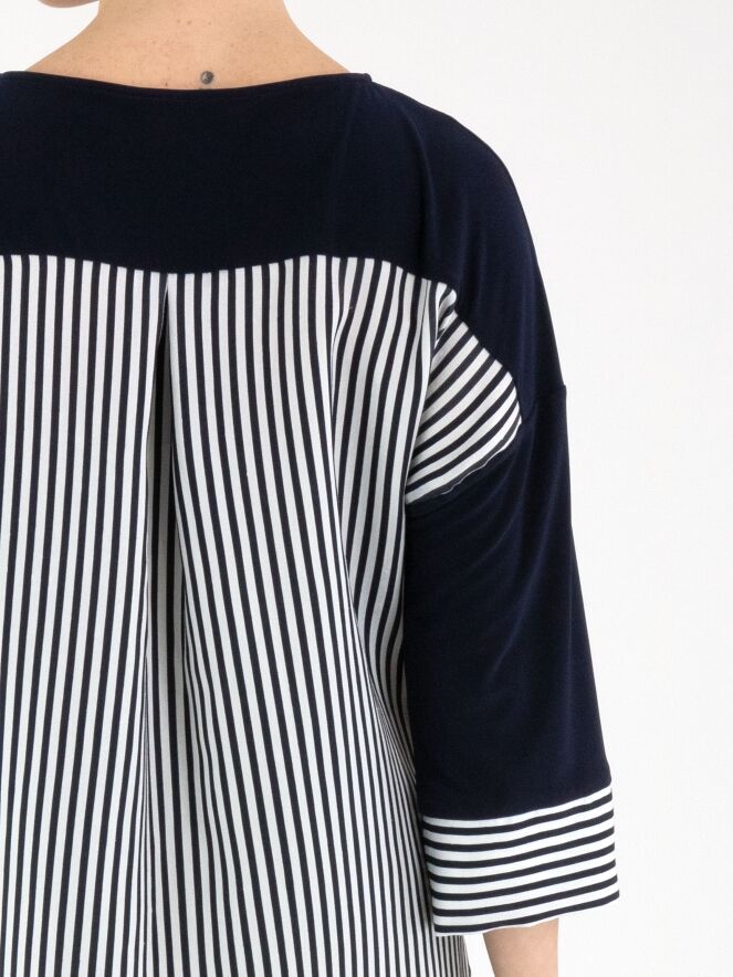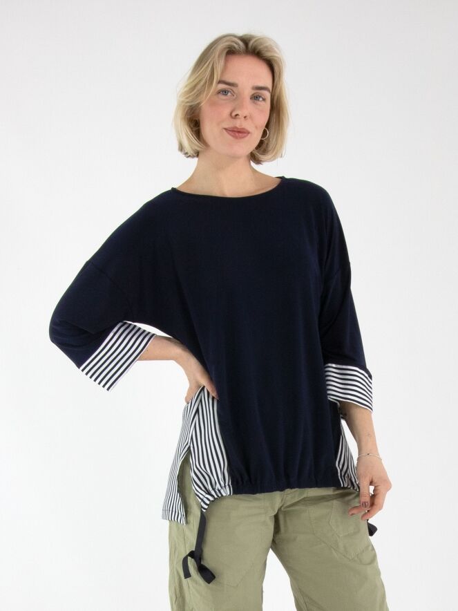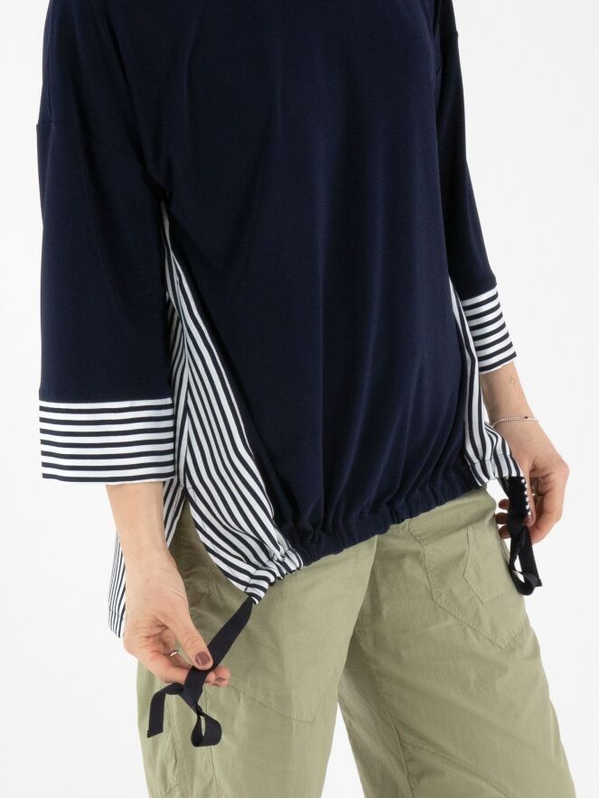 Een shirt van Joseph Ribkoff met aan de voorzijde een uni marineblauwe stof en aan de achterzijde een gestreepte stof in roomwit en marineblauw. De manchetten van de halflange mouwen zijn eveneens uitgevoerd in de gestreepte stof. Langs de onderrand aan de voorzijde is een lint in tunnelverwerking aangebracht, waarmee een plooieffect kan worden gecreëerd. Dit shirt kan met de hand worden gewassen.