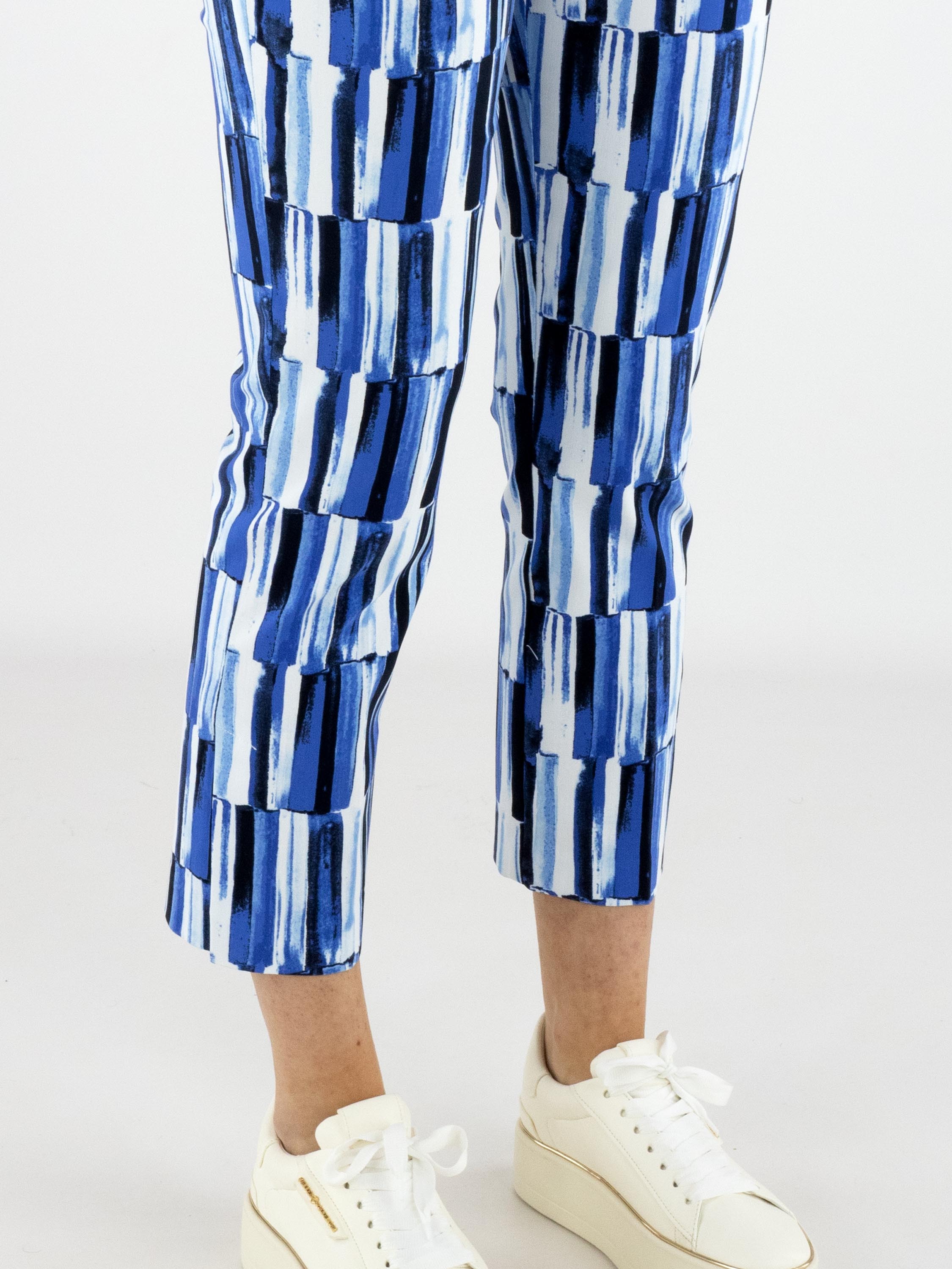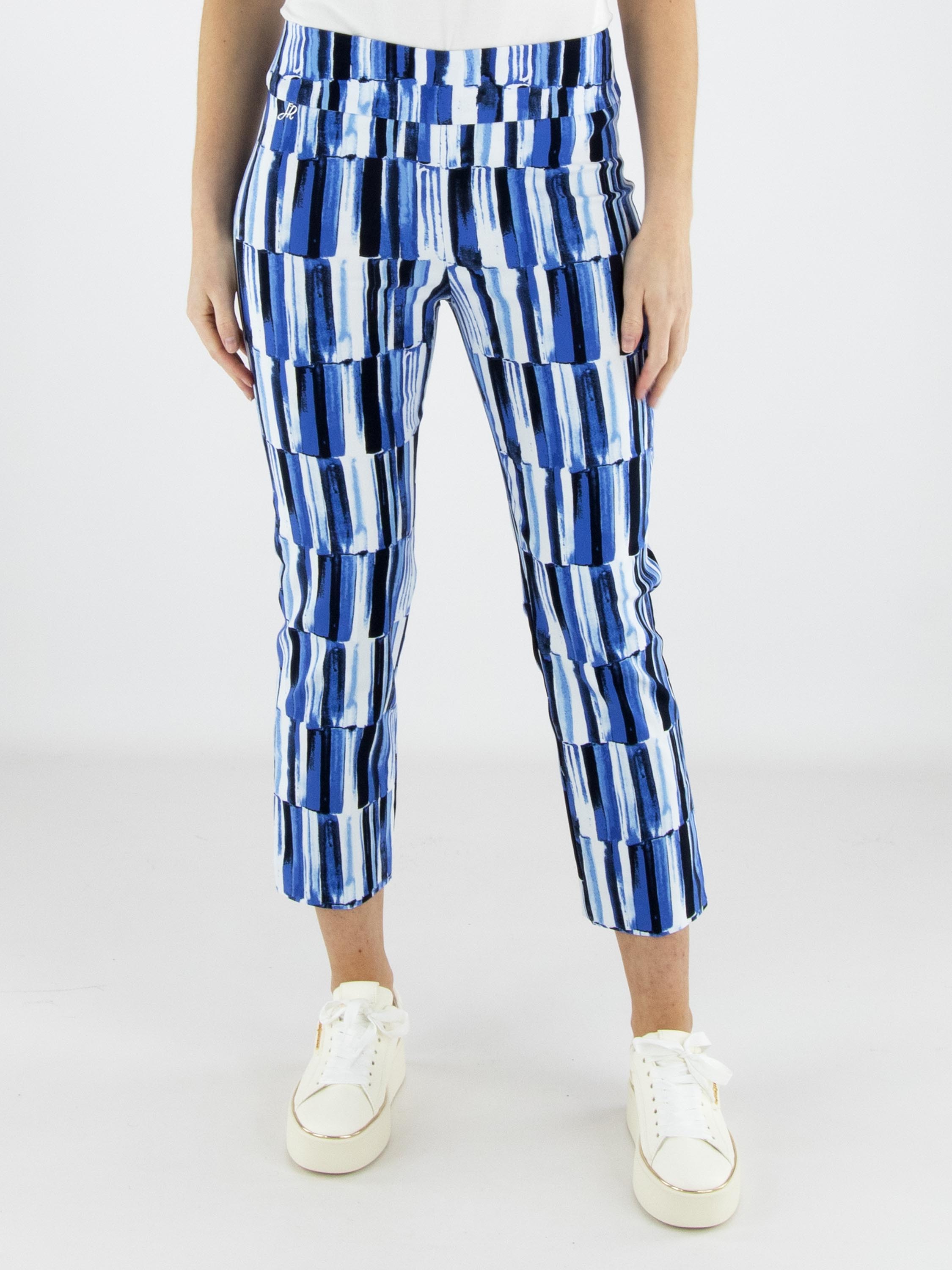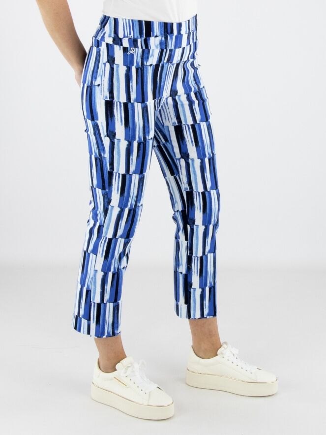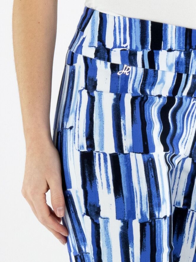 Broek van Joseph Ribkoff in een verfijnde streepjesprint in meerdere tinten blauw met wit. De elastische tailleband zorgt voor een comfortabele en elegante pasvorm. Deze exclusieve designerbroek kan met de hand worden gewassen.