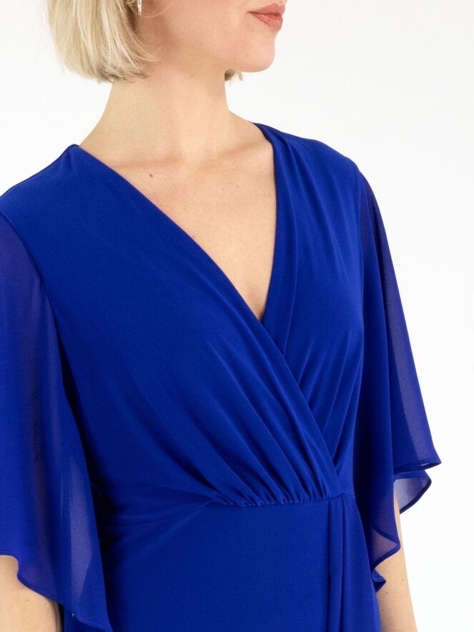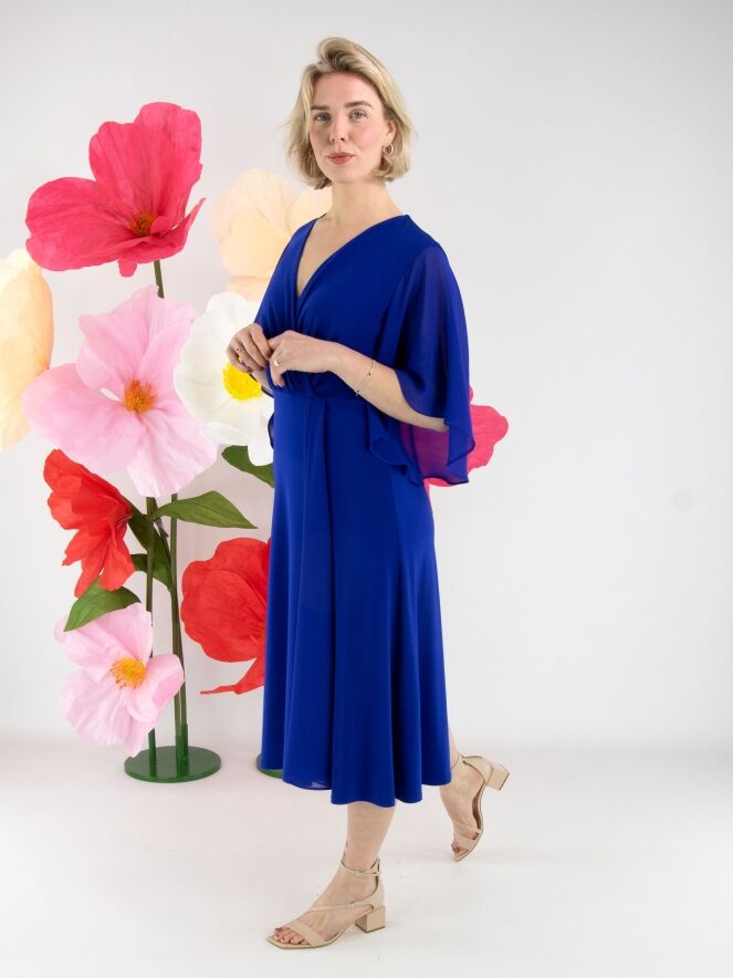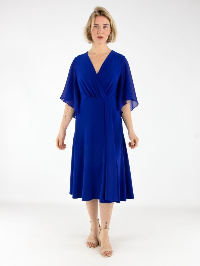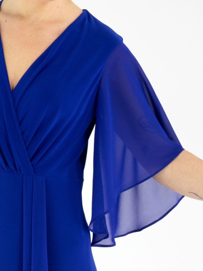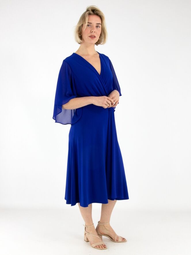 Een overslagjurk van Joseph Ribkoff in een kobaltblauwe kleur. Vanuit de taille is de stof fijn geplooid richting de hals. Aan de linkerzijde van het midden lopen enkele plissés naar beneden. De jurk heeft korte, wijde mouwen van voile. Deze jurk kan met de hand worden gewassen.