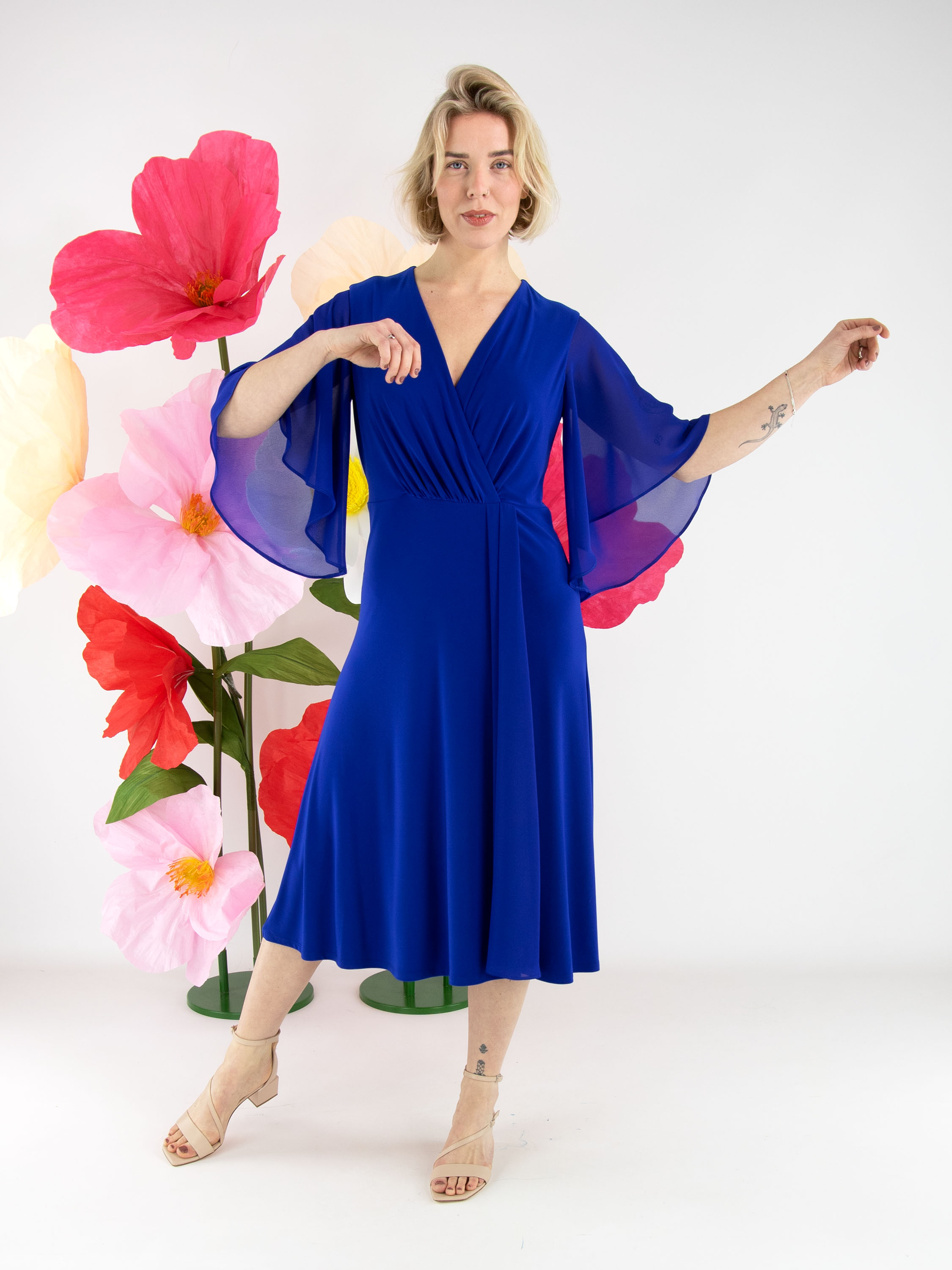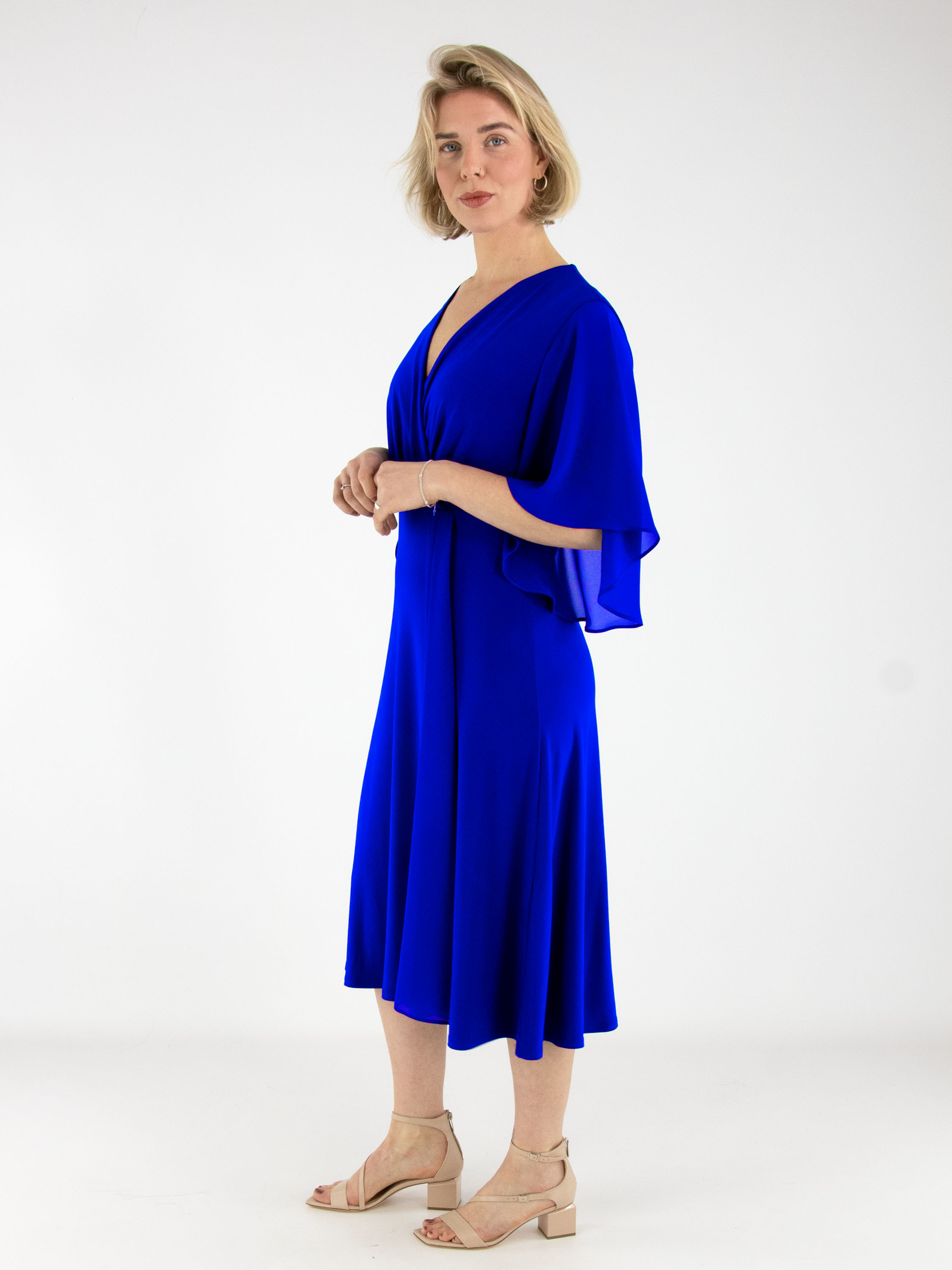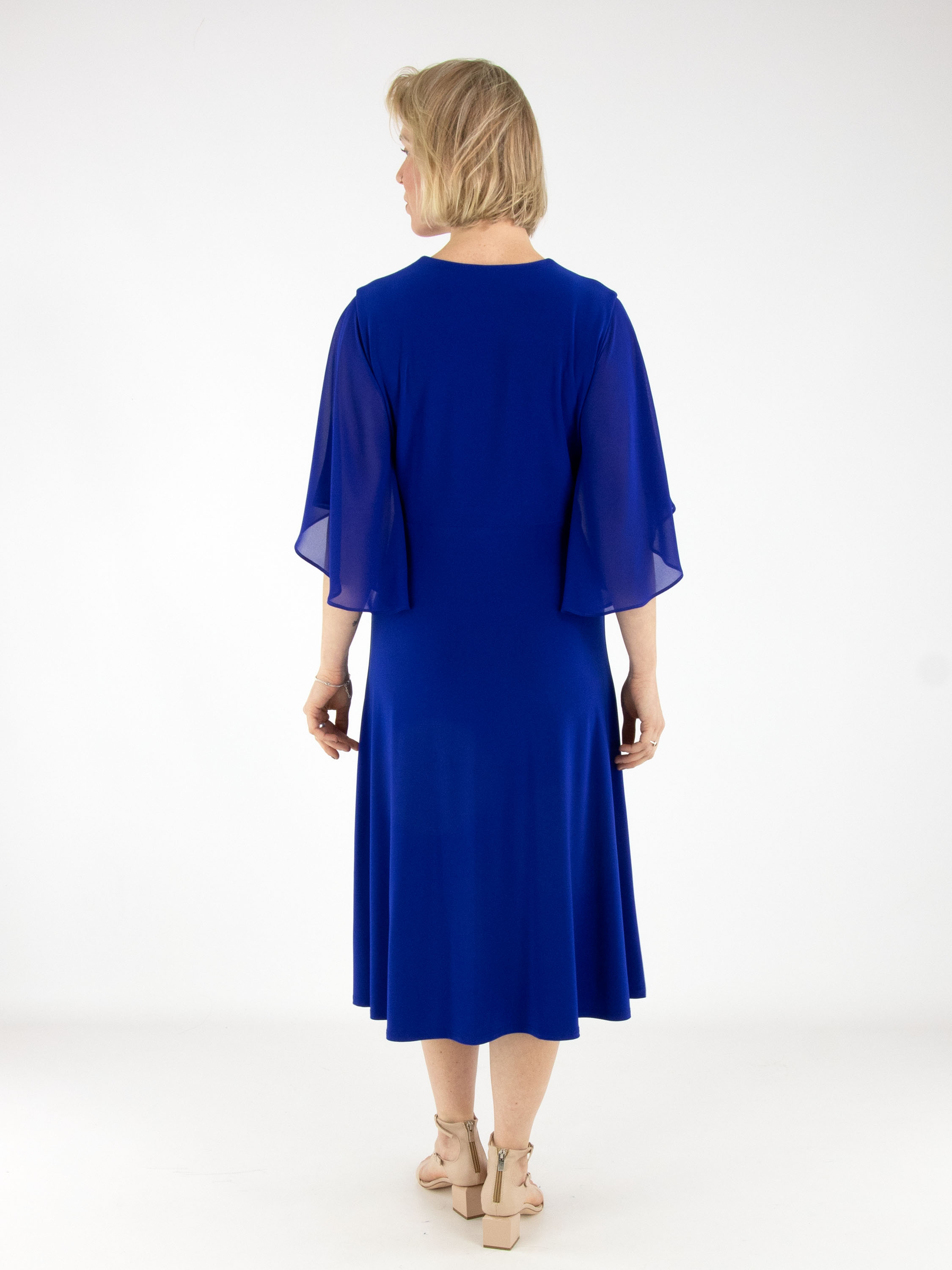Een overslagjurk van Joseph Ribkoff in een kobaltblauwe kleur. Vanuit de taille is de stof fijn geplooid richting de hals. Aan de linkerzijde van het midden lopen enkele plissés naar beneden. De jurk heeft korte, wijde mouwen van voile. Deze jurk kan met de hand worden gewassen.