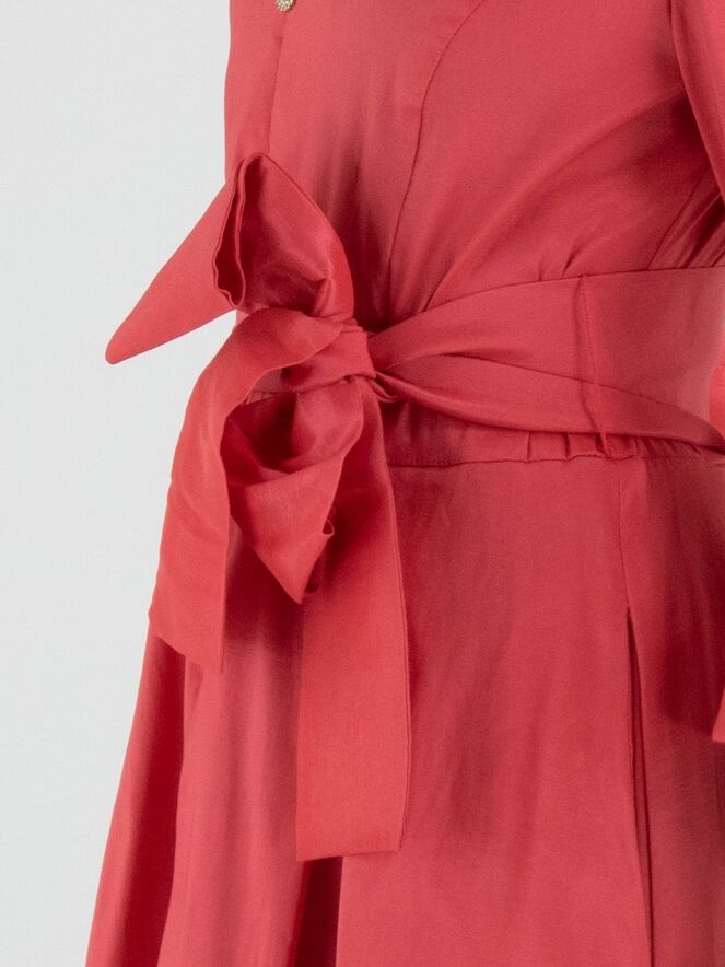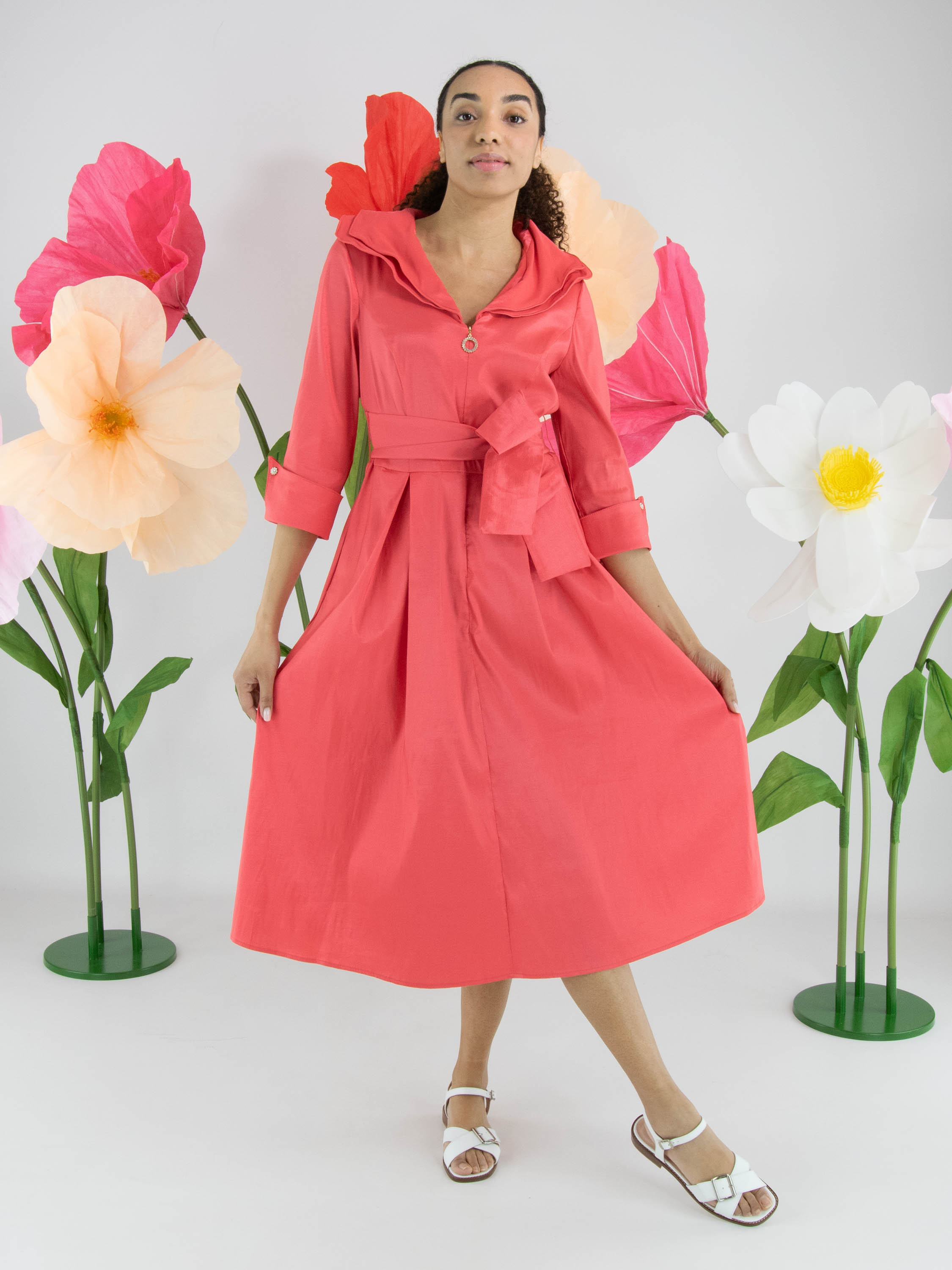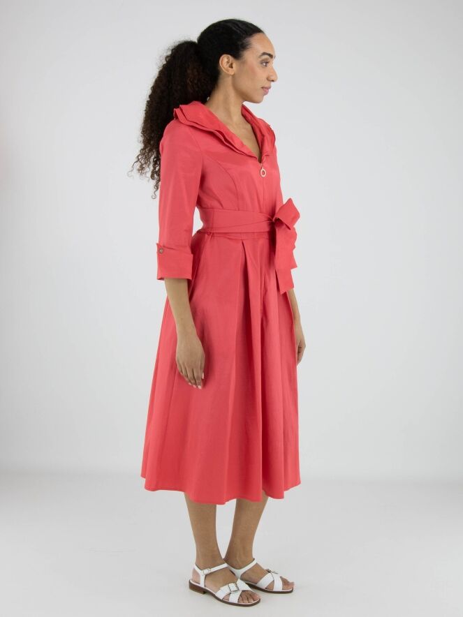 Jurk van Joseph Ribkoff in een matte satijnen stof in een krachtige koraalrode tint. In de rand van de dubbele kraag is een buigzame draad verwerkt, waarmee de kraag in elke gewenste vorm kan worden gemodelleerd voor een uitgesproken en persoonlijke uitstraling. De halflange mouwen zijn afgewerkt met een brede manchetomslag en een knoopsluiting met imitatie diamantjes, wat zorgt voor een verfijnd en luxueus detail. In de taille bevindt zich een brede ceintuur waarmee een decoratieve strik kan worden gemaakt. Meerdere plissés in de taille creëren een elegant golvend effect richting de zoom. Deze exclusieve designerjurk kan met de hand worden gewassen.