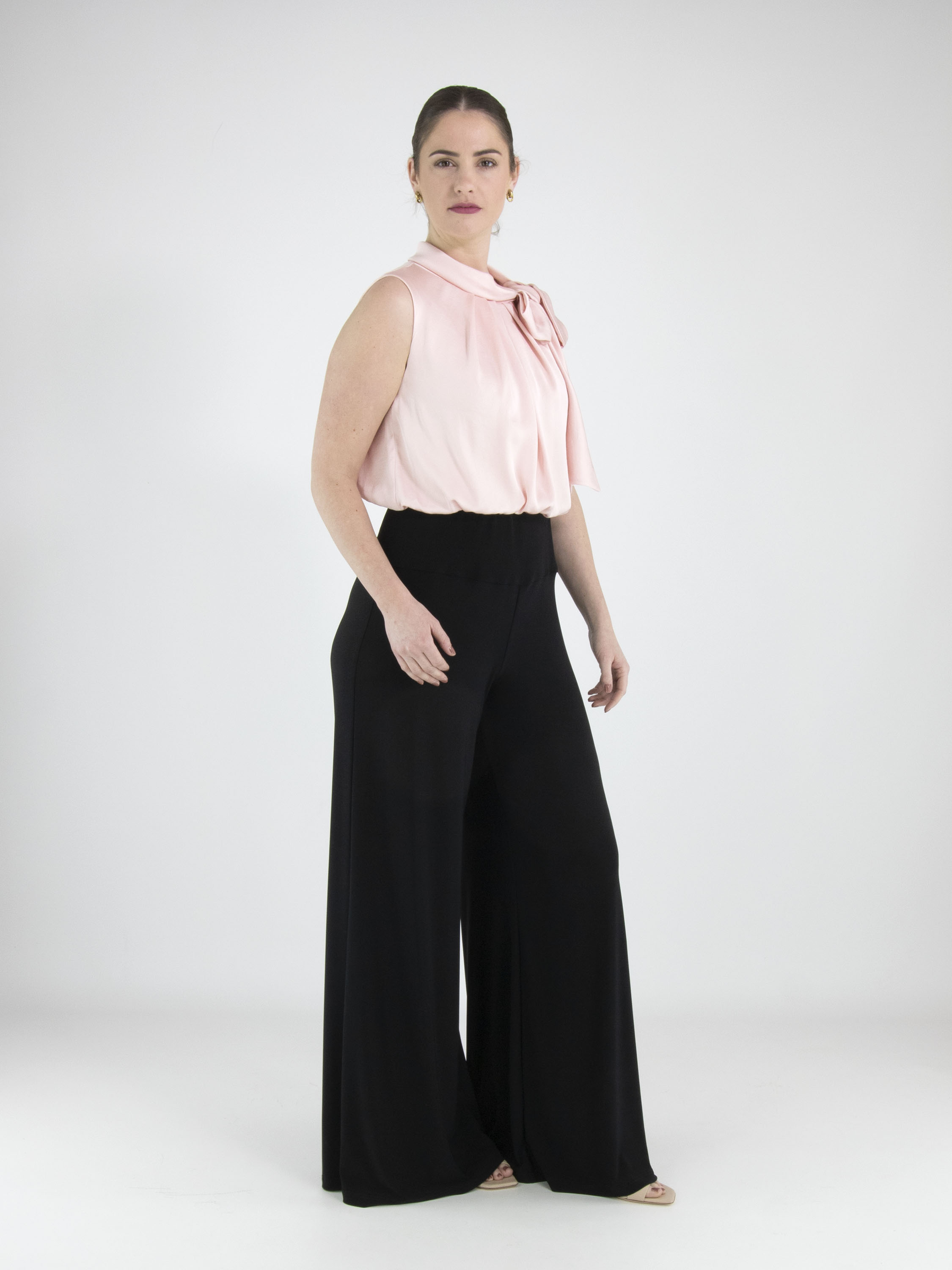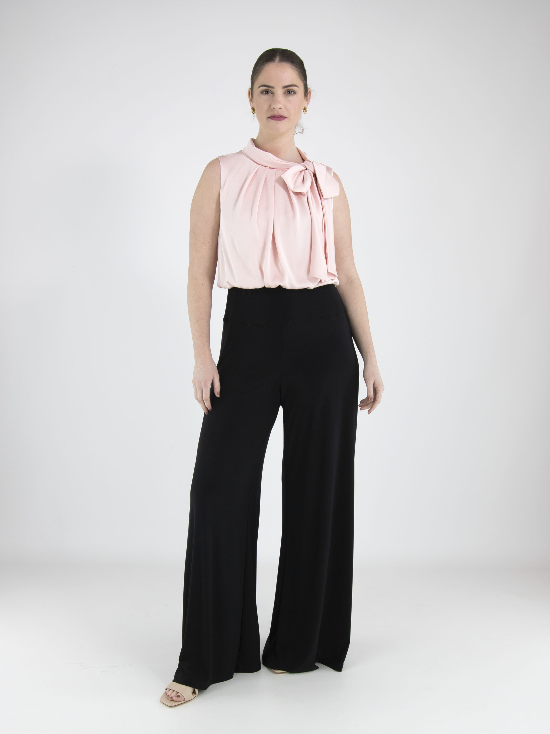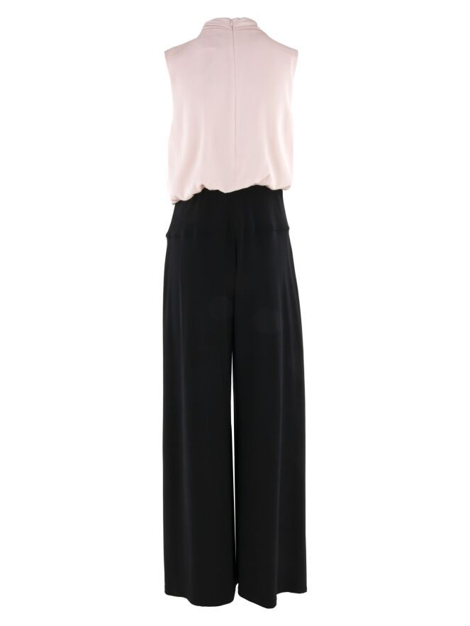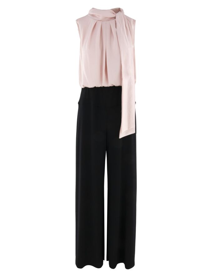 Een jumpsuit van Joseph Ribkoff in de kleuren roze en zwart. Het bovenste deel vanaf de taille is uitgevoerd in een roze matte satijnen stof. Vanuit de halslijn loopt de stof aan de linkerzijde door als een lint, waarmee een decoratieve strik kan worden gemaakt. In het midden van de ronde hals zijn aan de voorzijde enkele plissés verwerkt. De roze stof valt gedrapeerd over de taille, waar een brede tailleband is aangebracht. Het broekgedeelte is uitgevoerd in een zwarte uni stof en heeft wijde pijpen. Deze jumpsuit kan met de hand worden gewassen.