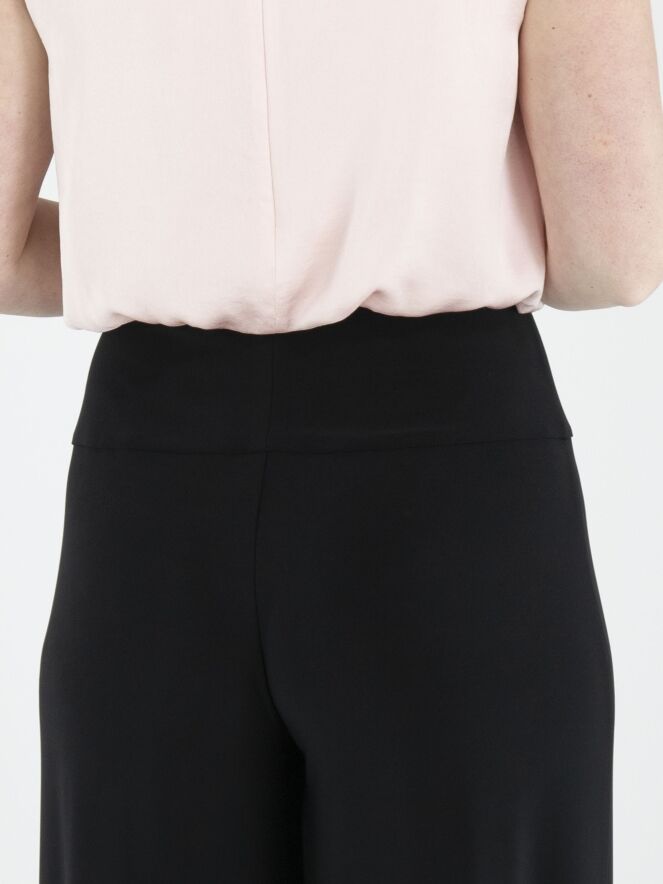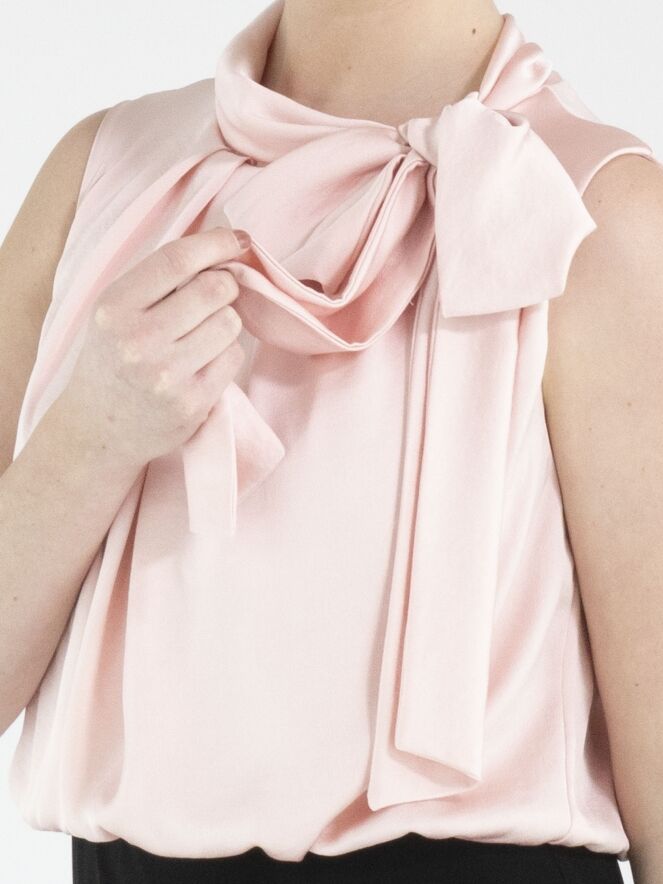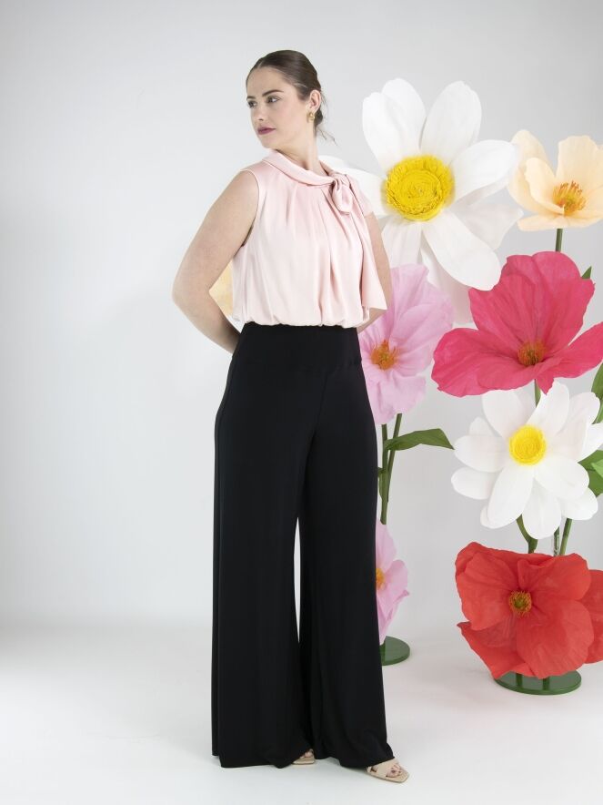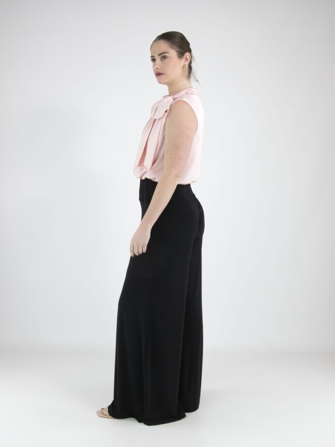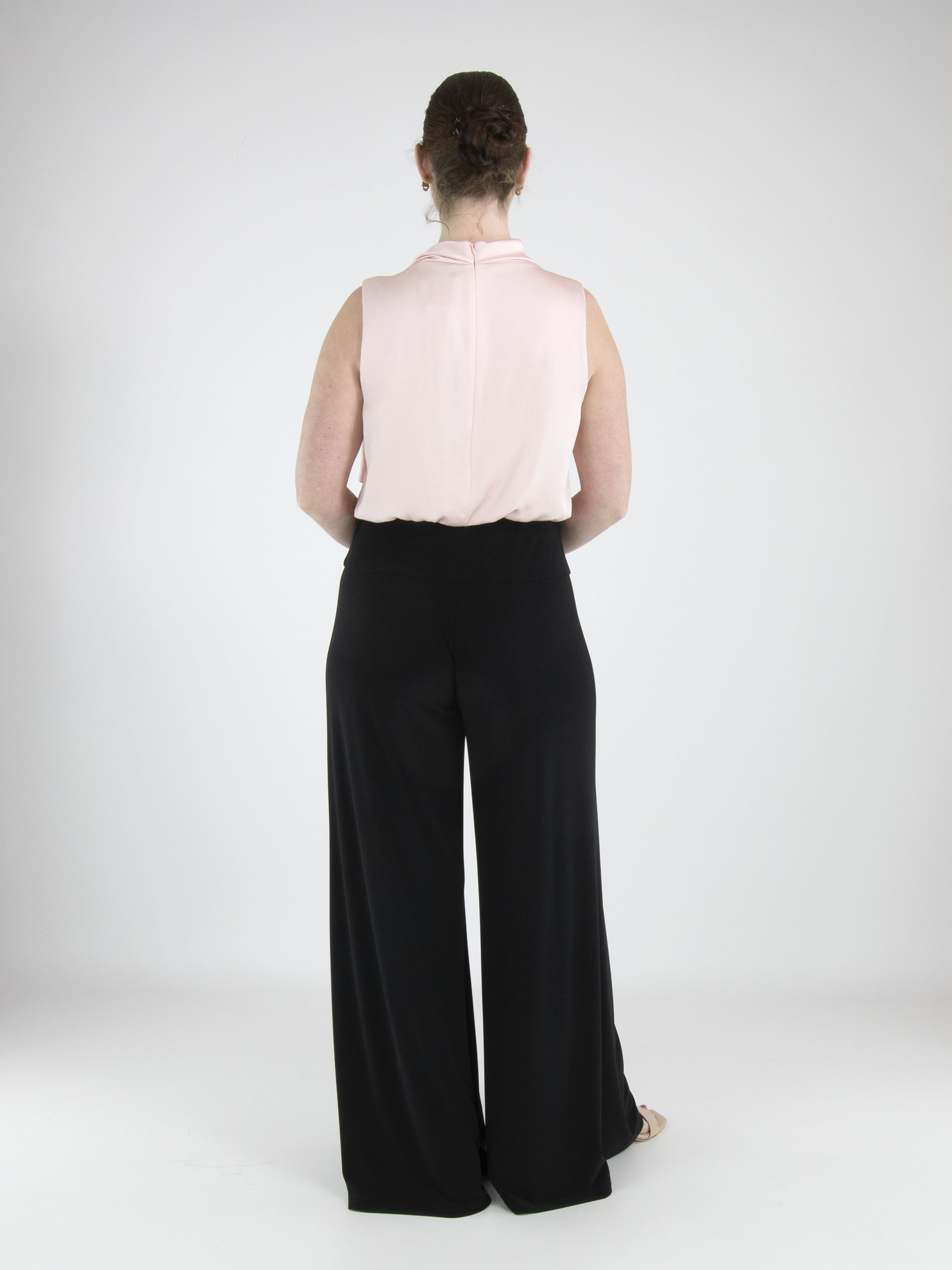 Een jumpsuit van Joseph Ribkoff in de kleuren roze en zwart. Het bovenste deel vanaf de taille is uitgevoerd in een roze matte satijnen stof. Vanuit de halslijn loopt de stof aan de linkerzijde door als een lint, waarmee een decoratieve strik kan worden gemaakt. In het midden van de ronde hals zijn aan de voorzijde enkele plissés verwerkt. De roze stof valt gedrapeerd over de taille, waar een brede tailleband is aangebracht. Het broekgedeelte is uitgevoerd in een zwarte uni stof en heeft wijde pijpen. Deze jumpsuit kan met de hand worden gewassen.