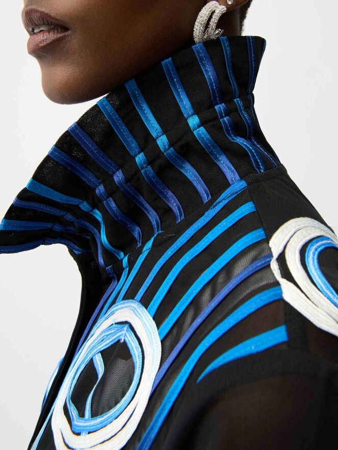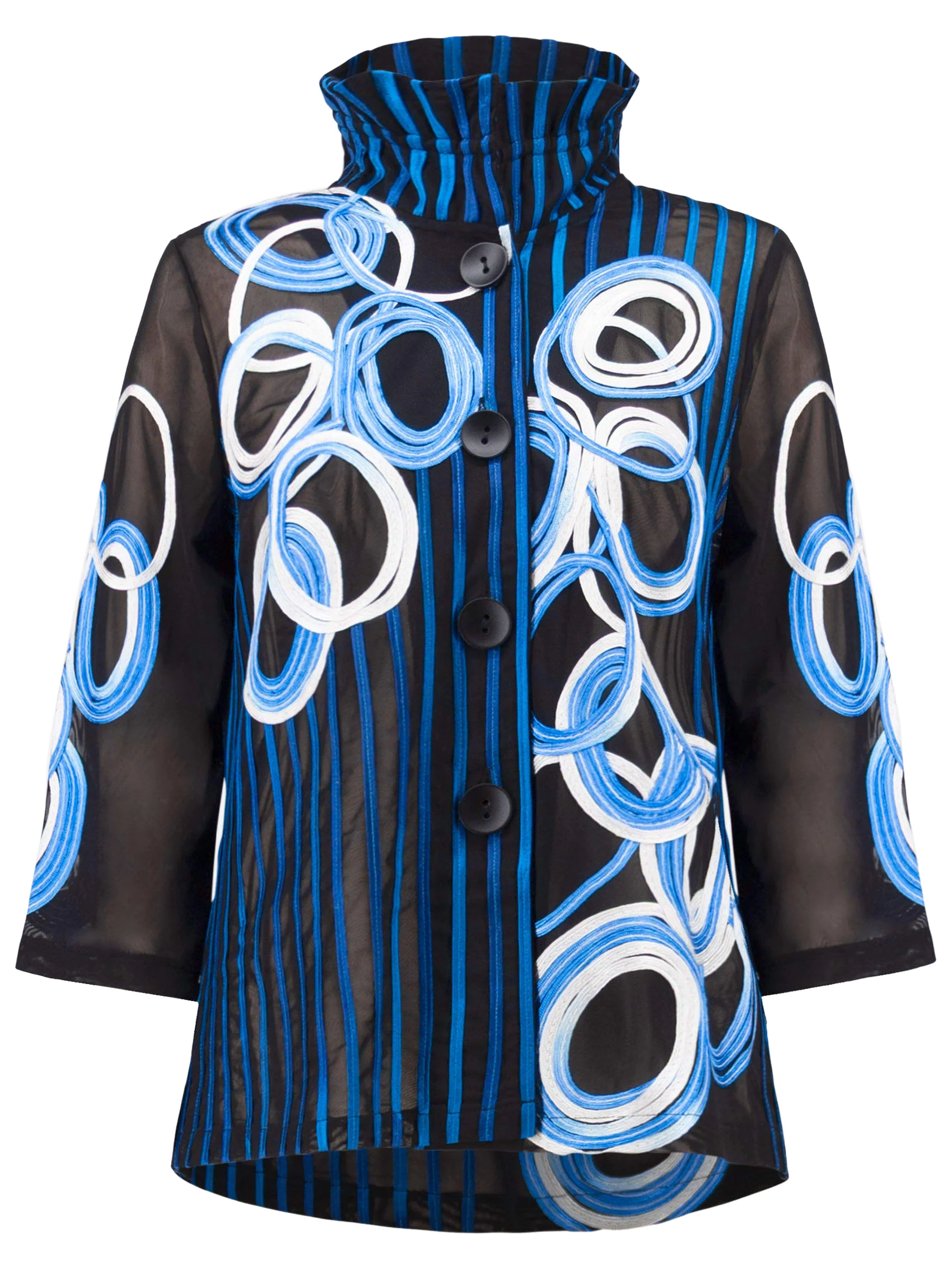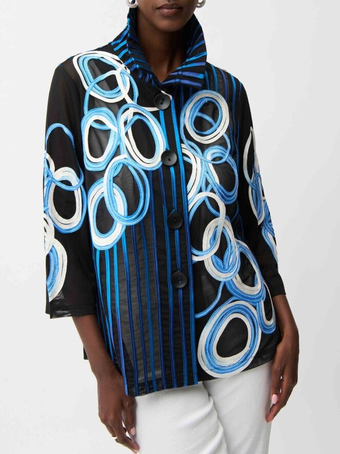 Een licht transparante blazer van Joseph Ribkoff met een dessin van verticale lijnen en cirkelvormige lijnen in meerdere tinten blauw en wit op een zwarte achtergrond. De blazer heeft een sluiting met twee knopen en halflange mouwen. Deze blazer kan met de hand worden gewassen.